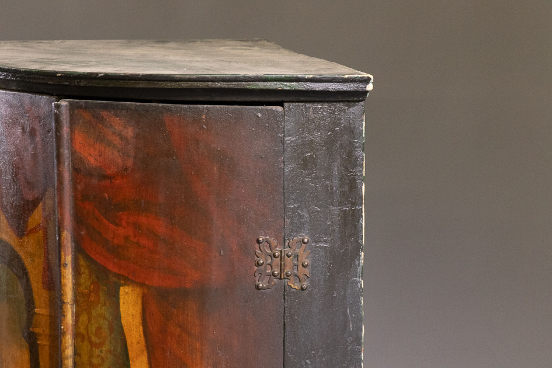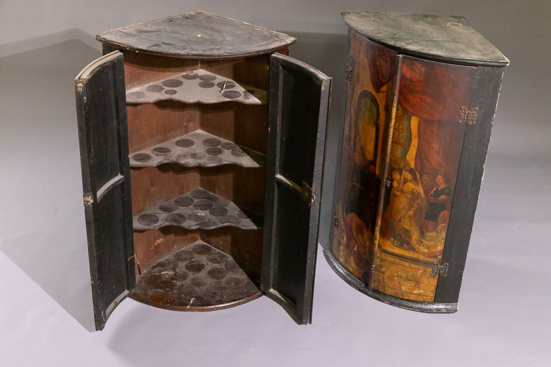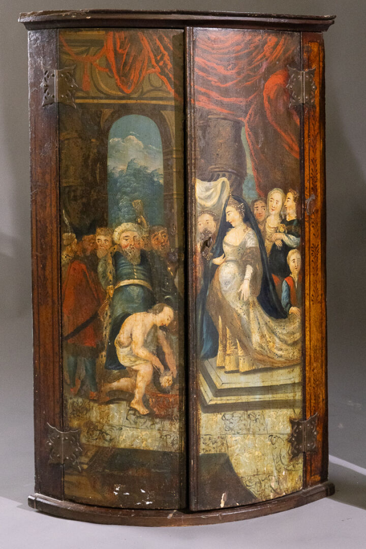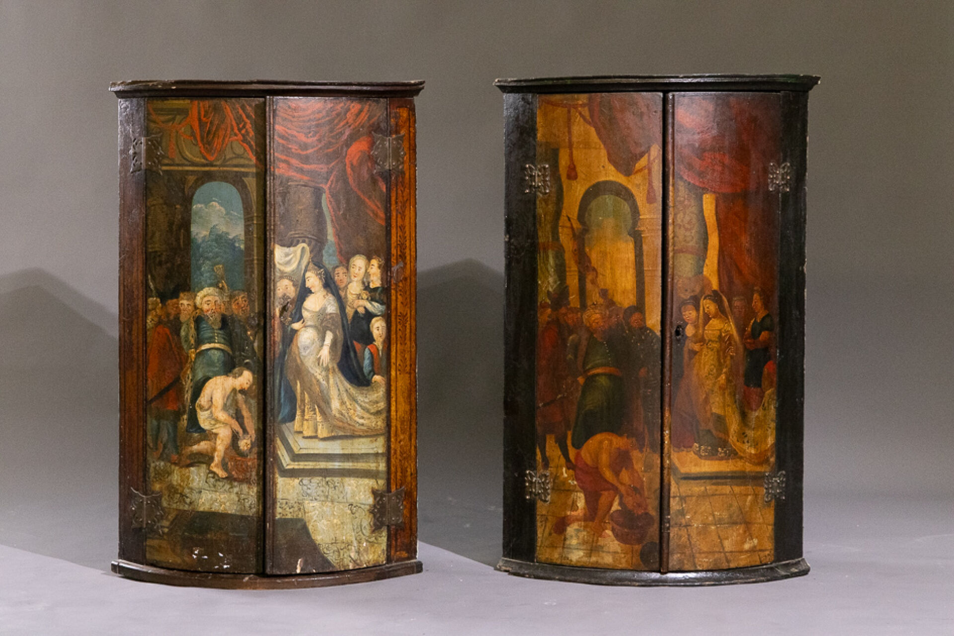 Paire d'encoignures d'appliques, de forme demi-lune en bois à décor peint de la décollation de Saint Jean-Baptiste, ouvrant à deux vantaux. Travail hollandais du XIXe siècle pour l'une, la seconde postérieure (usures et accidents). Haut. : 92 cm - Larg. : 60 cm - prof. : 40 cm. Expertise réalisée par Monsieur Cédric HENON - CABINET AUTHENTICITE