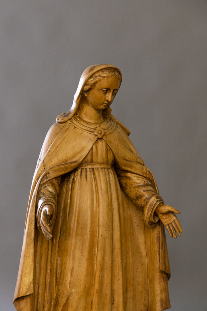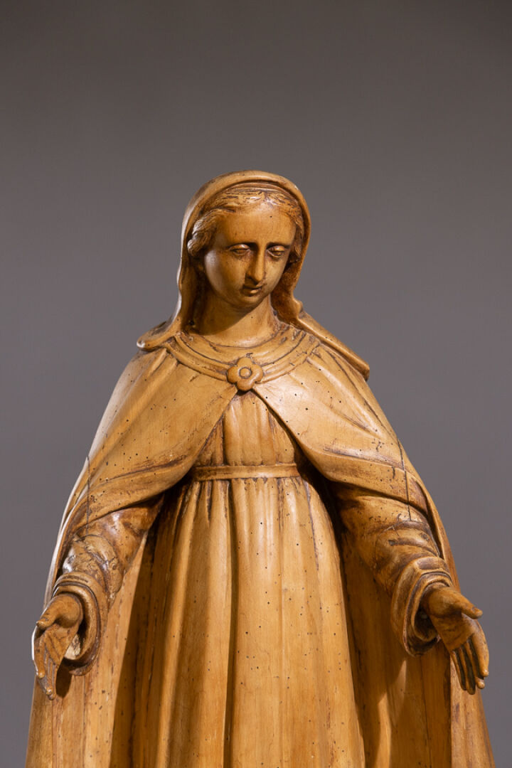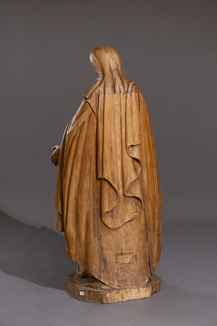 Vierge de l'Immaculée Conception en bois naturel sculpté, le dos évidé et refermé (petites vermoulures, trous de vers, accidents). XVIIIe siècle. Haut. : 105 cm Expertise réalisée par Benoit BERTRAND.