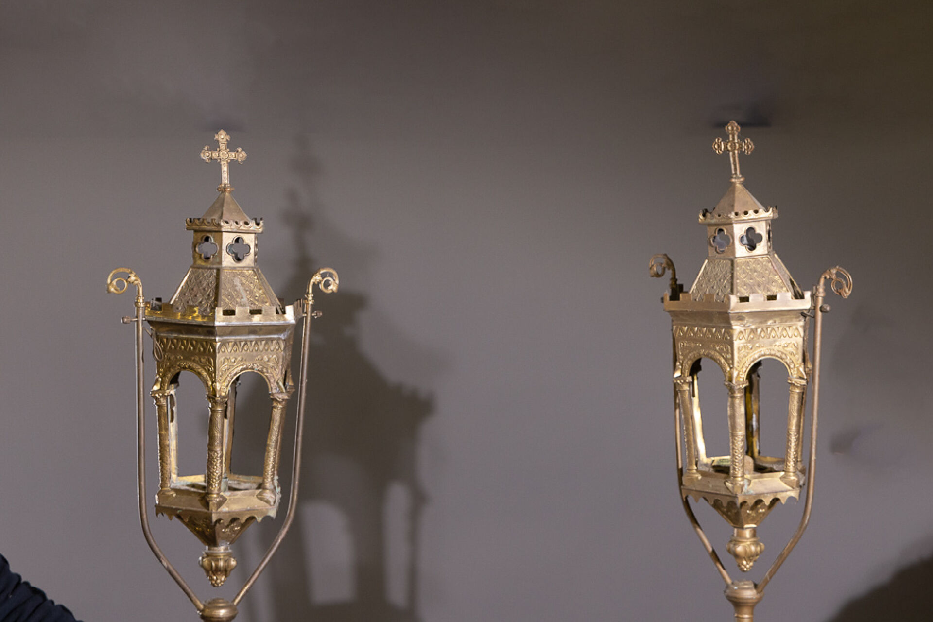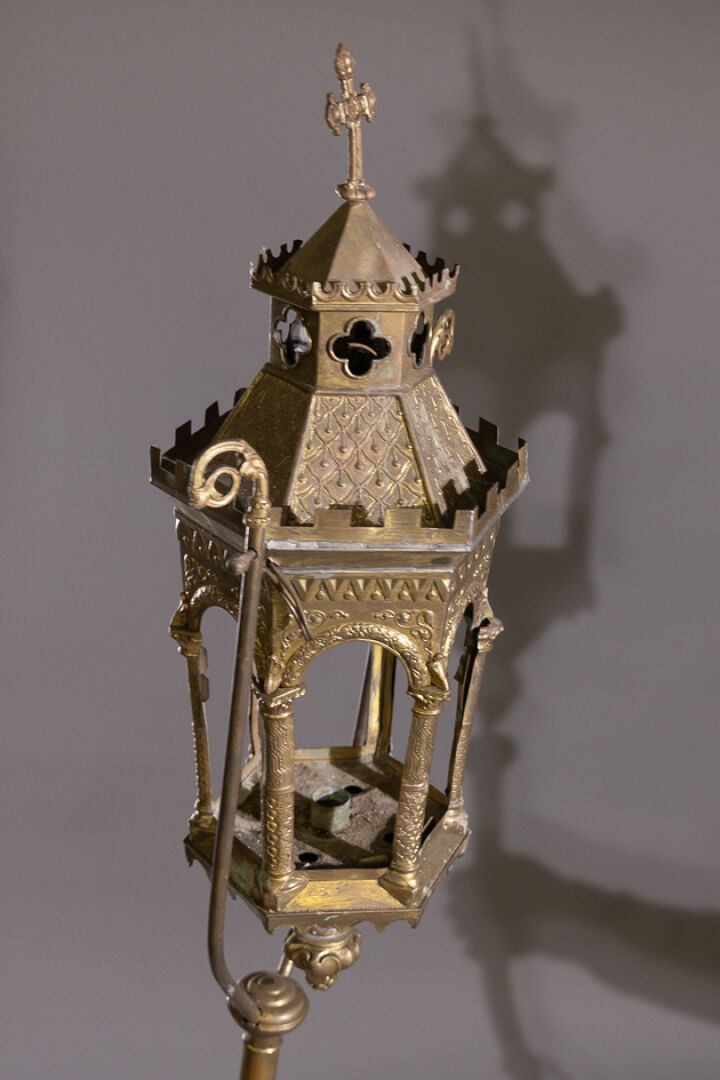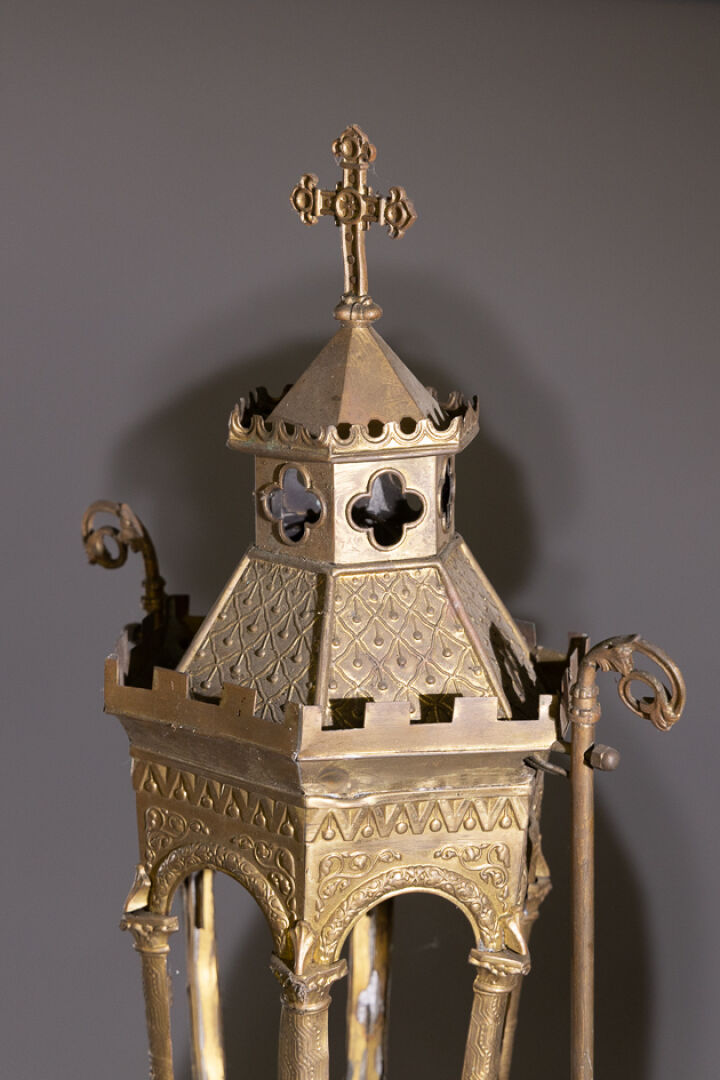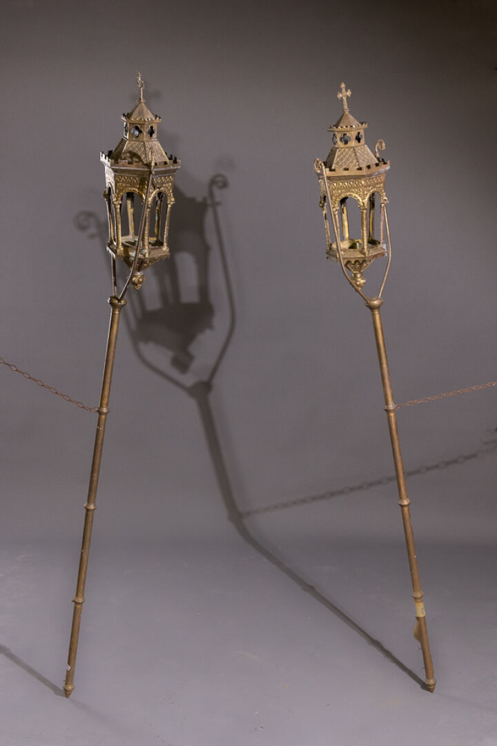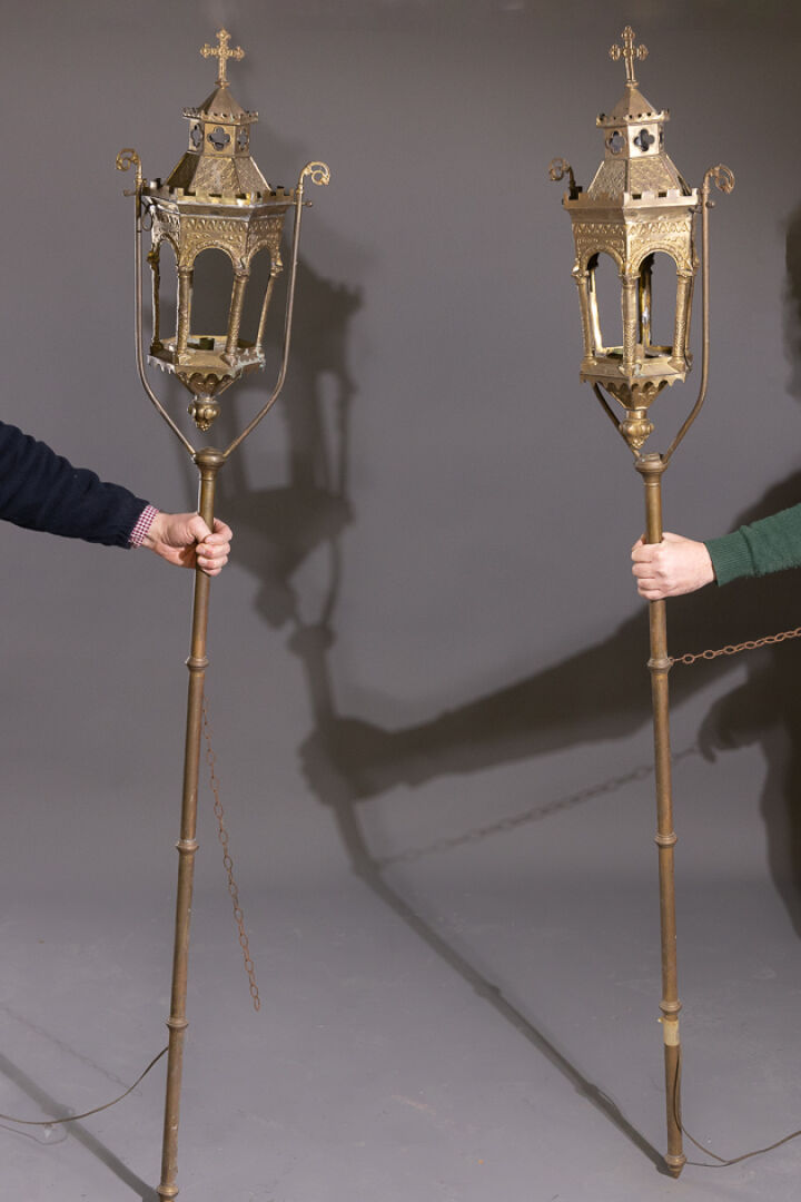 Paire de lanternes de procession en métal partiellement doré, les lanternons en dais architecturés hexagonaux, surmontés d'une Croix (usures, accidents et chocs). Montées à l'électricité. Vers 1900. Haut. : 202 cm