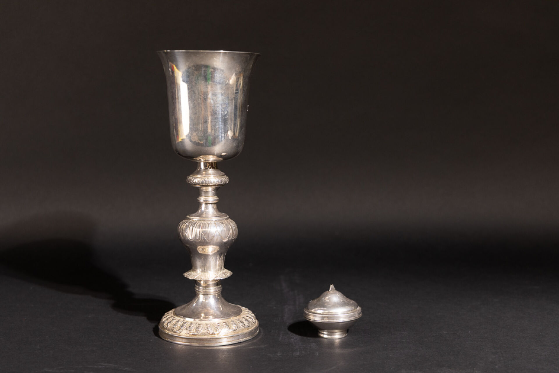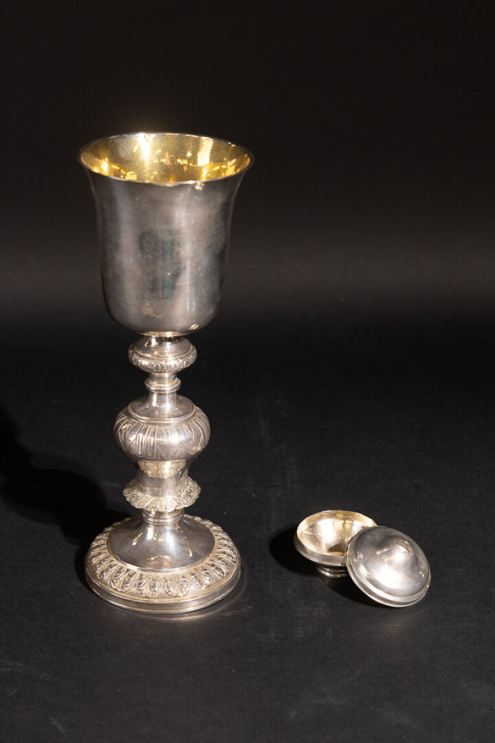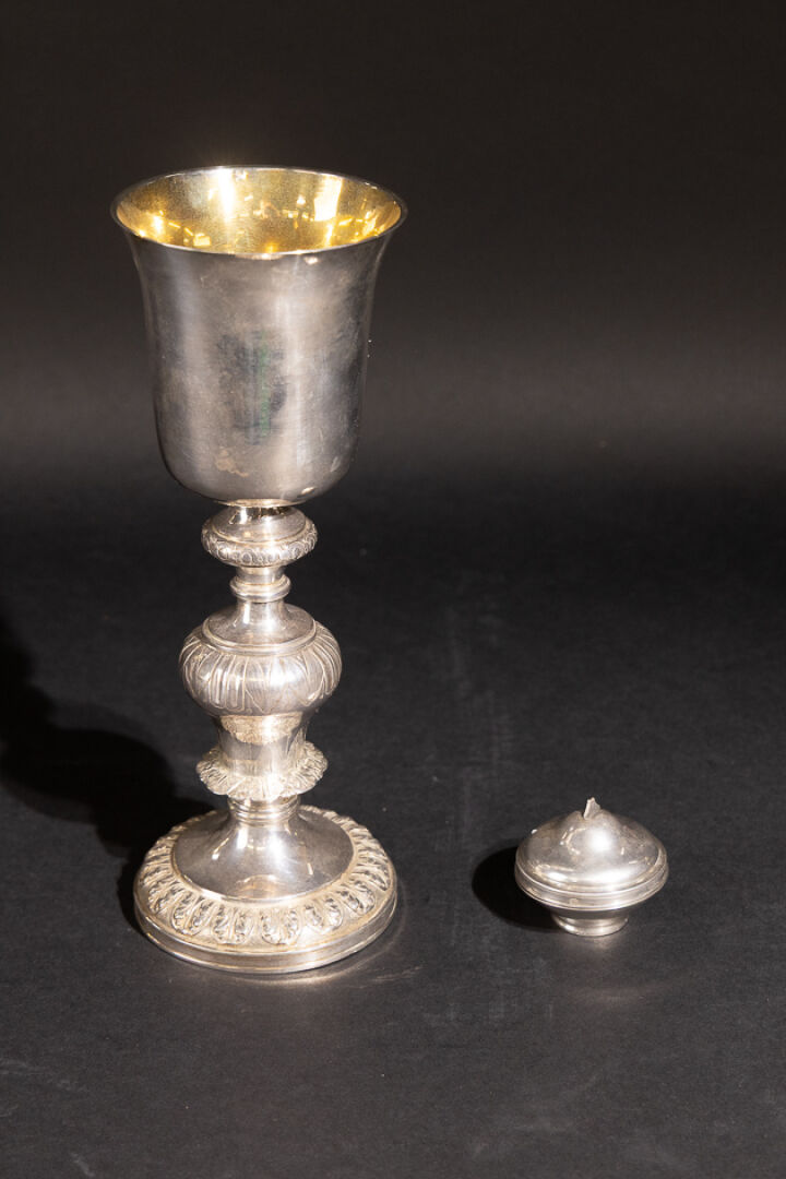 Calice en argent ciselé de feuilles lancéolées, acanthes stylisées, entrelacs, filets, le buvant évasé à l'intérieur vermeil, le pied circulaire, la jambe à nœuds. Poinçon Minerve. Hauteur : 24 cm - Poids : 338.10 g On joint : Custode en argent à panse aplatie (la croix cassée). Poinçon Minerve, poinçon d'orfèvre en partie effacé. Diam. : 4 cm - Poids : 38.20 g