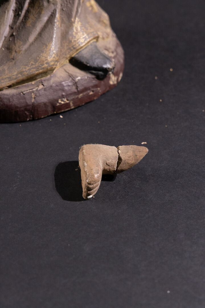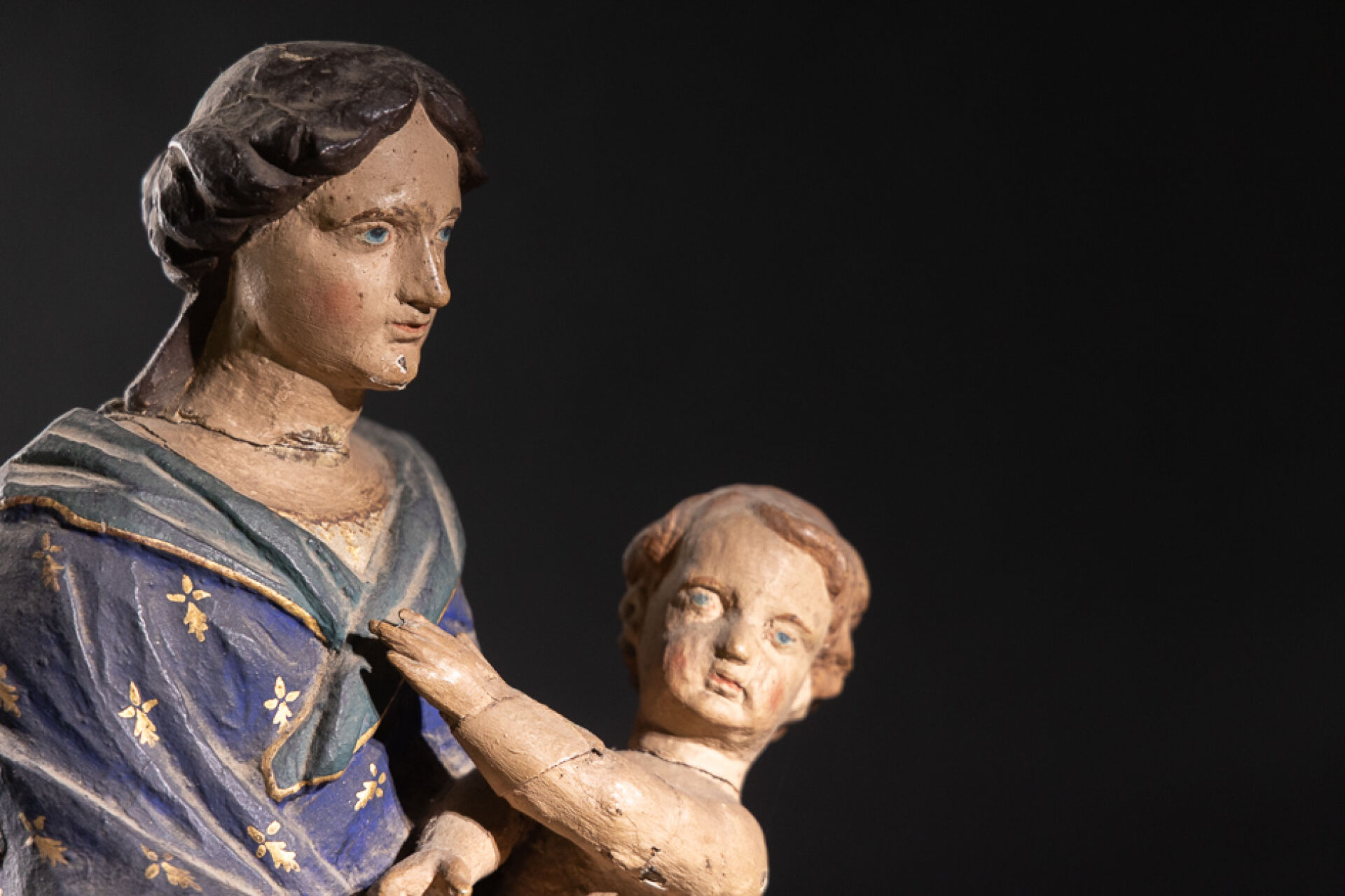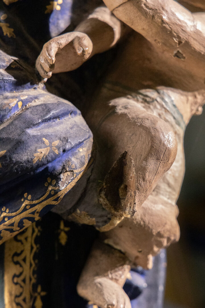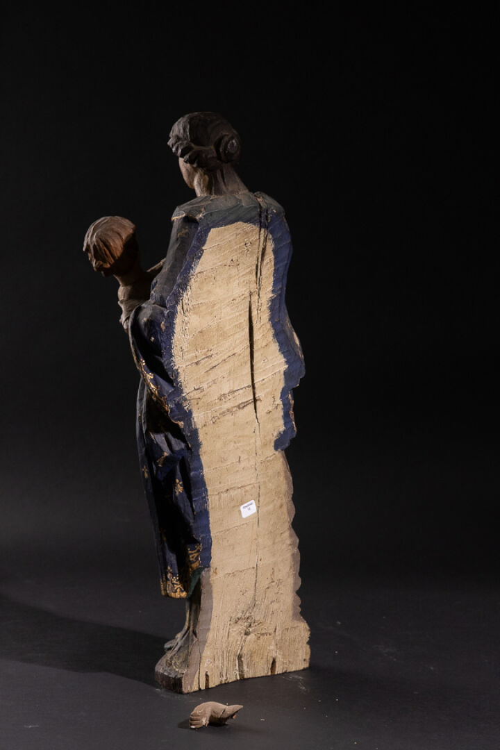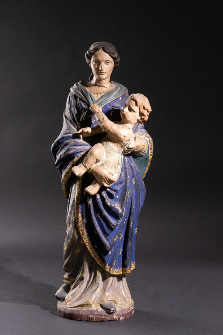 Sainte Vierge à l'Enfant en bois sculpté polychrome, debout et vêtue d'un manteau aux hermines et aux fleurs de lys (accidents, manques et restaurations). XVIIe siècle. Haut. : 68 cm