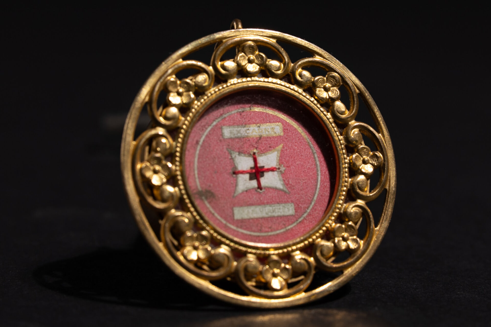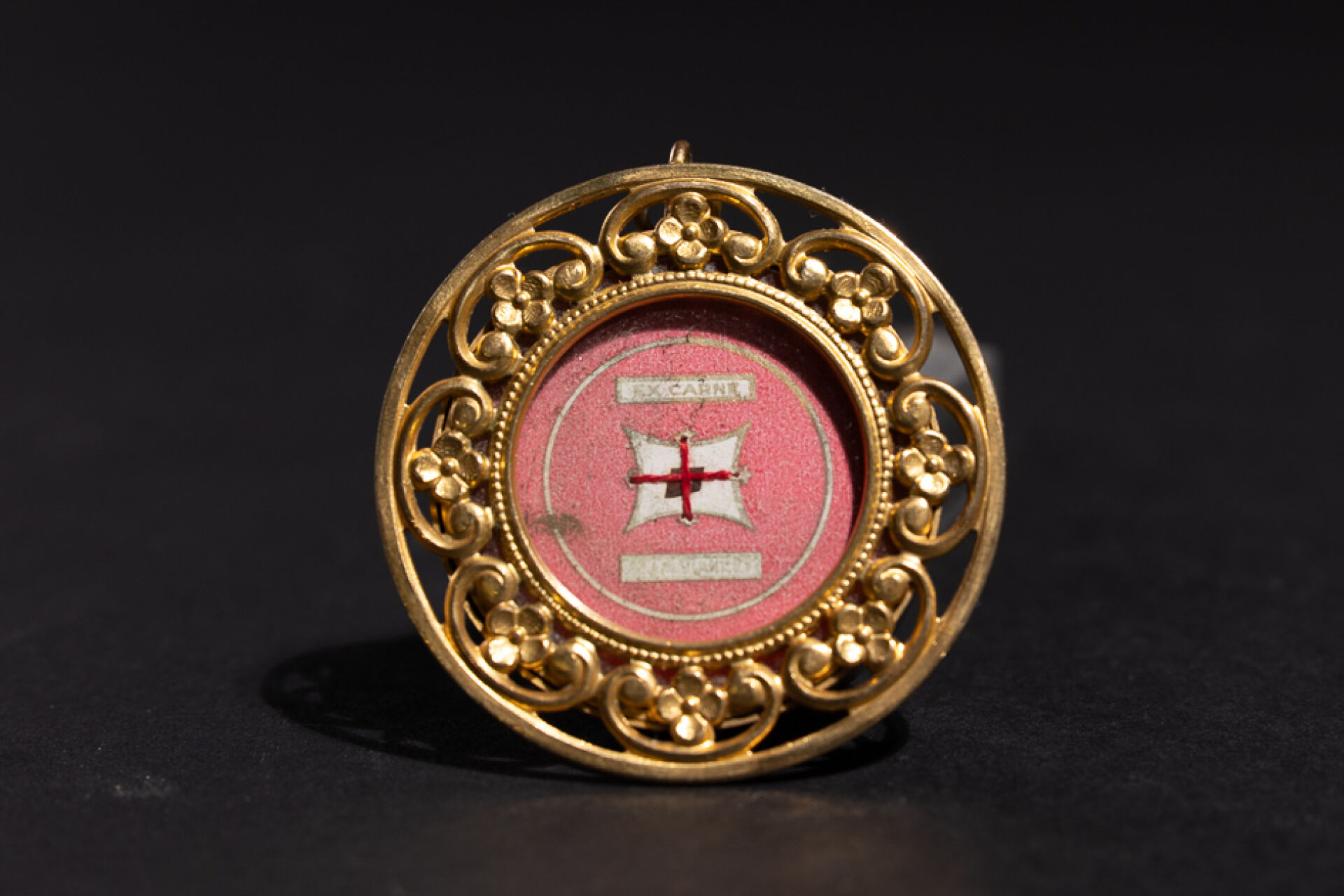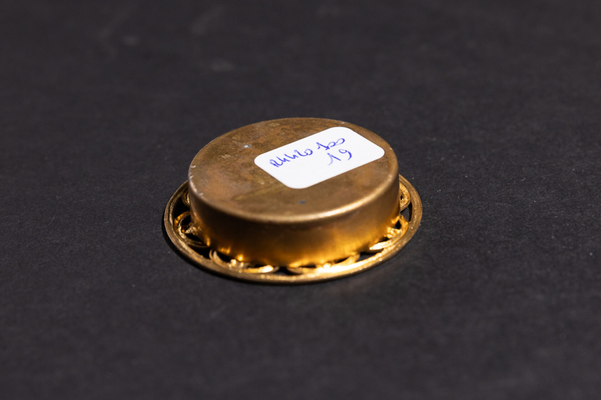 Boîte reliquaire en métal doré, l'entourage à décor de volutes fleuries ajourées. XIXe siècle. Diam. : 5 cm
