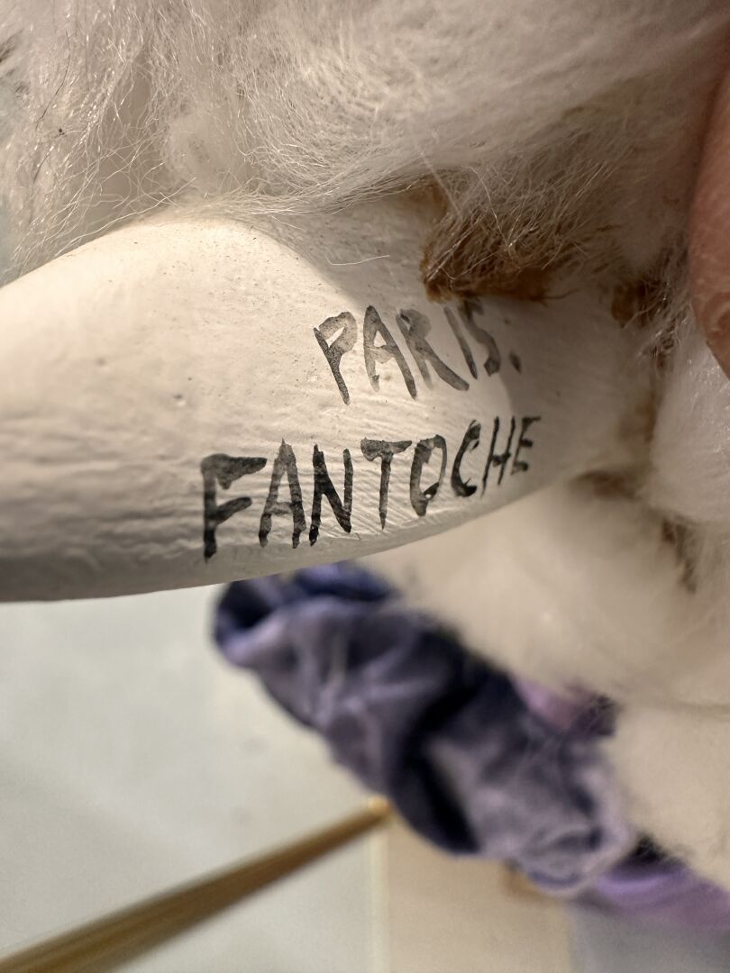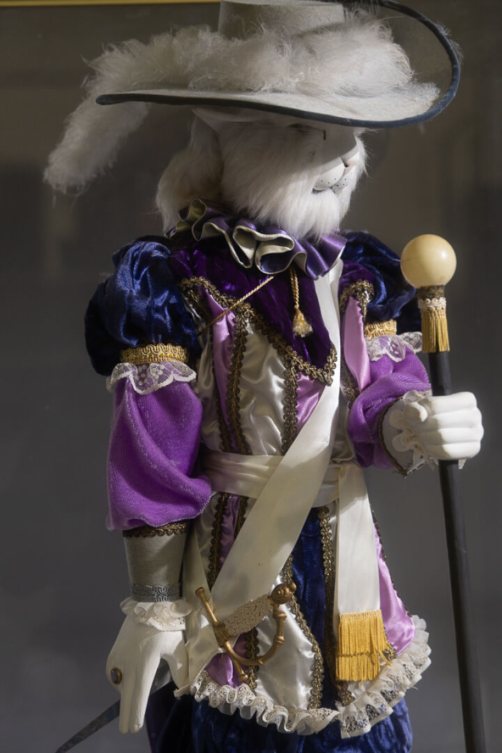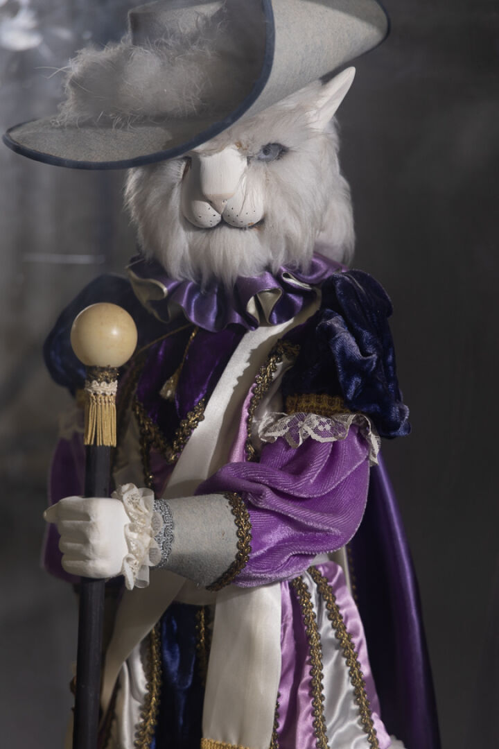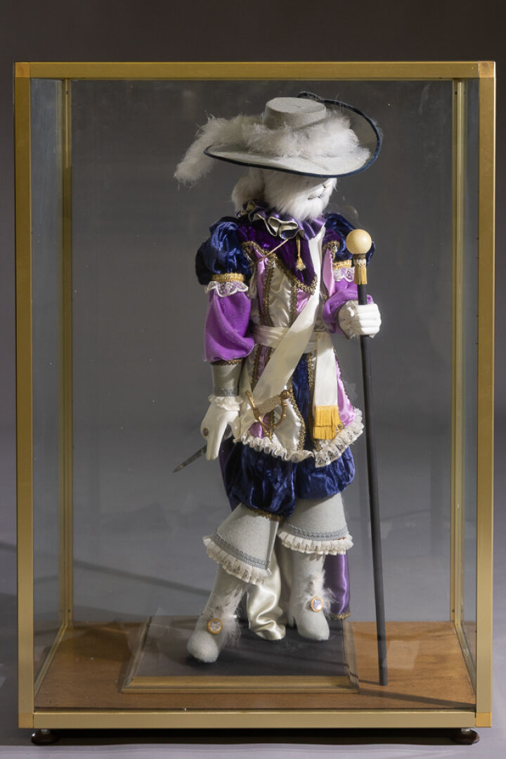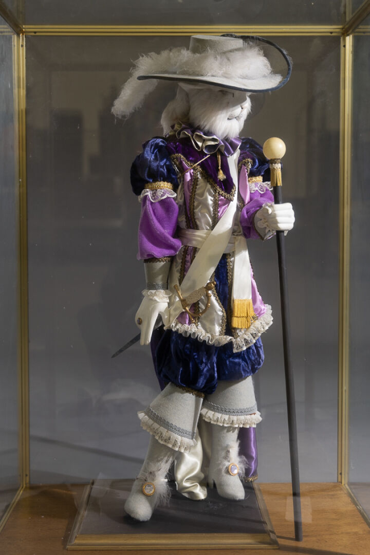 Maison Fantoche à Paris. Le chat botté en Marquis de Carabasse. Statuette en bois peint en costume de la Haute Époque, tenant dans sa main gauche une canne et une épée dans la main droite. Porte l'inscription sur l'oreille « Paris Fantoche ». Présenté soclé dans une vitrine à montants de laiton doré. XXe siècle. Dim. chat : Haut. : 83 cm - Dim. de la vitrine : Haut. : 94 cm - Long. : 65 cm - Prof. : 45 cm Fantoche de l'italien "Fantoccio" : c'est un pantin de bois animé par la sorcière Strega à Sienne, qui acquiert la capacité de parler, penser et ressentir, devenant bien plus qu'une simple marionnette. Expertise réalisée par Monsieur Stanislas LEMOINE.