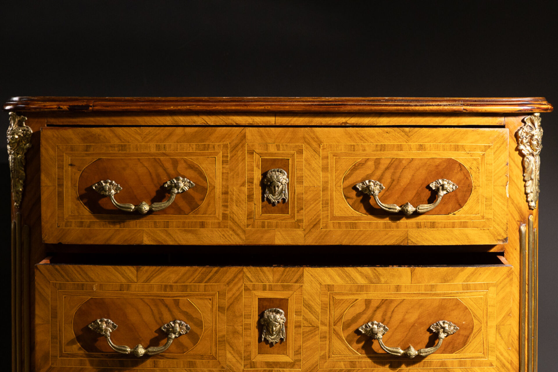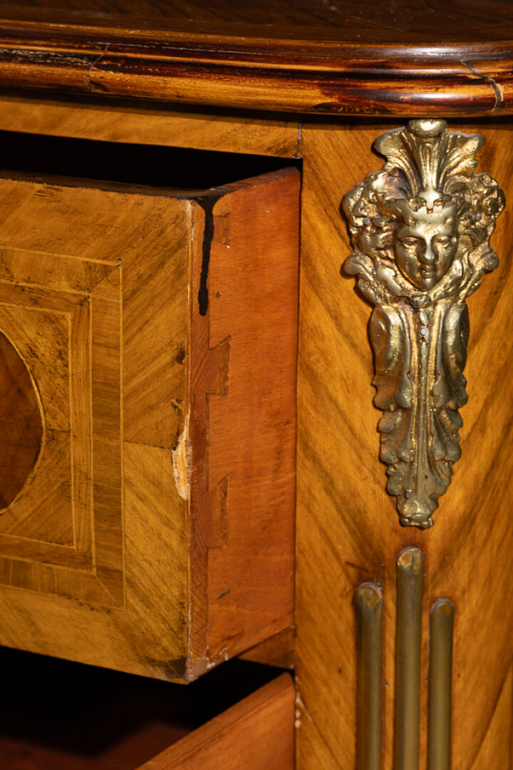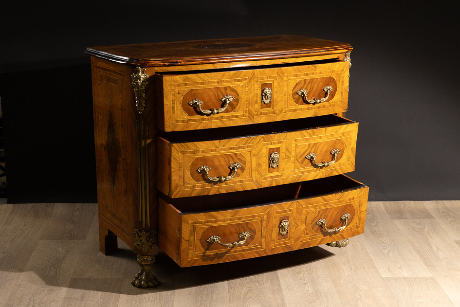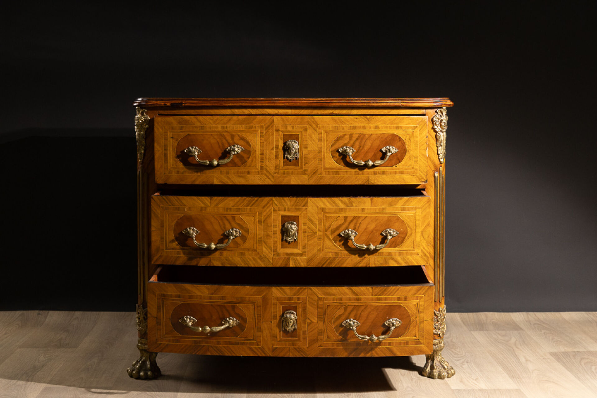 Commode bombée en placage de bois à décor géométrique et de filets marquetés ouvrant par trois tiroirs en façade. Ornementation de bronze et laiton ciselés et dorés, d'espagnolettes, pattes de lions telles que poignées de tirage, entrées de serrure, chutes (usures et petits manques au placage). Style Louis XIV. Haut. : 85 cm - Larg. : 100 cm - Prof. : 50 cm