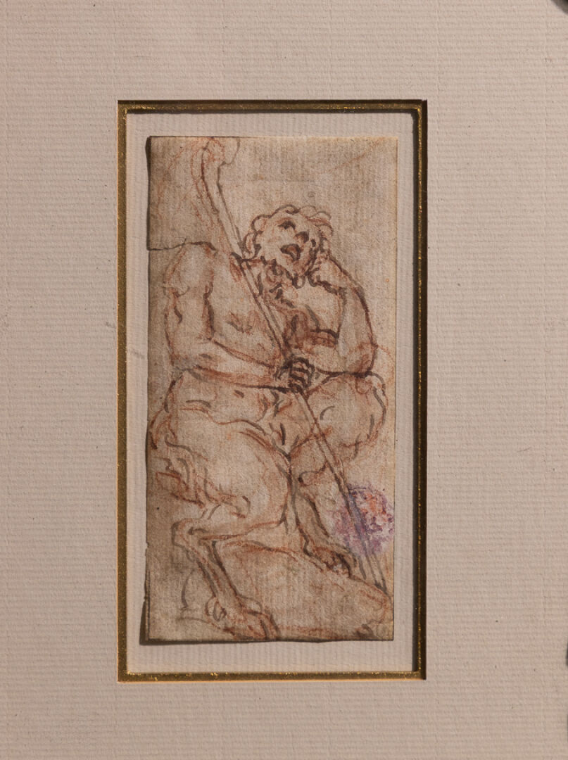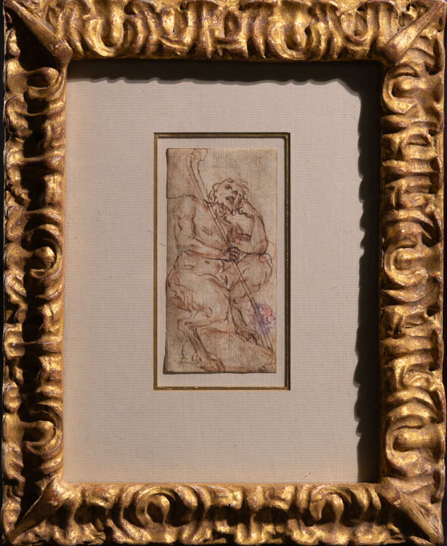 École italienne du XVIIIe siècle dans le goût de Maratta. Satyre songeur. Dessin à l'encre et à la sanguine. Haut. : 11 cm - Larg. : 5.5 cm Expertise réalisée par le Cabinet de BAYSER