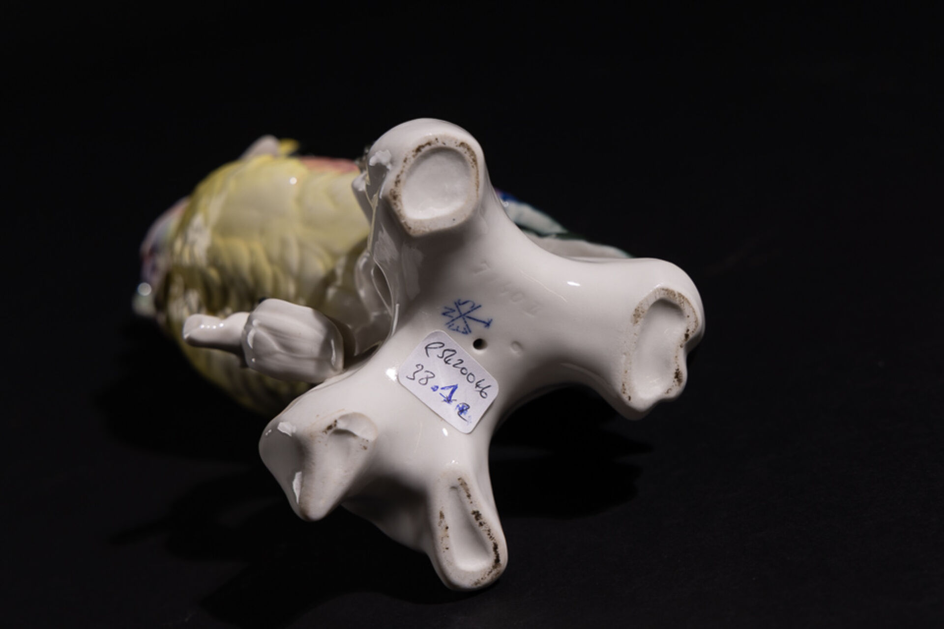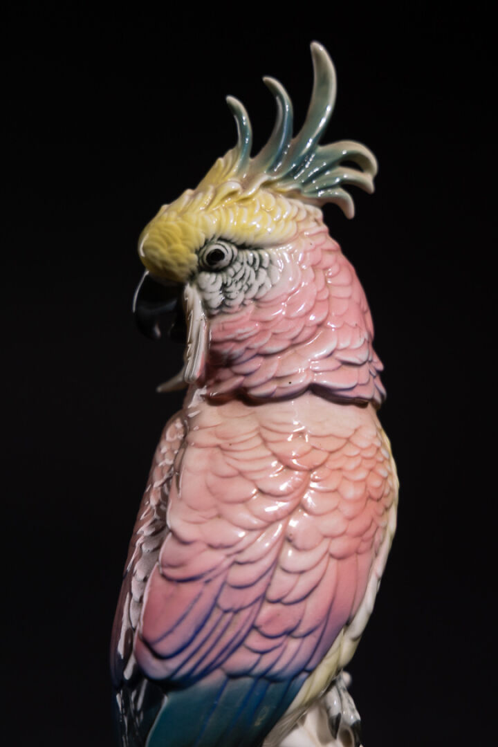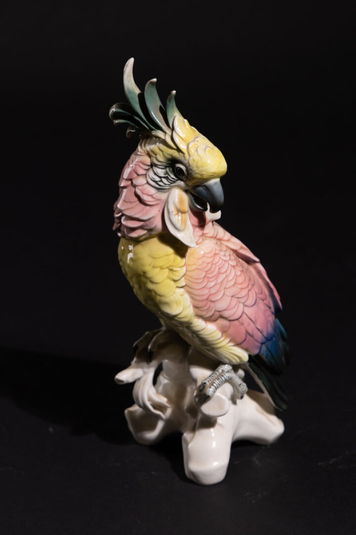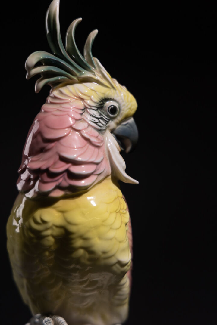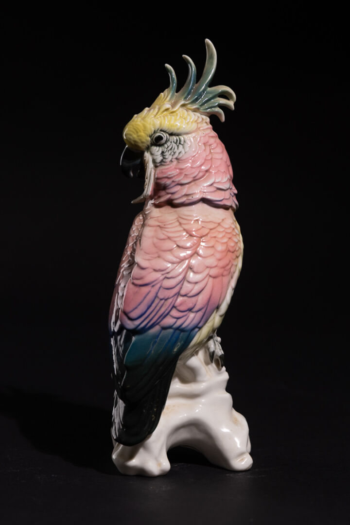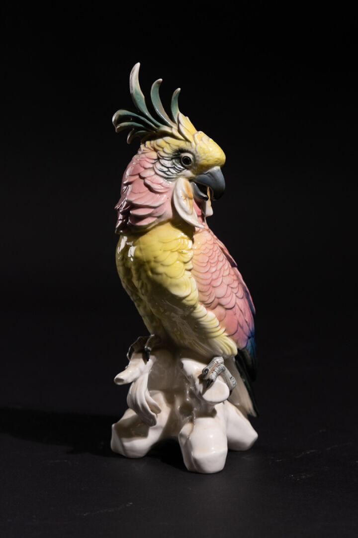 Manufacture de Karl ENS (1802-1885) Cacatoès branché en porcelaine polychrome dans les tons jaune, vert, rose, la tête tournée vers la gauche. Marqué au revers. Haut. : 28 cm
