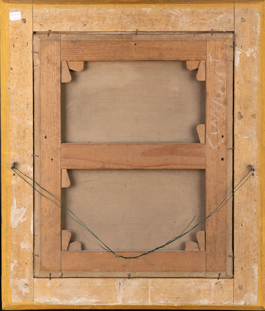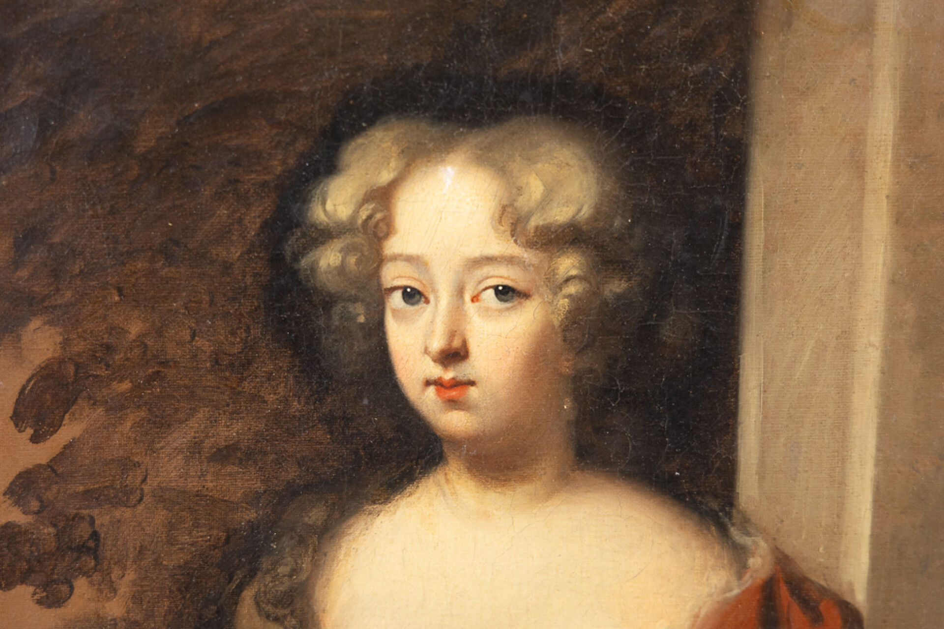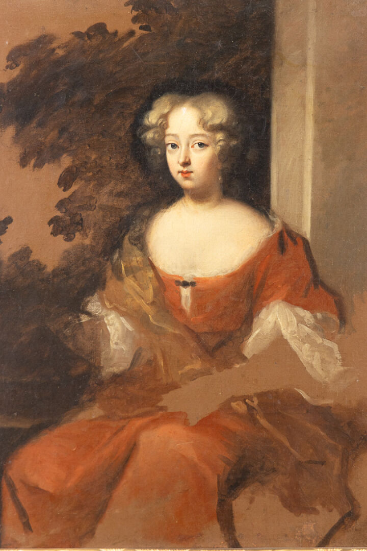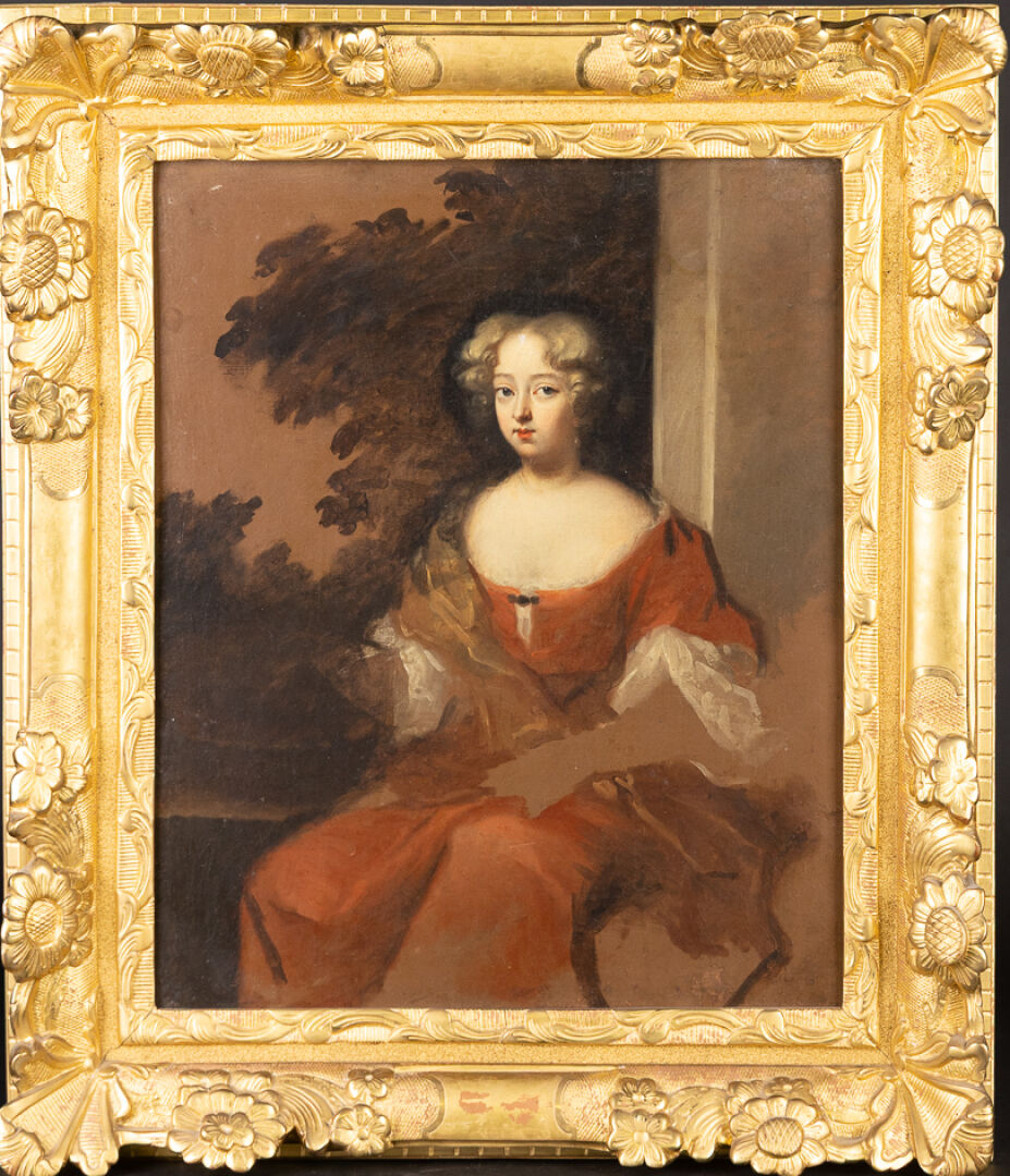 Ecole anglaise vers 1700. Portrait de femme à la robe rouge et au châle jaune assise sur un rebord de fenêtre. Huile sur toile, non achevée (restaurations anciennes, soulèvement et griffures). Haut. : 48.5 cm - Larg. : 39.5 cm Présentée dans un cadre en bois et stuc doré à décor de fleurs. Expertise réalisée par le Cabinet TURQUIN