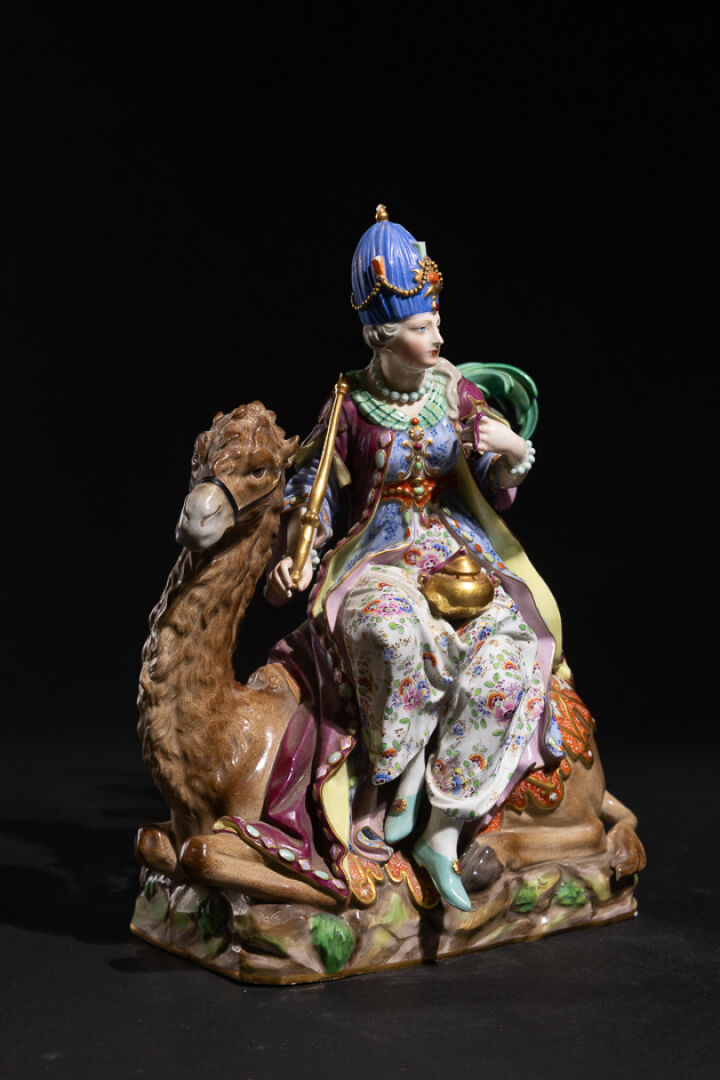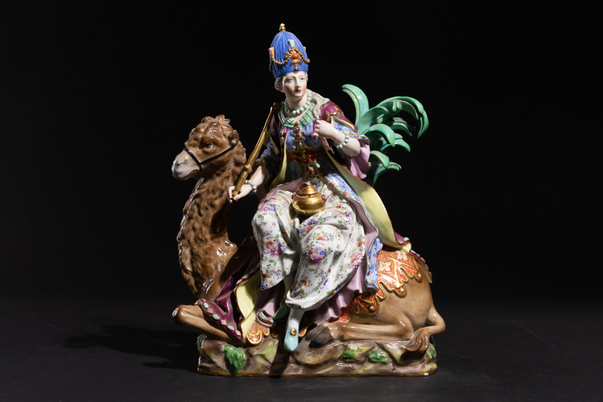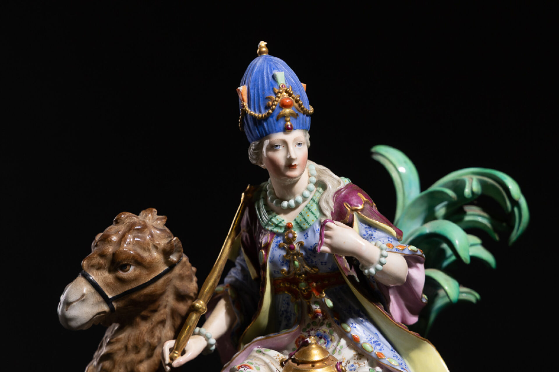 Allemagne dans le goût de Meissen. Groupe représentant l'allégorie de l'Asie, une jeune reine tenant un sceptre or et un brûle parfum assise sur un dromadaire couché sur un tertre avec palmier. Décor polychrome et or (accidents). Marque apocryphe. XXe siècle. Haut. : 31 cm - Larg. : 26 cm - Prof. : 13 cm Expertise réalisée par Manuela FINAZ
