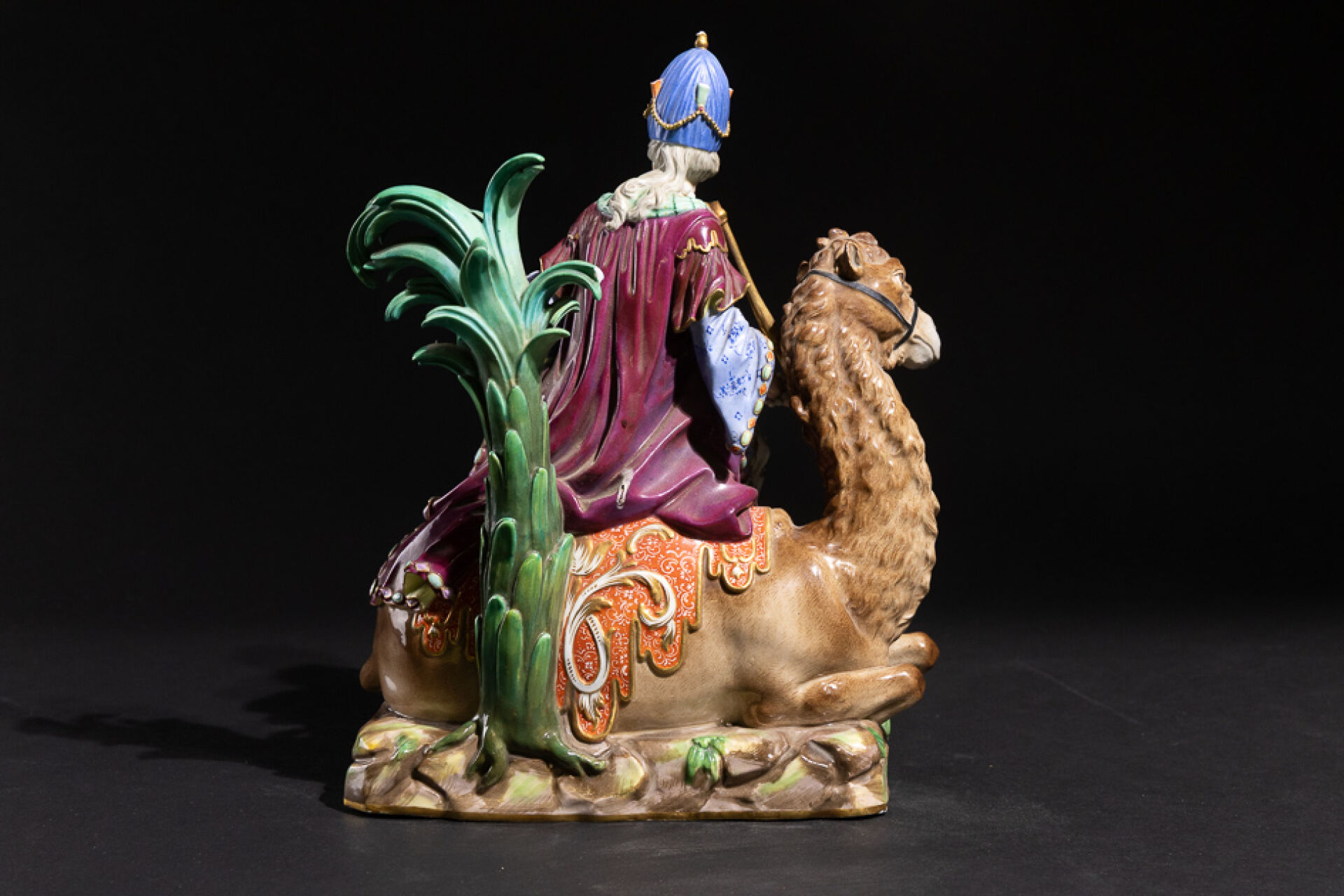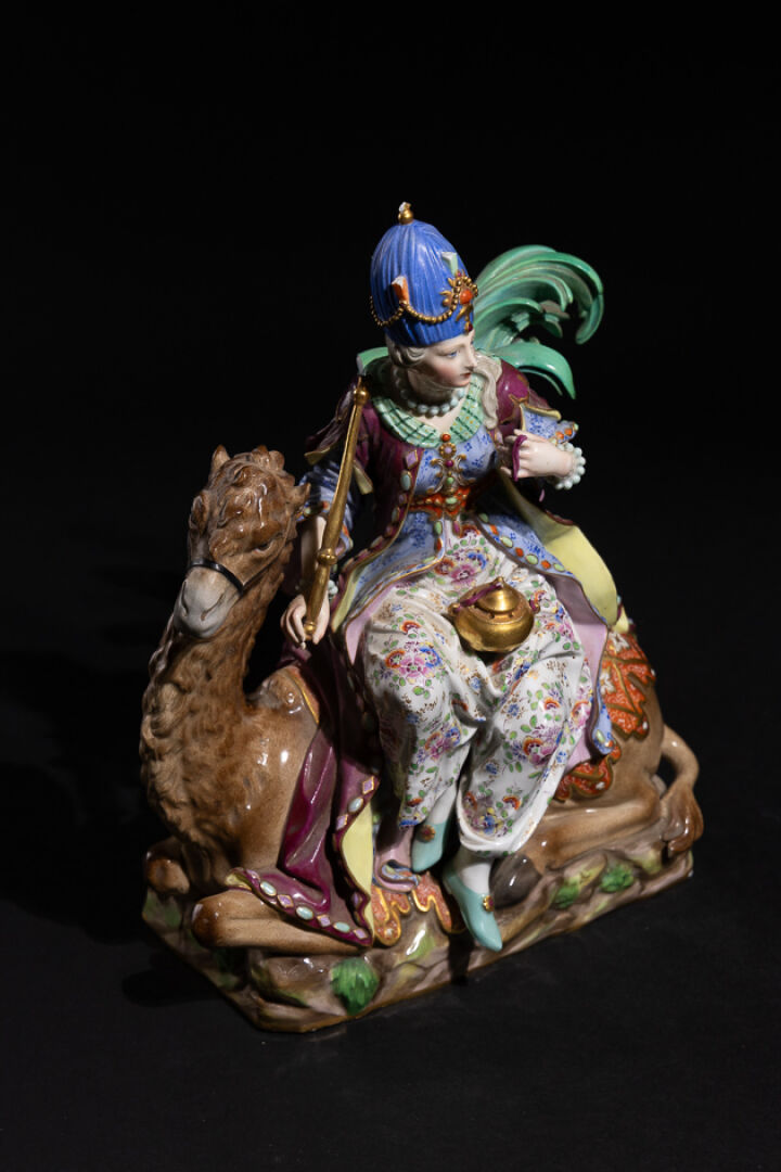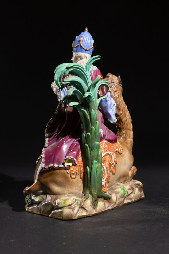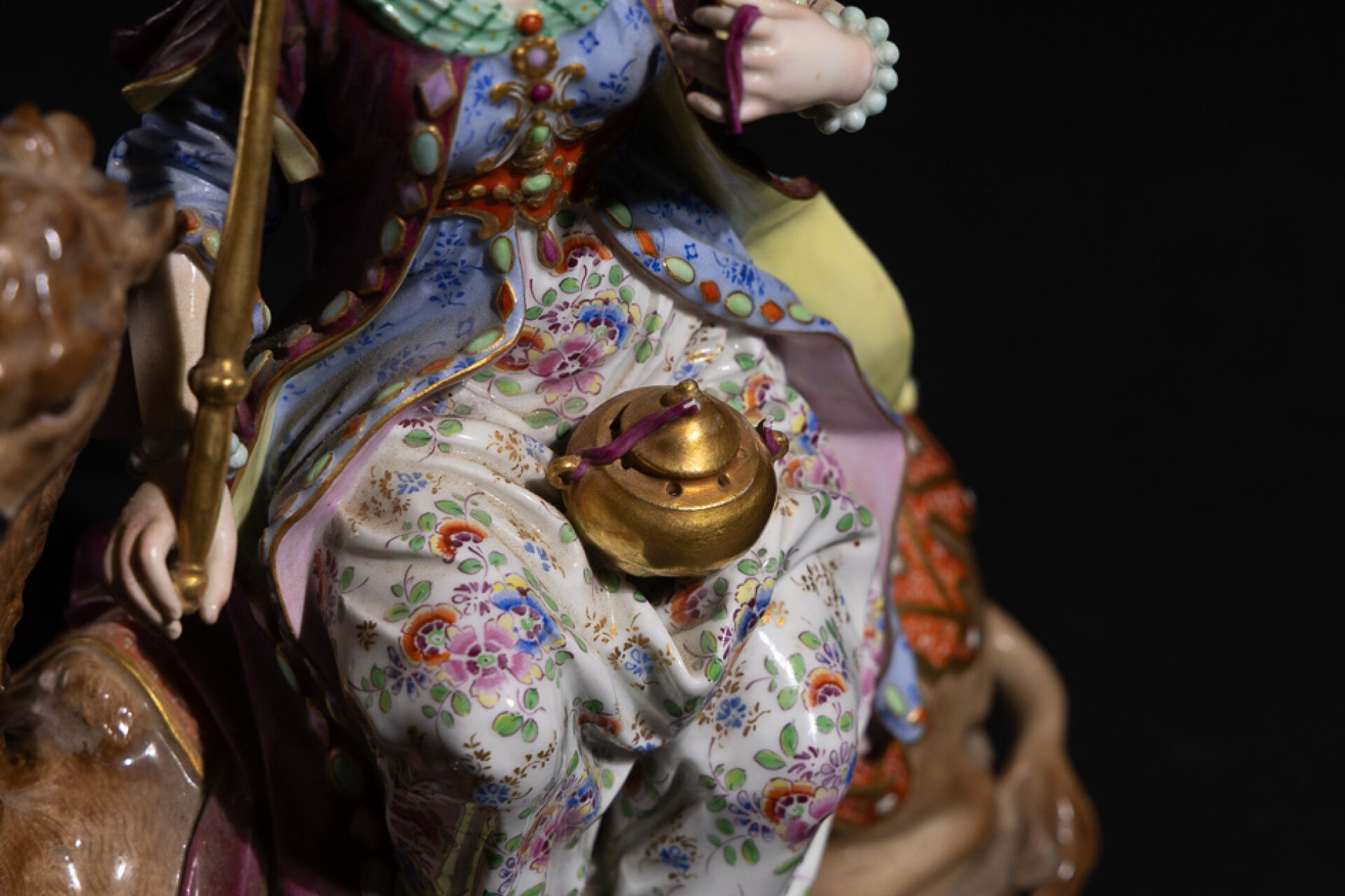 Allemagne dans le goût de Meissen. Groupe représentant l'allégorie de l'Asie, une jeune reine tenant un sceptre or et un brûle parfum assise sur un dromadaire couché sur un tertre avec palmier. Décor polychrome et or (accidents). Marque apocryphe. XXe siècle. Haut. : 31 cm - Larg. : 26 cm - Prof. : 13 cm Expertise réalisée par Manuela FINAZ