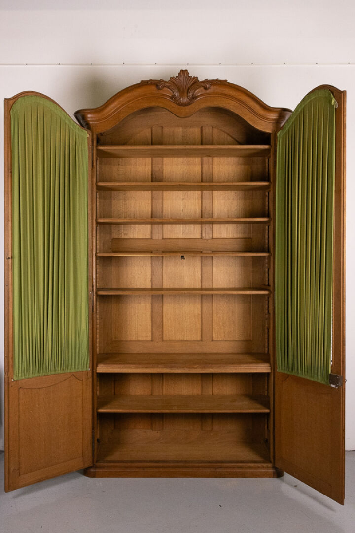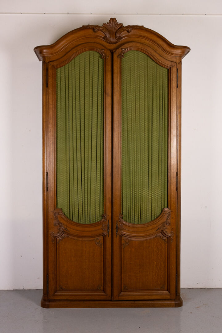 Bibliothèque en chêne massif mouluré, sculpté d'élégantes volutes feuillagées, les montants arrondis encadrent deux portes grillagées en partie haute et tendues de tissu vert. La corniche en accolade centrée d'une large coquille, piètement plinthe. Style Régence. Ébéniste Yvon PALAMOUR installé à Pluvigner (56) - Major de sa promotion à l'école Boulle. Haut. : 276 cm - Larg. : 153 cm - Prof. : 57 cm