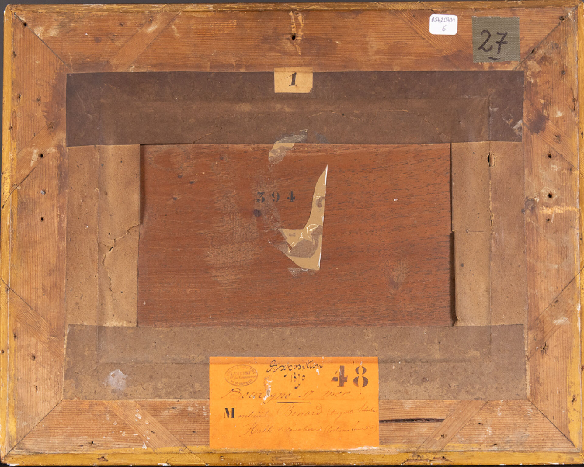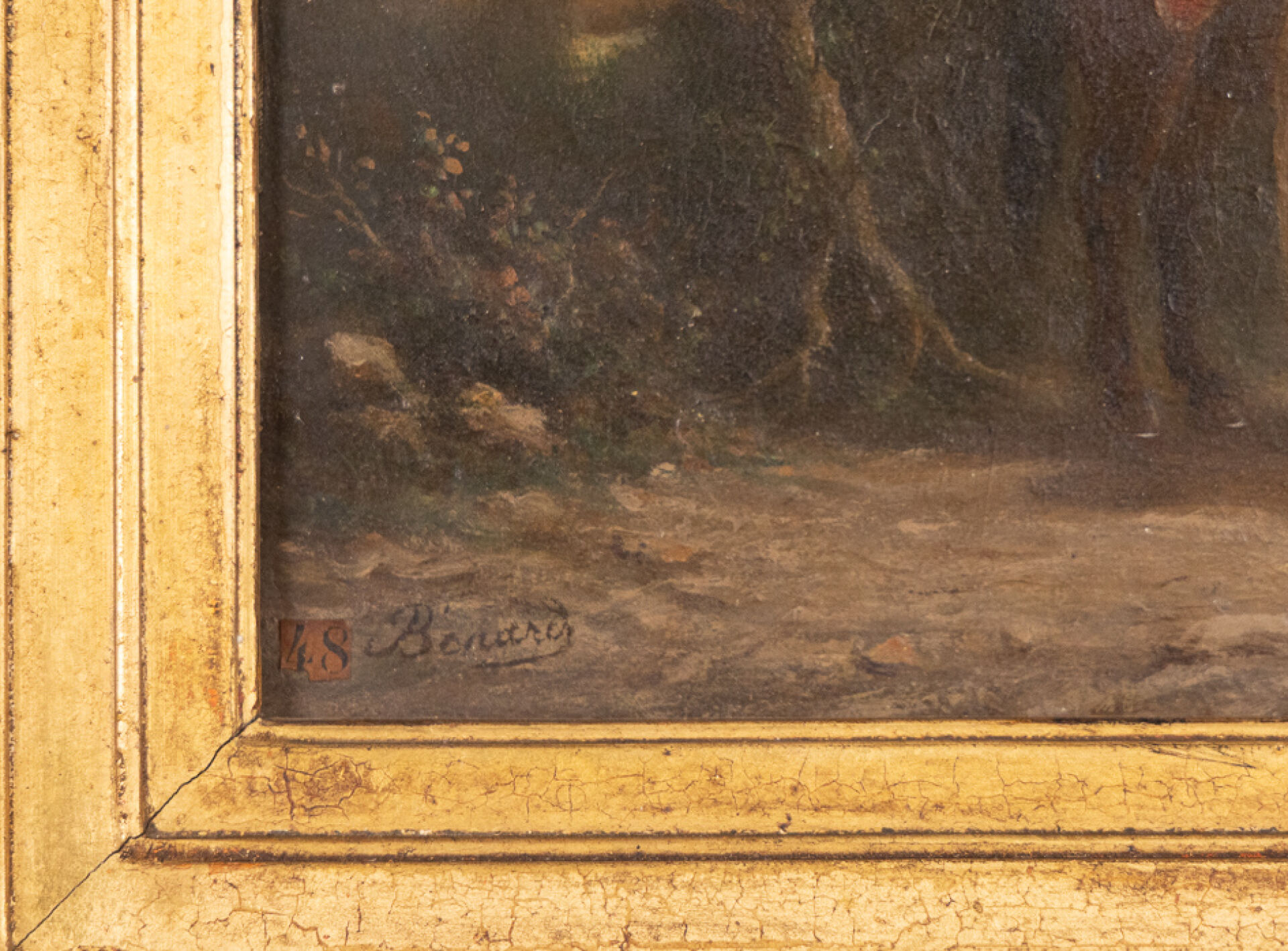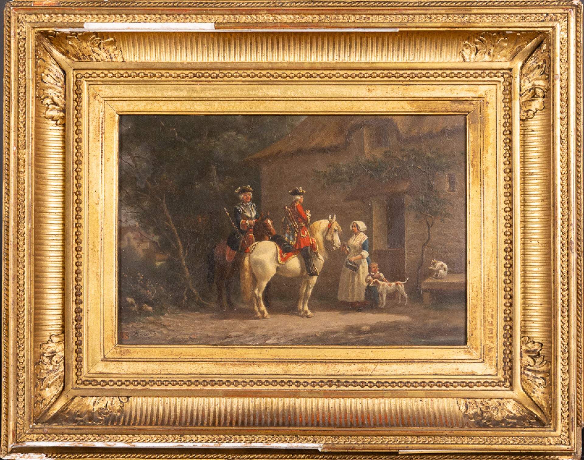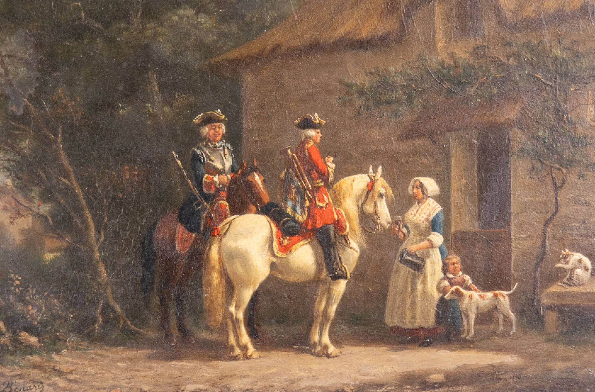 Auguste-Sébastien BENARD (XIXe siècle). "Halte de cavaliers (costumes Louis XV)". Huile sur panneau, signée en bas à gauche, au revers étiquette d'exposition de Boulogne-sur-Mer en 1870, titrée et signée au revers. Dim. à vue : Haut. : 18.5 cm - Larg. : 28.5 cm