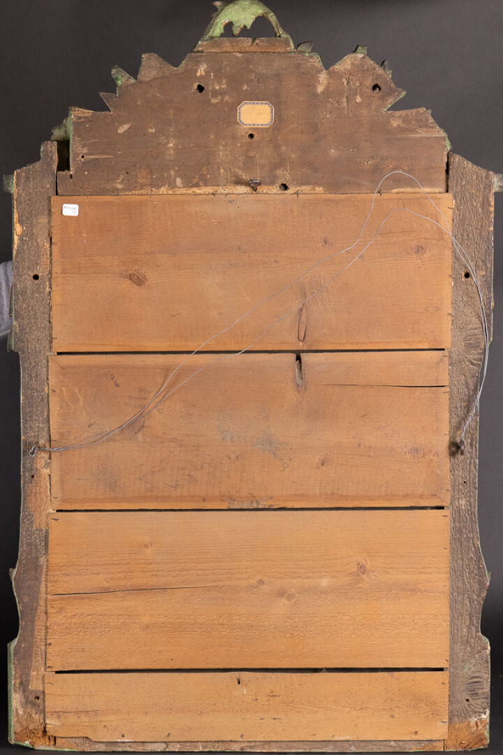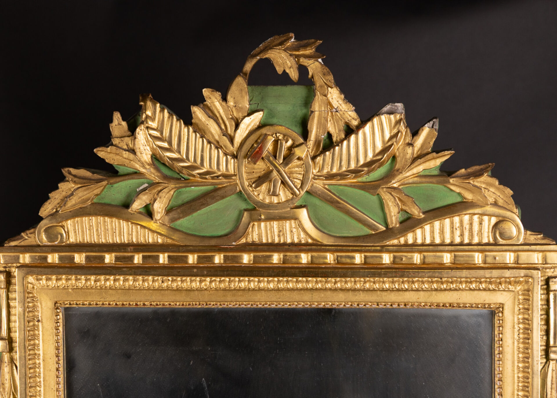Miroir en bois laqué vert et rechampi or, l'encadrement à feuilles d'oves et frise de perles, le fronton aux outils, et rameaux feuillagés soulignés de volutes (restaurations). Style Louis XVI ancien. Haut. : 108 cm - Larg. : 72 cm