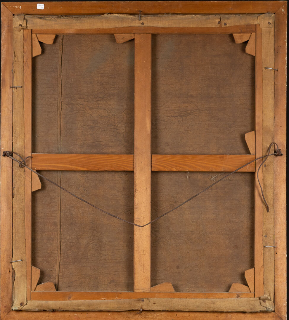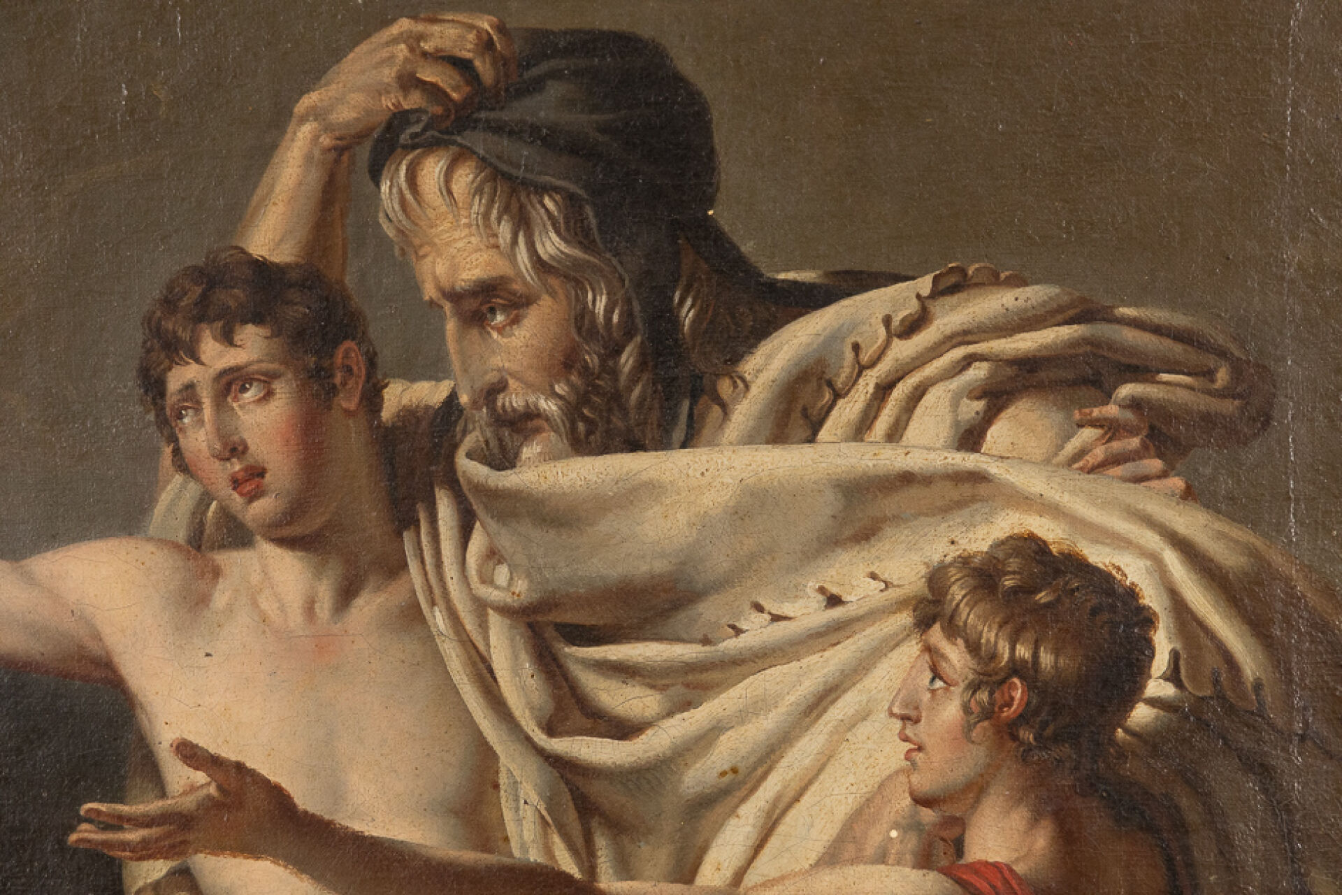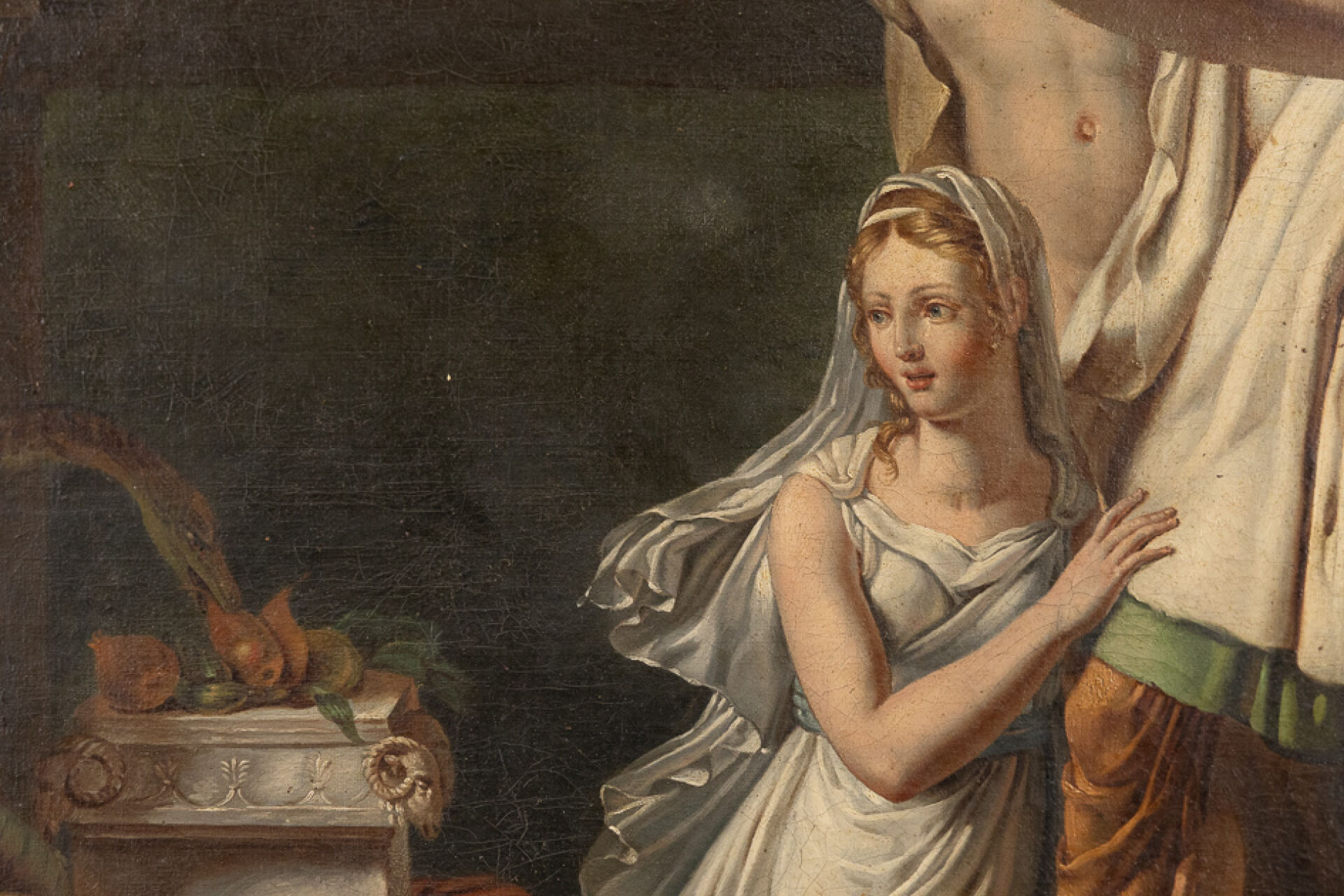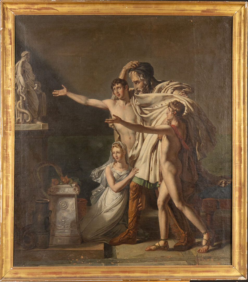 D'après Pierre-Narcisse GUERIN (1774-1833). "L'offrande à Esculape ou La piété filiale". Huile sur toile, d'après l'original conservé au Musée des Beaux-Arts d'Arras (manques notamment en partie basse, restaurations et rentoilage). Haut. : 93 cm - Larg. : 82 cm Esculape (Asclépios) est le dieu grec de la médecine. Fils d'Apollon et de la mortelle Coronis, il est sauvé du ventre de sa mère mourante. Élevé par le centaure Chiron, il apprend l'art de guérir et devient si puissant qu'il ressuscite les morts. Ce pouvoir inquiète les dieux : Zeus le frappe de la foudre pour préserver l'ordre du monde. Esculape est ensuite divinisé et devient un dieu bienveillant, protecteur des malades. Son symbole, le bâton entouré d'un serpent, est encore aujourd'hui l'emblème de la médecine.