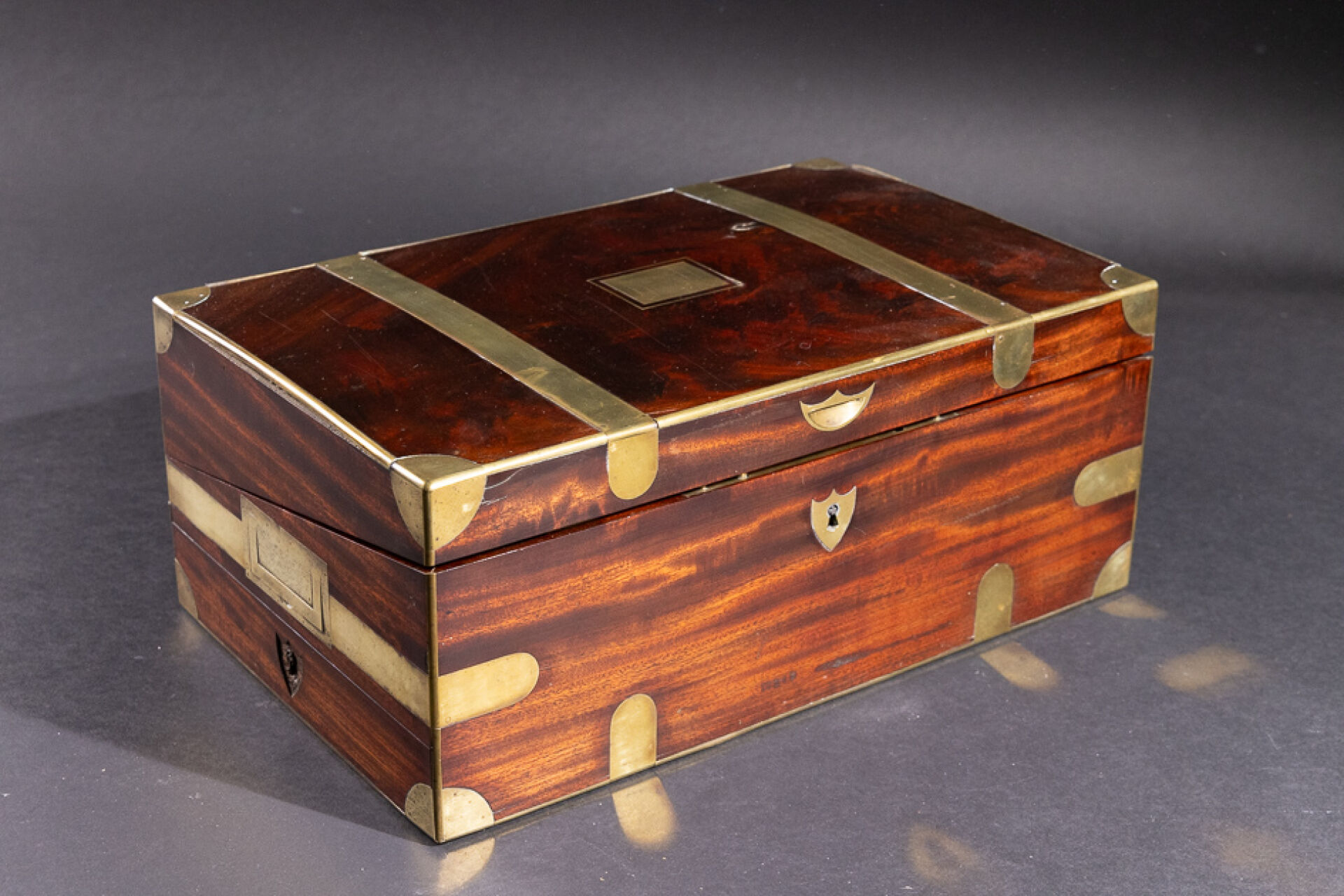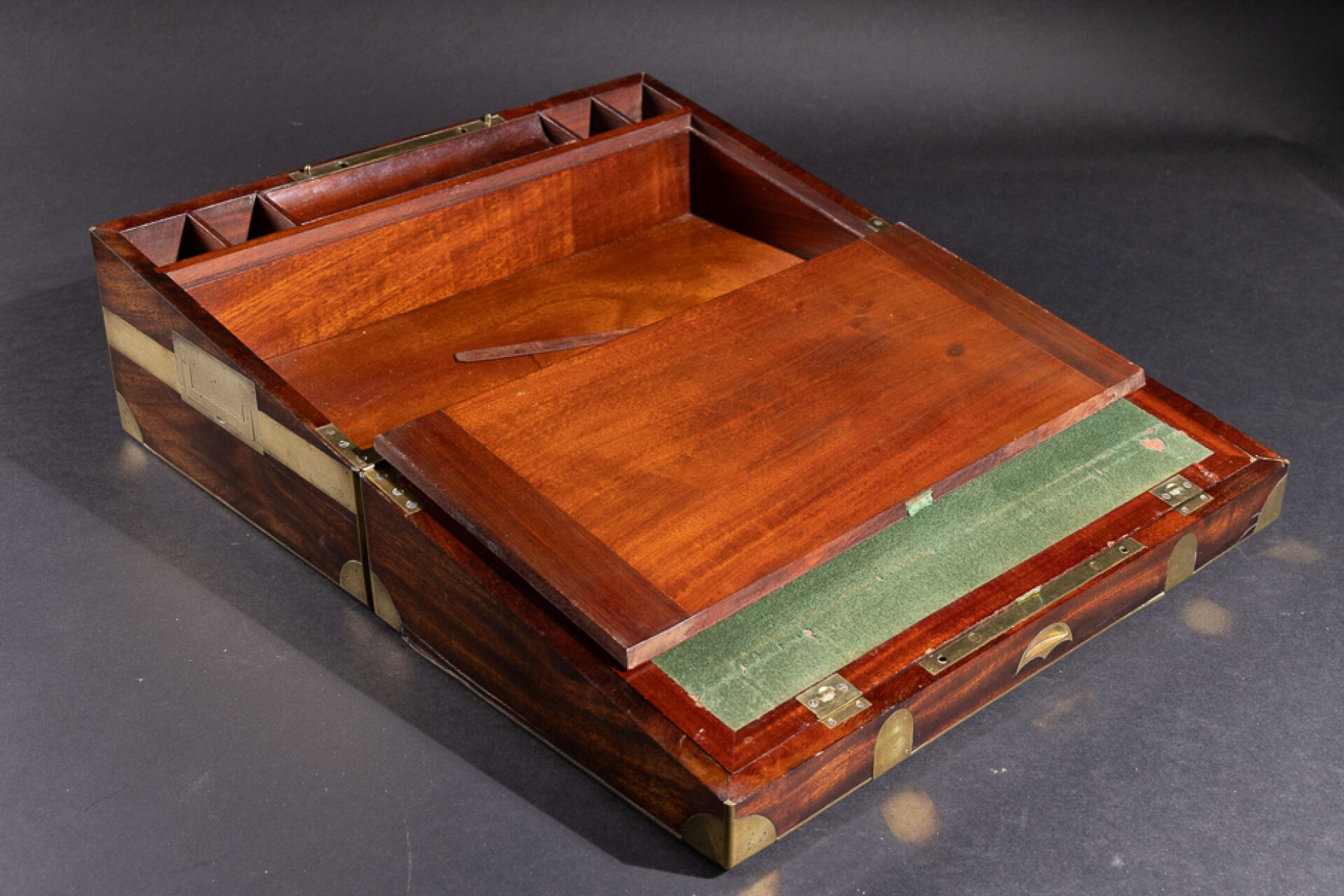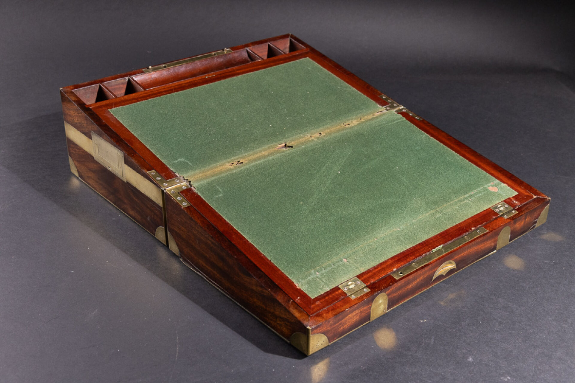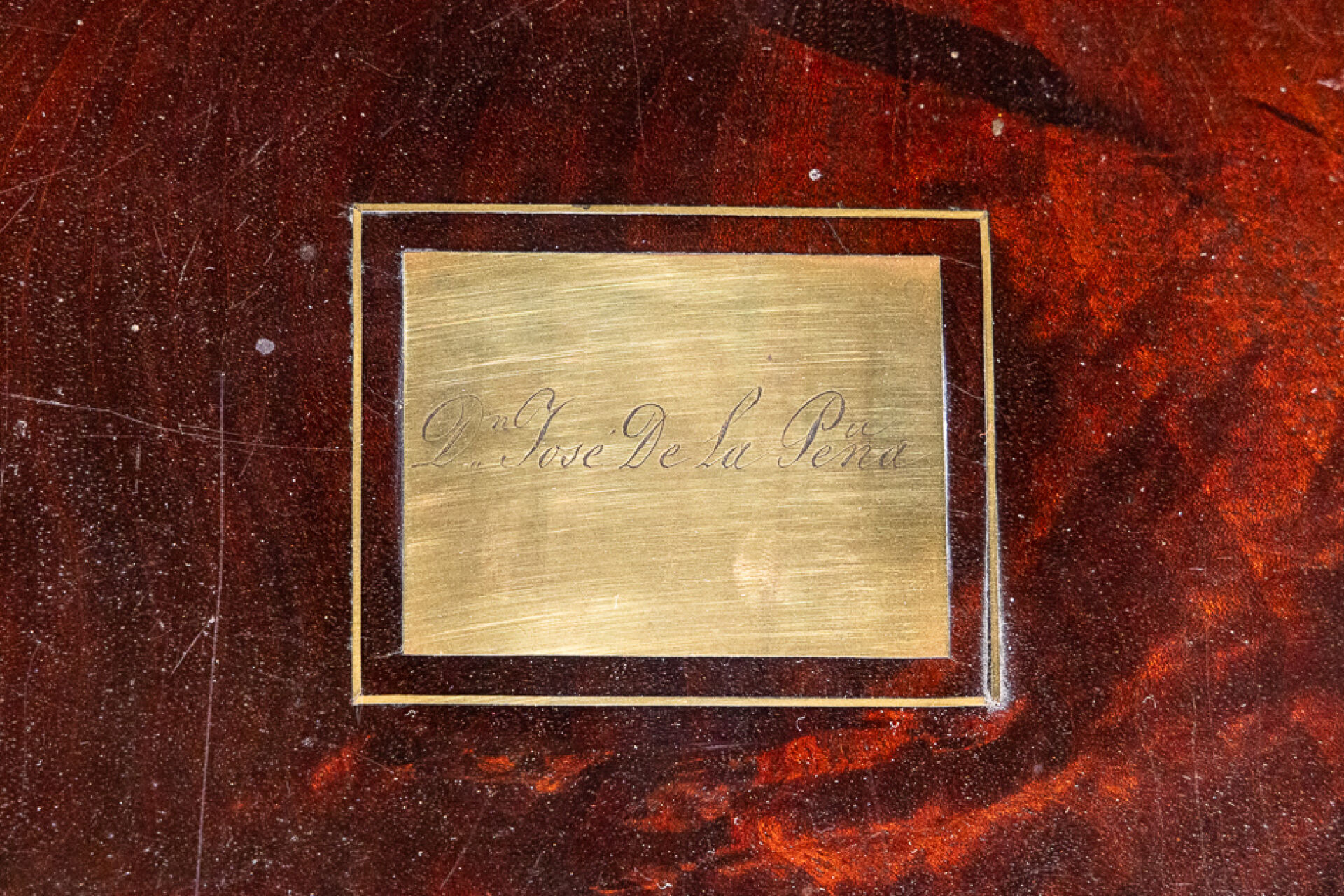 Écritoire de voyage en acajou et placage d'acajou à ferrures de laiton, de forme rectangulaire, le couvercle portant l'inscription Don José de La Peña. Le couvercle découvre un abattant tendu de feutre vert, découvrant des compartiments, la partie inférieure ouvrant à un tiroir (accidents et manques). XIXe siècle. Haut. : 17.5 cm - Long. : 43.5 cm - Prof. : 27 cm