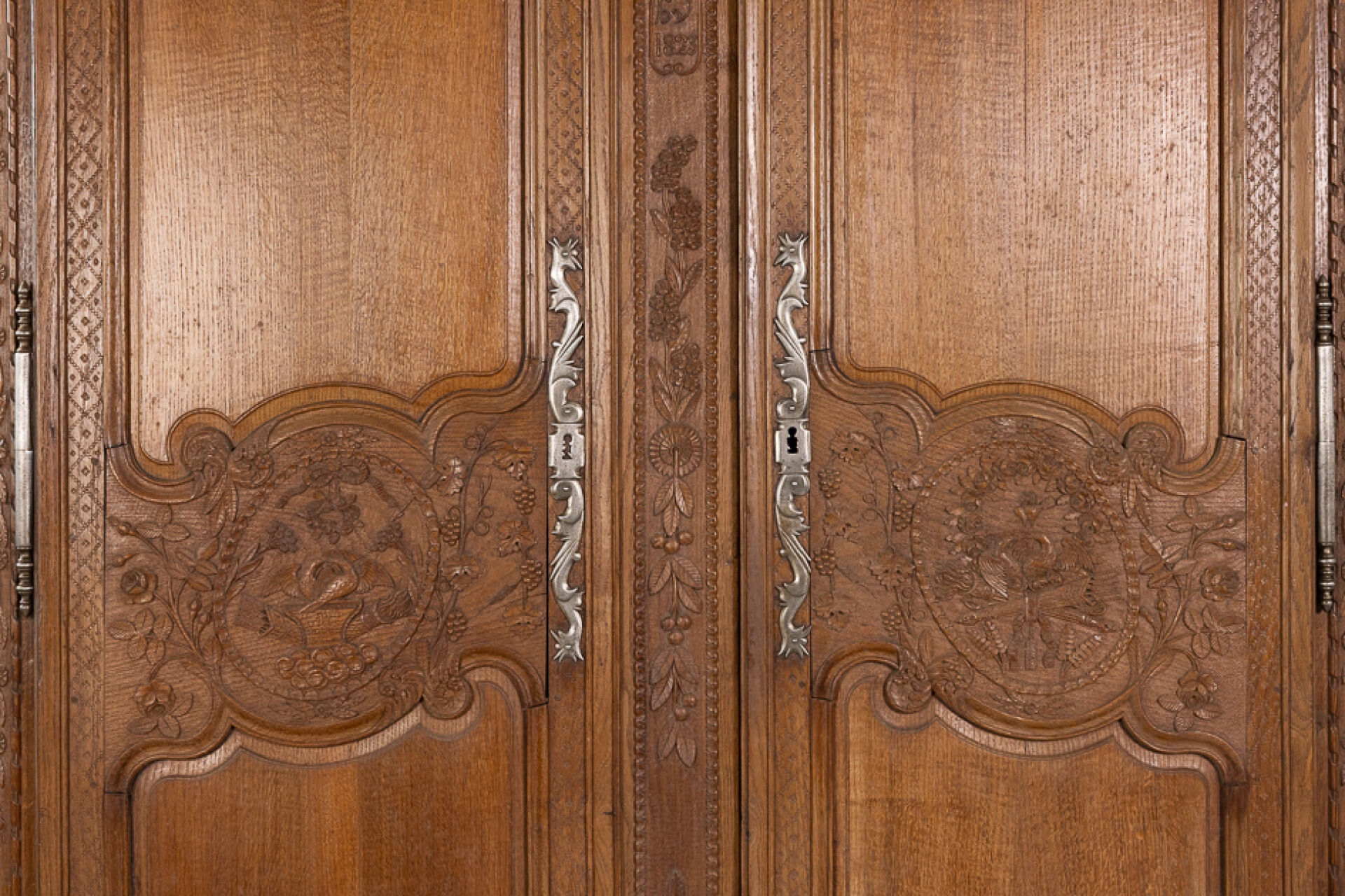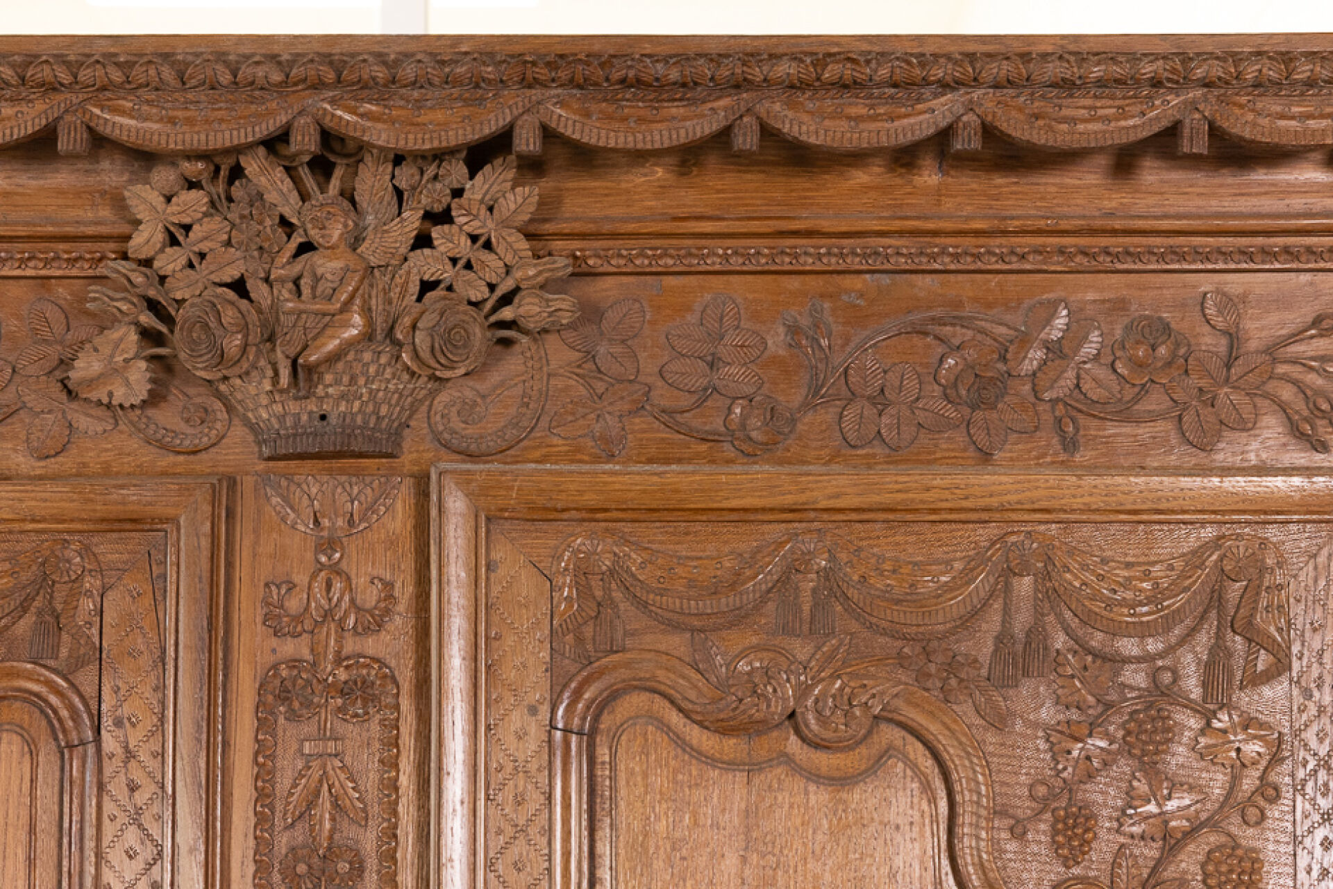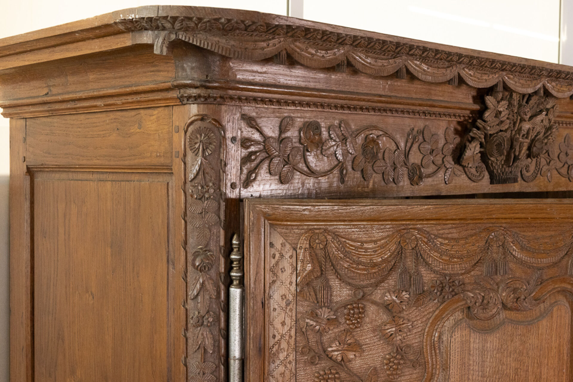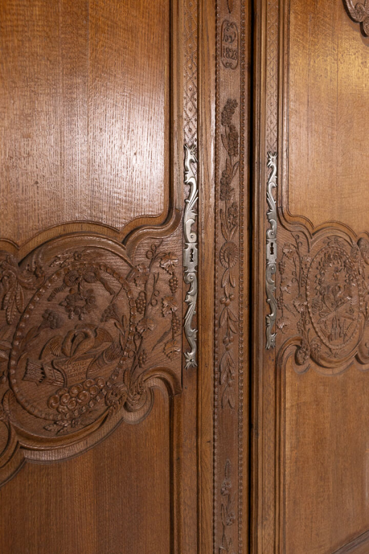 Armoire de mariage en chêne à décor mouluré et richement sculpté de fleurettes, les montants arrondis à joncs rubanés encadrent deux portes à décor de pampres, dais, colombes se bécotant soulignées d'un trophée d'Amour sur l'une et de la mention " IL SONT UNIS POUR LA VIE". Le faux dormant à raies de cœur et fleurettes portant la date 1823 aux initiales HV (?), la corniche à décor de lambrequins, soulignée par un fronton centré d'un angelot assis dans une corbeille fleurie tenant une colombe. Travail normand, vers 1820. Haut. : 211 cm - Larg. : 155 cm - Prof. : 65 cm