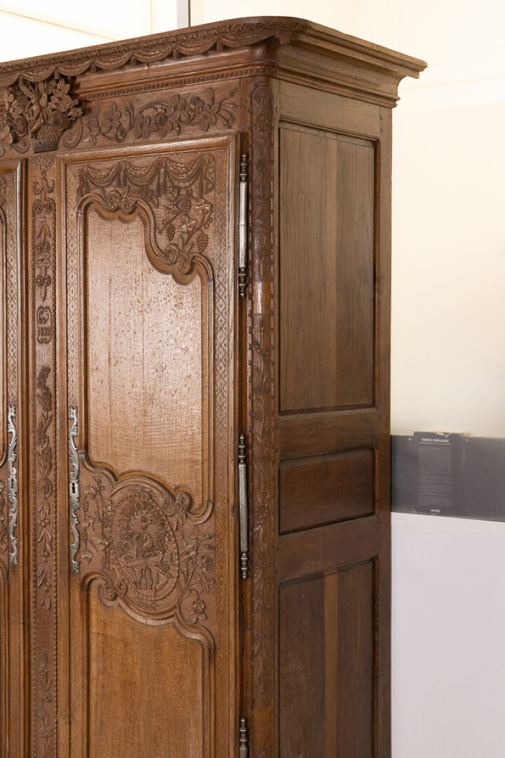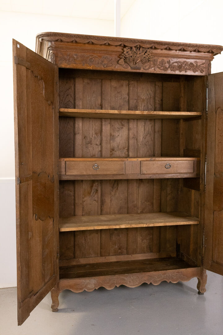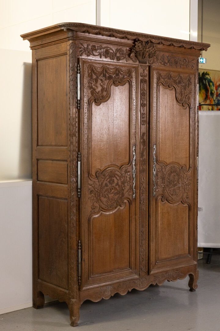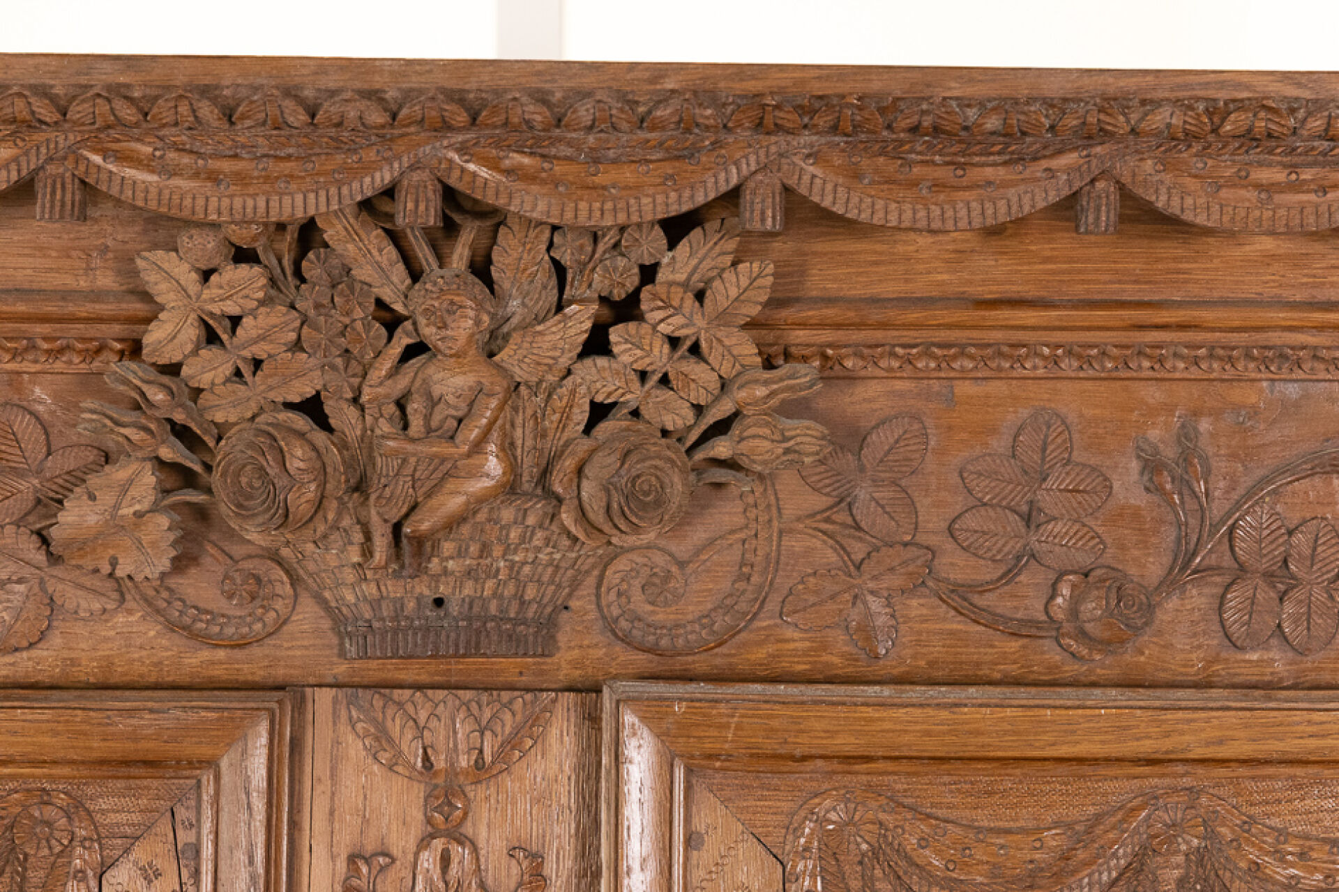 Armoire de mariage en chêne à décor mouluré et richement sculpté de fleurettes, les montants arrondis à joncs rubanés encadrent deux portes à décor de pampres, dais, colombes se bécotant soulignées d'un trophée d'Amour sur l'une et de la mention " IL SONT UNIS POUR LA VIE". Le faux dormant à raies de cœur et fleurettes portant la date 1823 aux initiales HV (?), la corniche à décor de lambrequins, soulignée par un fronton centré d'un angelot assis dans une corbeille fleurie tenant une colombe. Travail normand, vers 1820. Haut. : 211 cm - Larg. : 155 cm - Prof. : 65 cm