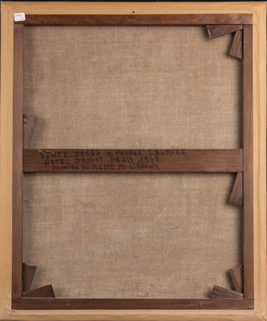 Alphonse LALAUZE (1872-1941). Portrait d'un Officier de la Compagnie des Mousquetaires du Roi, sa compagnie en arrière-plan. Huile sur toile signée (restaurée). Haut. : 65 cm - Larg. : 54 cm Provenance : Hôtel Drouot - Paris 1948 - vente successorale de l'artiste. Régiment d'élite sous la Restauration, la compagnie des Mousquetaires du roi est rétablie en 1814, elle est en charge de la protection royale. Héritiers du prestige de l'Ancien Régime, ils incarnent le retour aux valeurs monarchiques. Dissoute définitivement en 1816, leur rôle reste avant tout symbolique et honorifique. Bien que principalement connu comme illustrateur et graveur, Alphonse Lalauze (1838-1906) s'est également illustré dans la peinture, notamment dans le registre militaire, un genre très prisé au XIXe siècle en France. Dans ce domaine, il réalise des scènes de genre à caractère historique, souvent inspirées de l'époque de Louis XIV ou du Premier Empire, mêlant précision documentaire et vivacité narrative. Ses compositions évoquent des épisodes de la vie militaire avec un souci du détail dans les uniformes, les gestes et l'ambiance de caserne ou de bivouac. Ses œuvres traduisent autant l'intérêt pour l'histoire que l'esthétique romantique du soldat. Bien qu'il ne soit pas peintre officiel de l'armée, sa production militaire s'inscrit dans le courant plus large du réalisme militaire du XIXe siècle, aux côtés d'artistes comme Detaille ou Neuville, mais avec une touche plus intimiste et anecdotique.