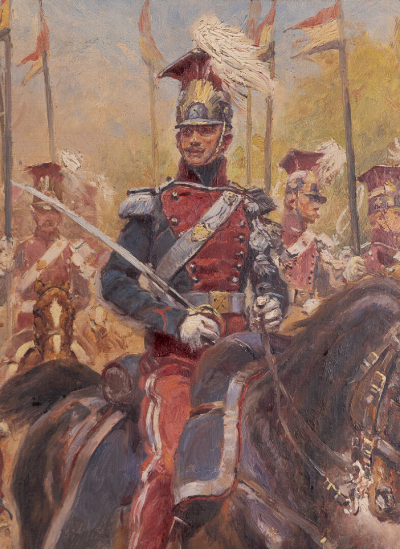Alphonse LALAUZE (1872-1941). Lanciers polonais. Huile sur toile, signée en bas à gauche et datée 1930 (?). Haut. : 65 cm - Larg. : 54 cm Provenance : Hôtel Drouot - Paris 1948 - vente successorale de l'artiste. Bien que principalement connu comme illustrateur et graveur, Alphonse Lalauze (1838-1906) s'est également illustré dans la peinture, notamment dans le registre militaire, un genre très prisé au XIXe siècle en France. Dans ce domaine, il réalise des scènes de genre à caractère historique, souvent inspirées de l'époque de Louis XIV ou du Premier Empire, mêlant précision documentaire et vivacité narrative. Ses compositions évoquent des épisodes de la vie militaire avec un souci du détail dans les uniformes, les gestes et l'ambiance de caserne ou de bivouac. Ses œuvres traduisent autant l'intérêt pour l'histoire que l'esthétique romantique du soldat. Bien qu'il ne soit pas peintre officiel de l'armée, sa production militaire s'inscrit dans le courant plus large du réalisme militaire du XIXe siècle, aux côtés d'artistes comme Detaille ou Neuville, mais avec une touche plus intimiste et anecdotique.