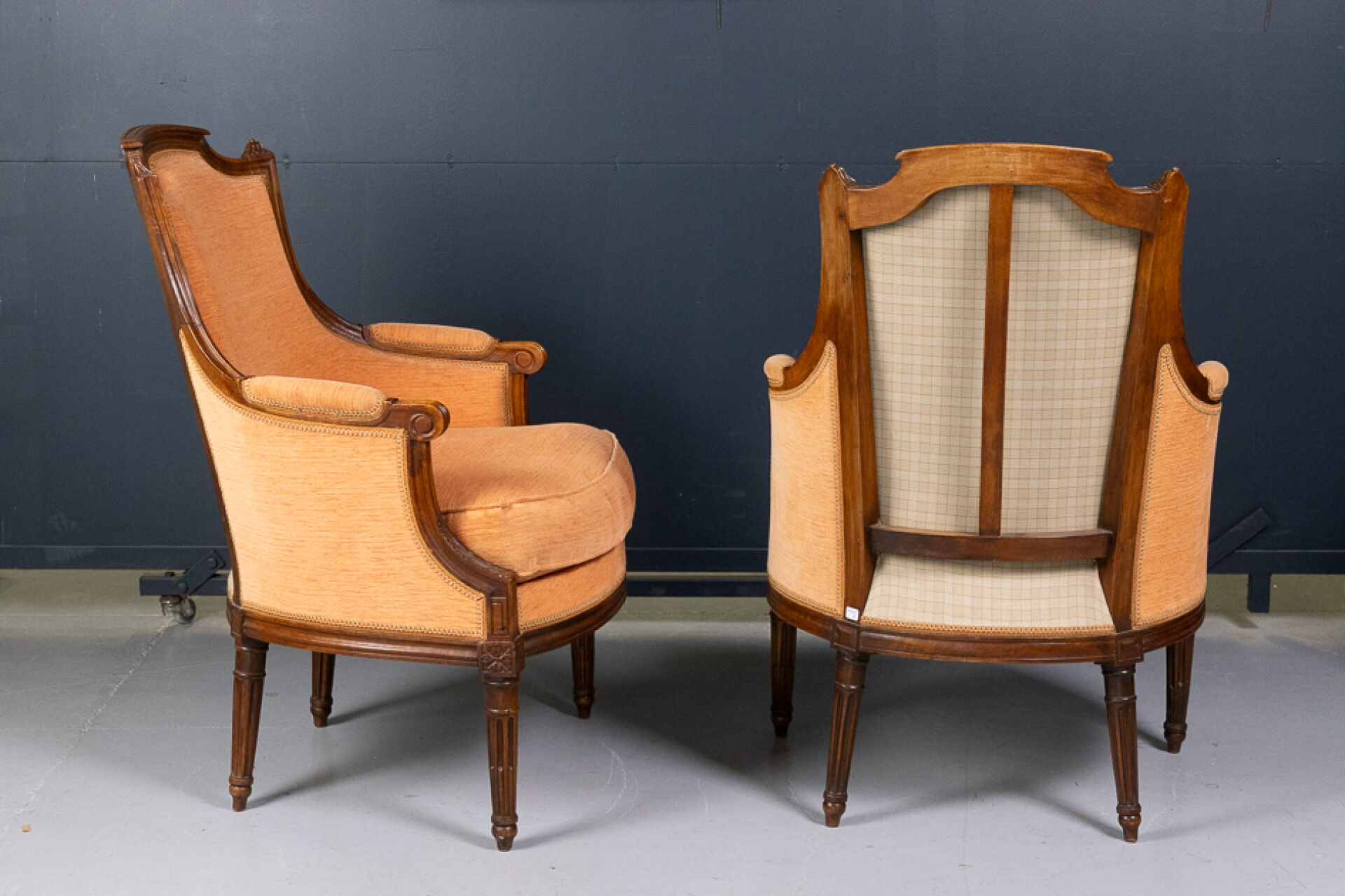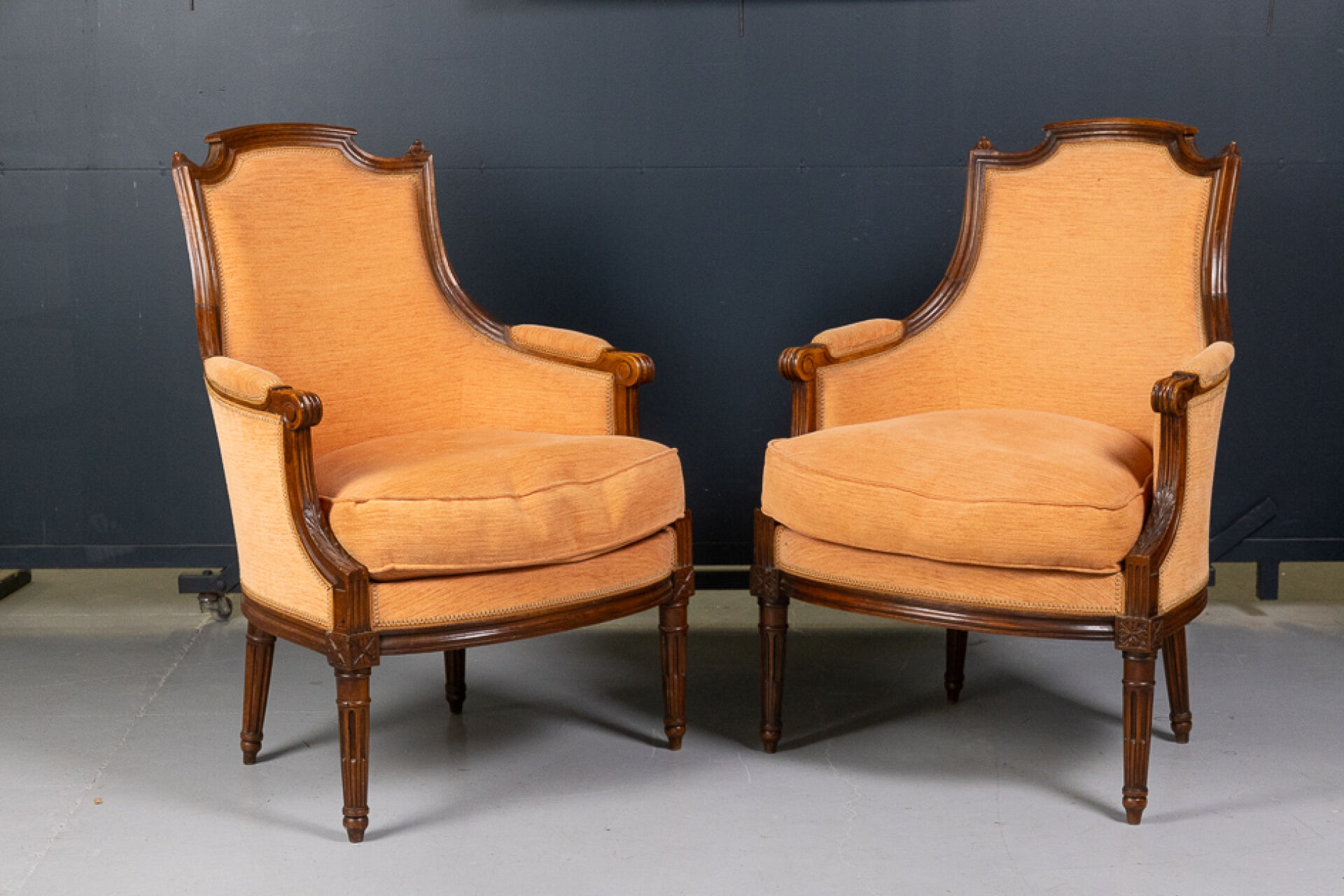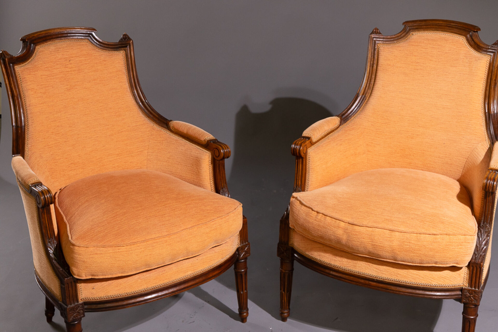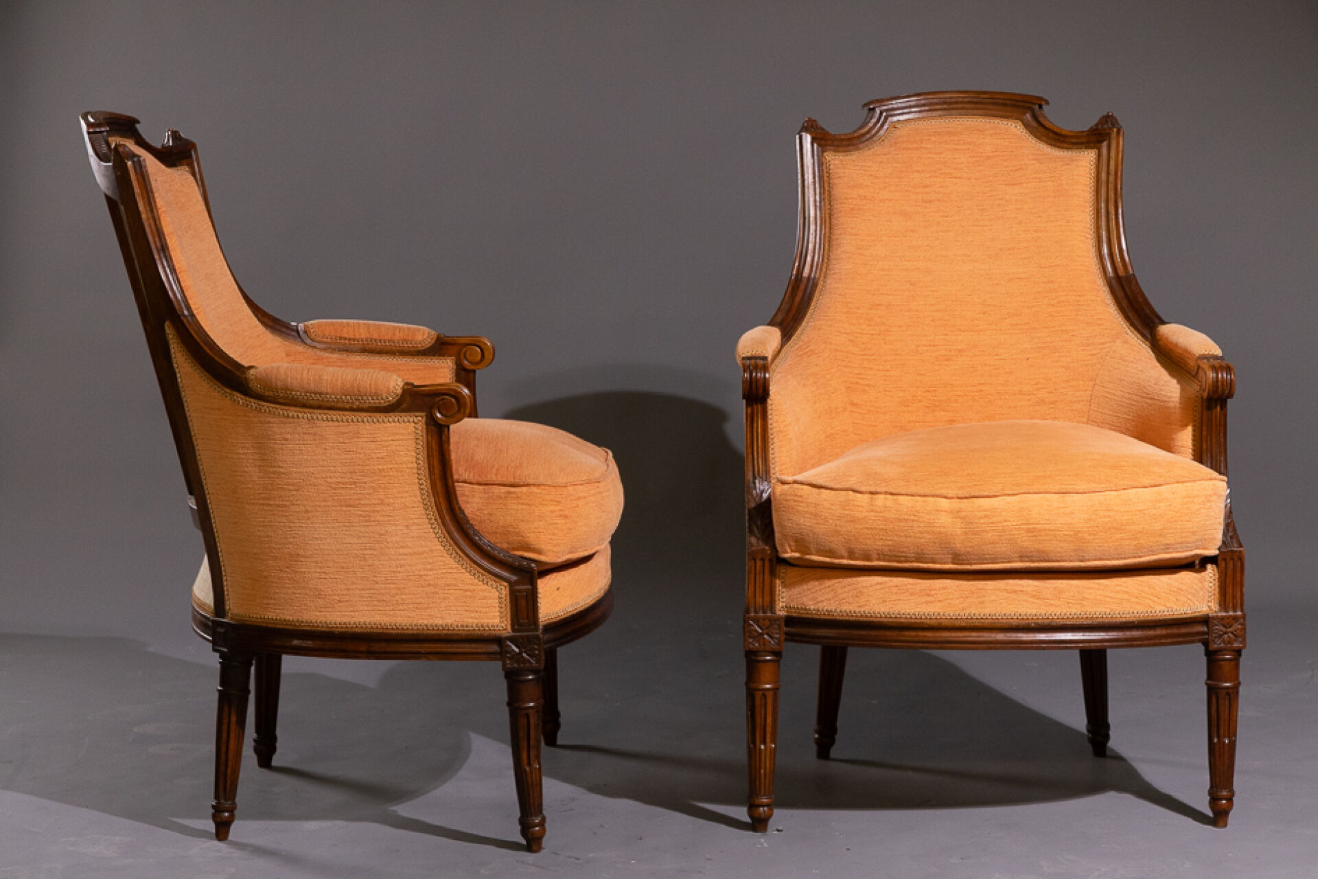 Paire de bergères cabriolet à dossier chapeau de gendarme teinté à la façon de l'acajou, les accotoirs à manchettes, terminés par des enroulements et soulignés d'acanthes stylisées, les pieds fuselés et cannelés, les antérieurs rudentés (restaurations). Époque Louis XVI. Haut. : 101 cm - Larg. : 68 cm - Prof. : 60 cm Garniture de tissu pêche. Provenance : Acheté chez Auguste SEMAIL, Antiquaire, 10, rue du Cherche-Midi - Paris VIe, le 26 février 1958.
