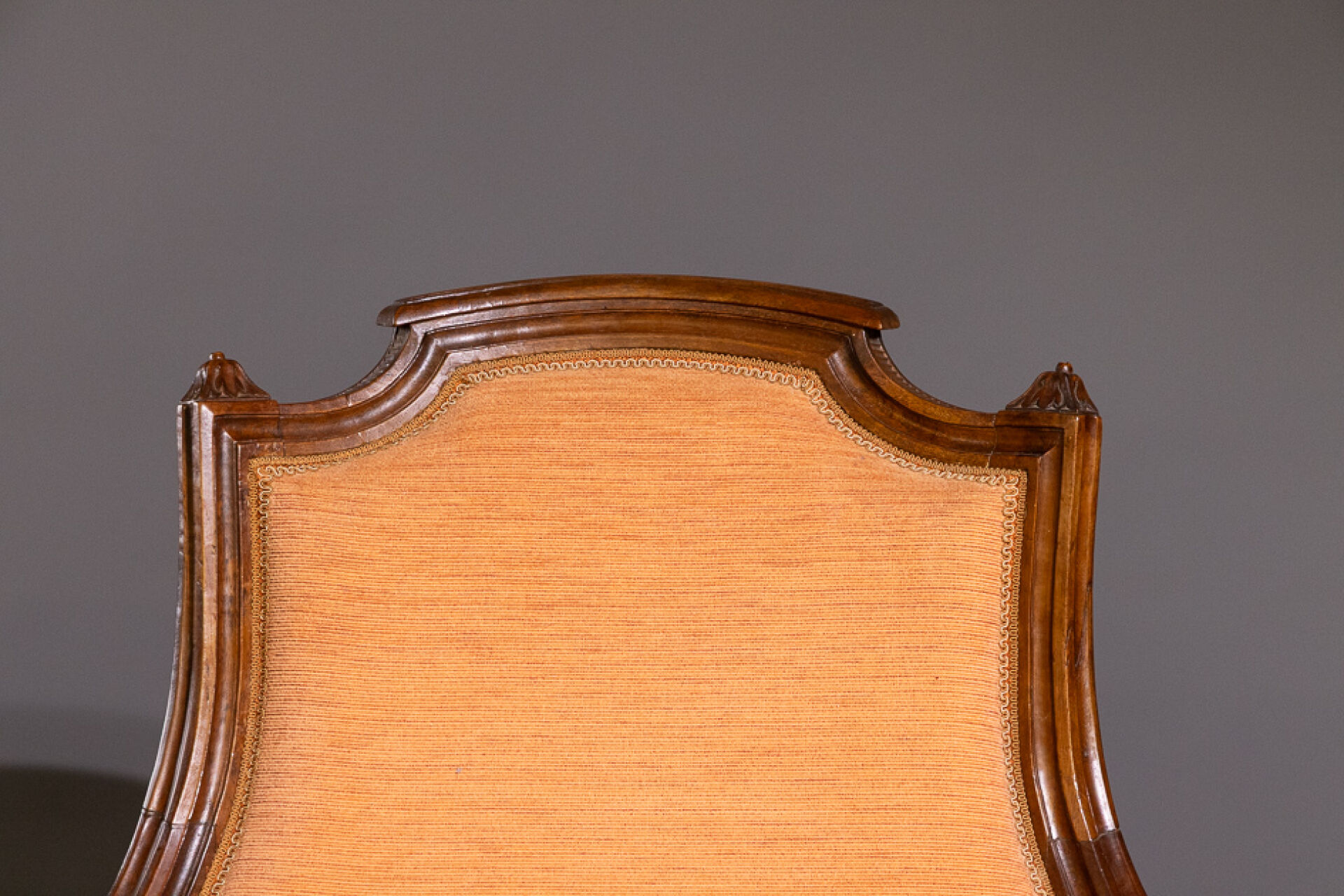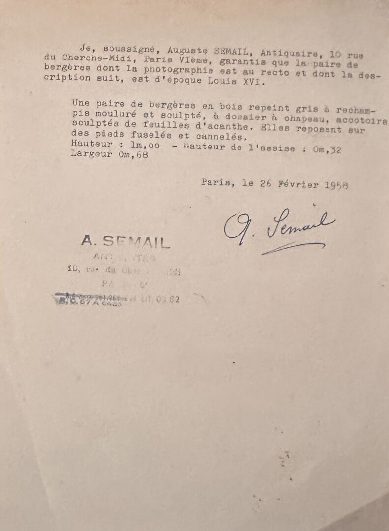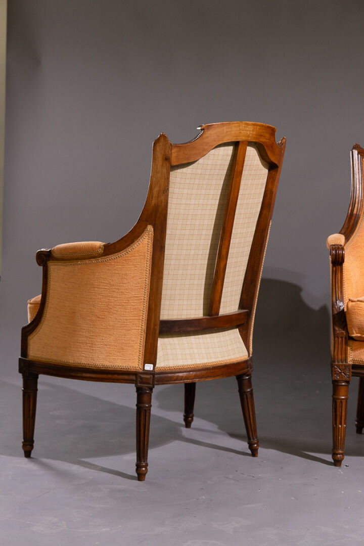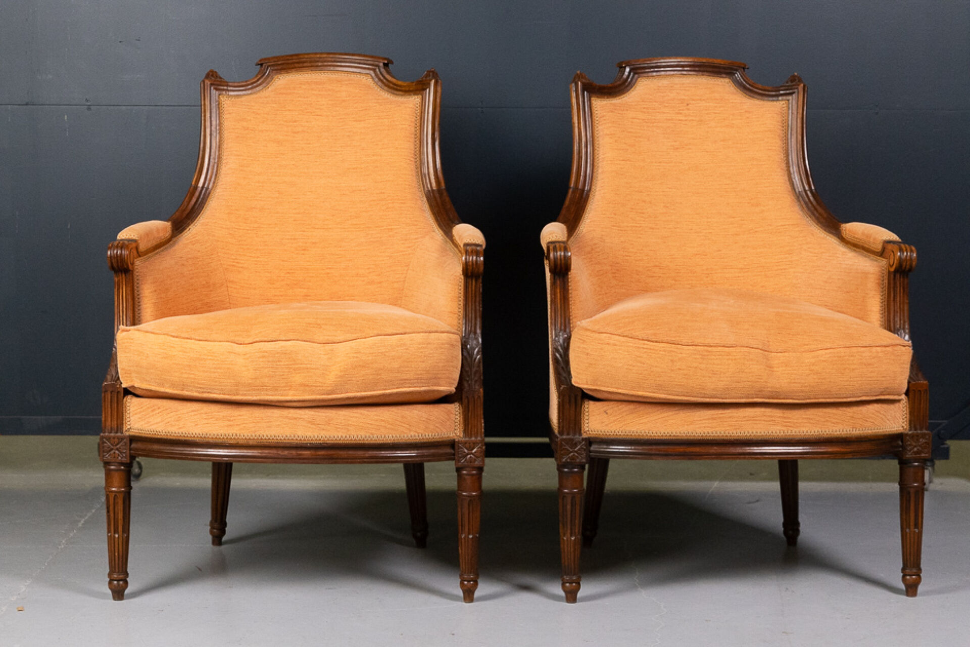 Paire de bergères cabriolet à dossier chapeau de gendarme teinté à la façon de l'acajou, les accotoirs à manchettes, terminés par des enroulements et soulignés d'acanthes stylisées, les pieds fuselés et cannelés, les antérieurs rudentés (restaurations). Époque Louis XVI. Haut. : 101 cm - Larg. : 68 cm - Prof. : 60 cm Garniture de tissu pêche. Provenance : Acheté chez Auguste SEMAIL, Antiquaire, 10, rue du Cherche-Midi - Paris VIe, le 26 février 1958.