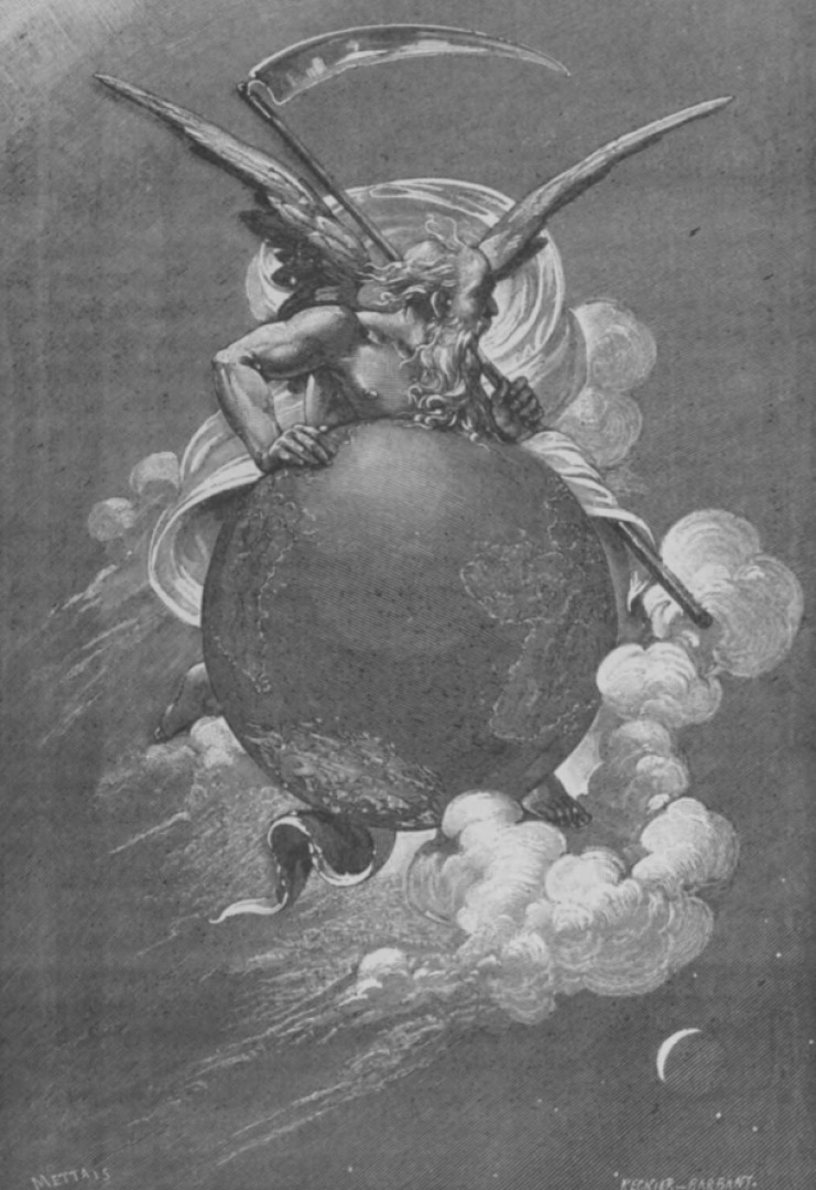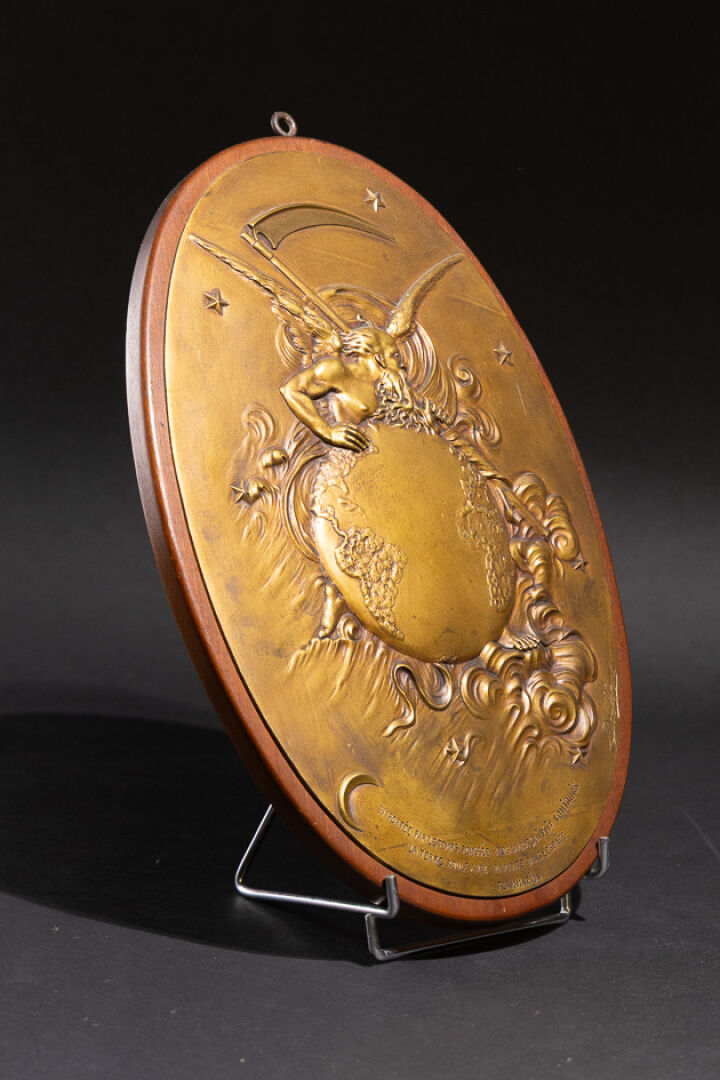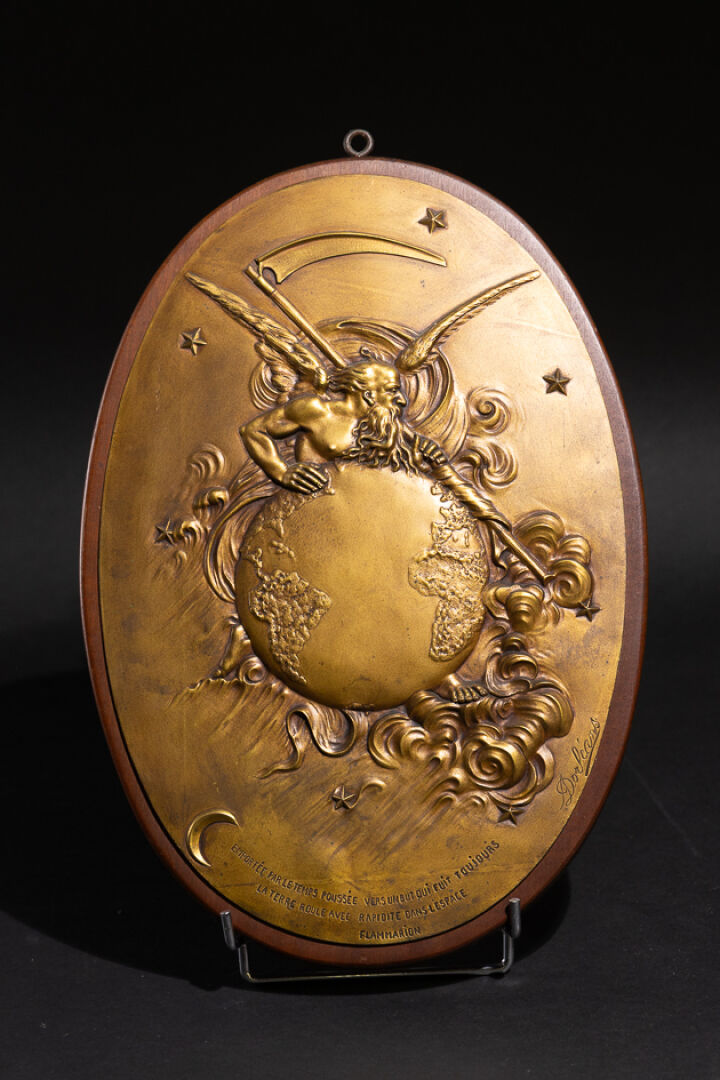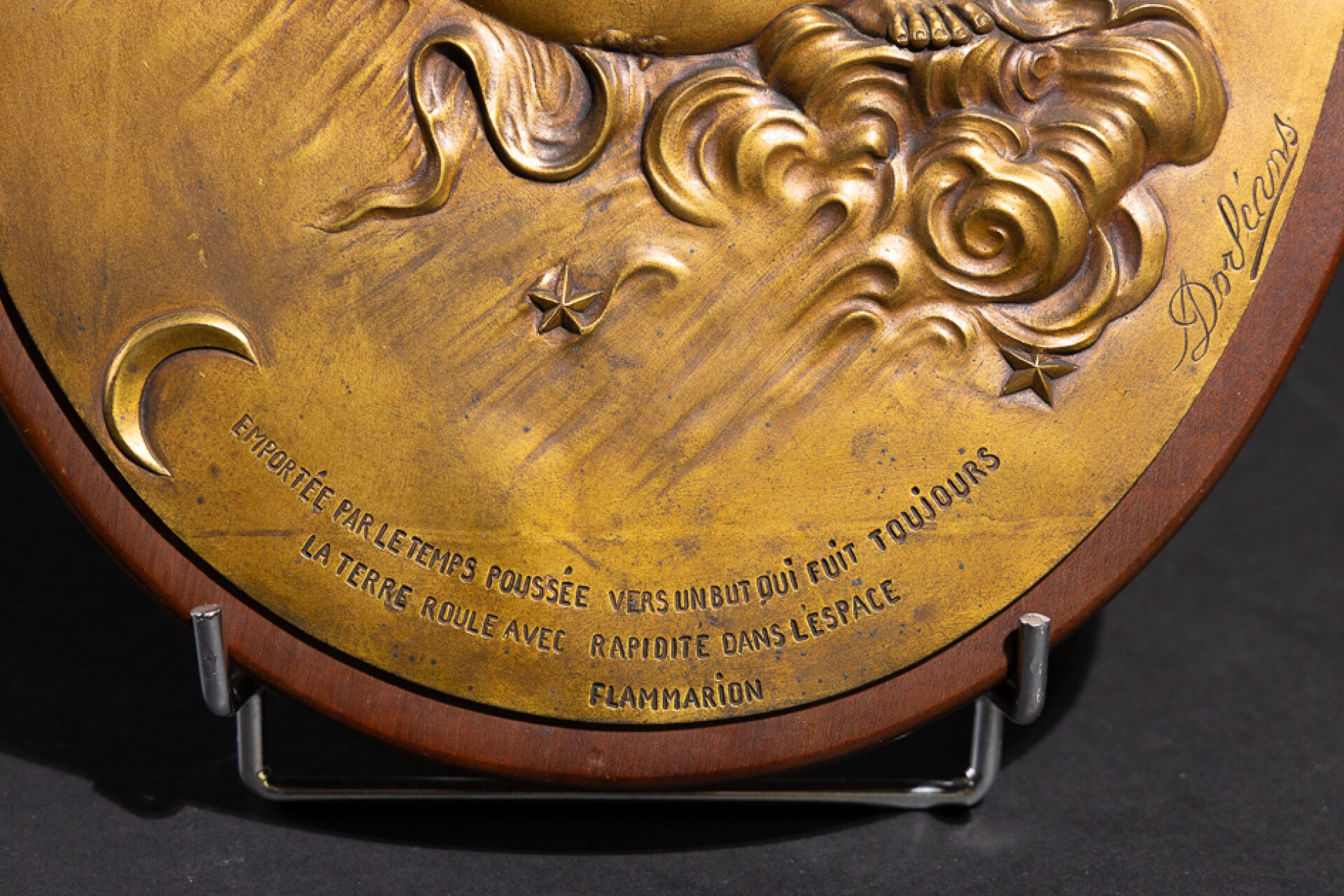 DORLEANS (XIXe siècle). Bas-relief ovale en bronze figurant l'allégorie du Temps, armée de sa faux et d'un globe dans des nuées. La partie basse portant la mention " Emportée par le temps poussée vers un but qui fuit toujours la terre roule avec rapidité dans l'espace" (Camille ) FLAMMARION. Signé. Présenté sur bois. Haut. : 37.5cm - Larg. : 25.5 cm Inspiré du recueil de Camille FLAMMARION "Astronomie populaire" de 1905, notre bas-relief reprend une composition illustrée par REGNIER-BARBANT et METTAIS.