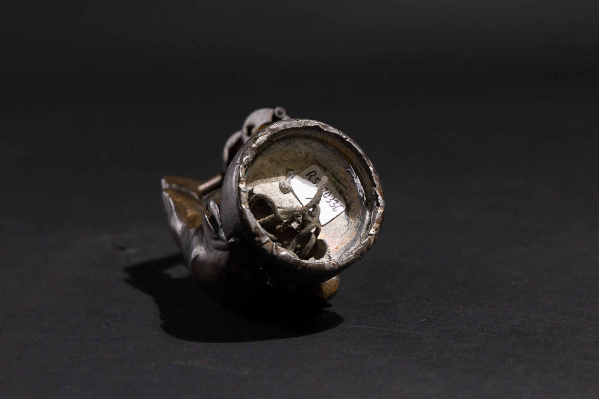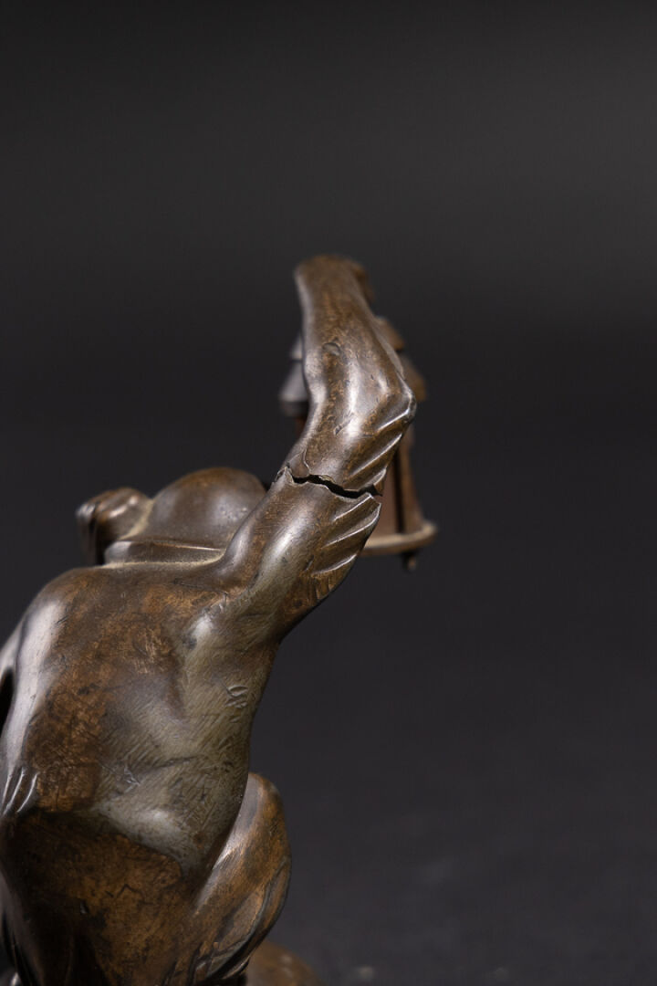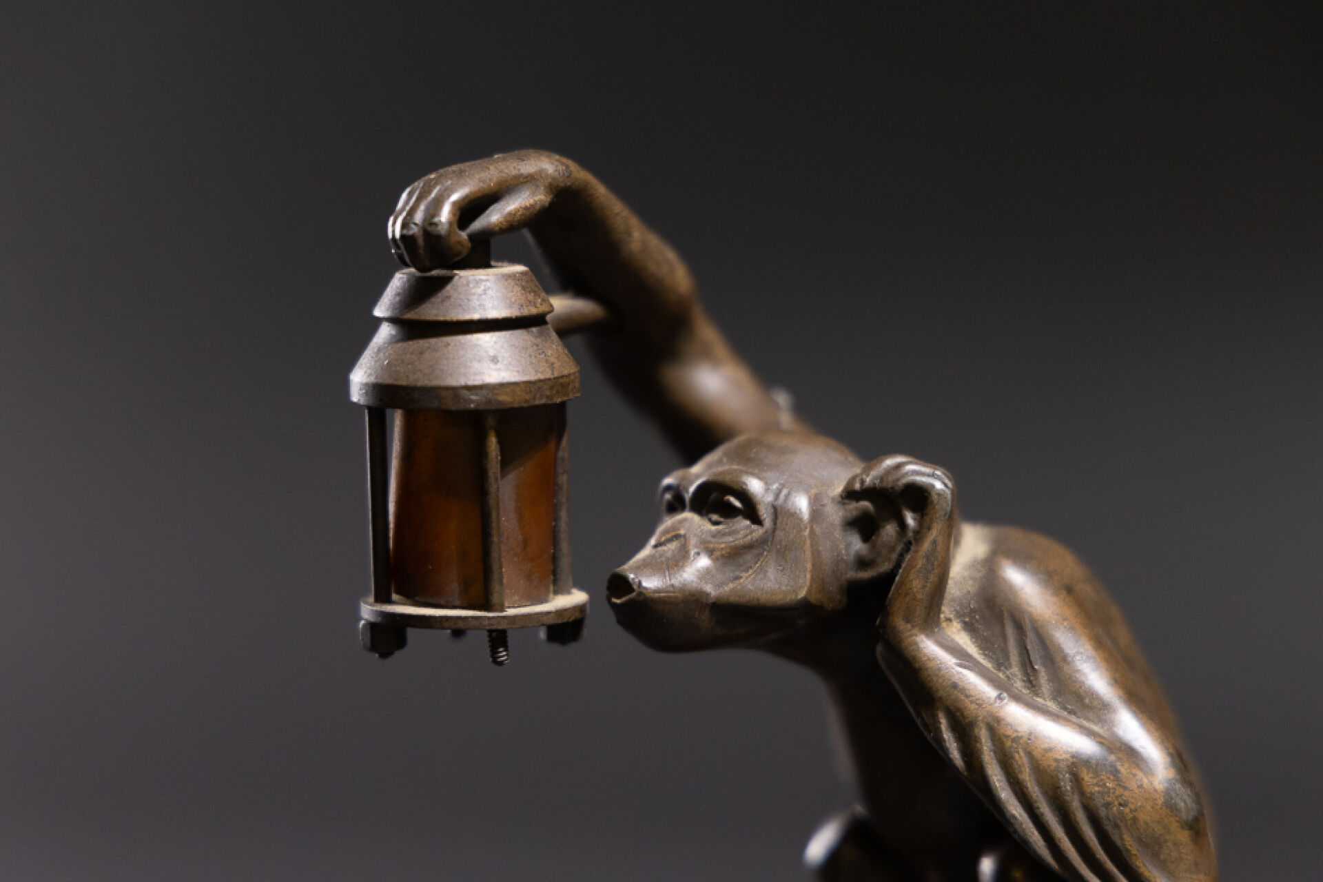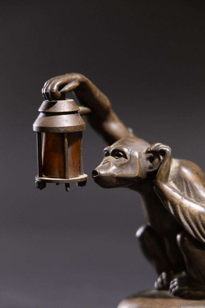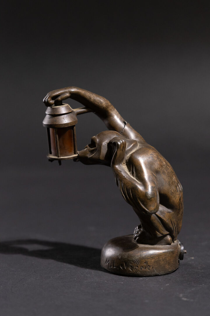 Max LE VERRIER (1891-1973). "Boubou" singe à la lanterne. Veilleuse en régule patinée brun, le singe accroupi porte sa main gauche à l'oreille, son bras droit (cassé) retient une lanterne. Signée sur la terrasse (manques, système électrique dysfonctionnel). Haut. : 14 cm