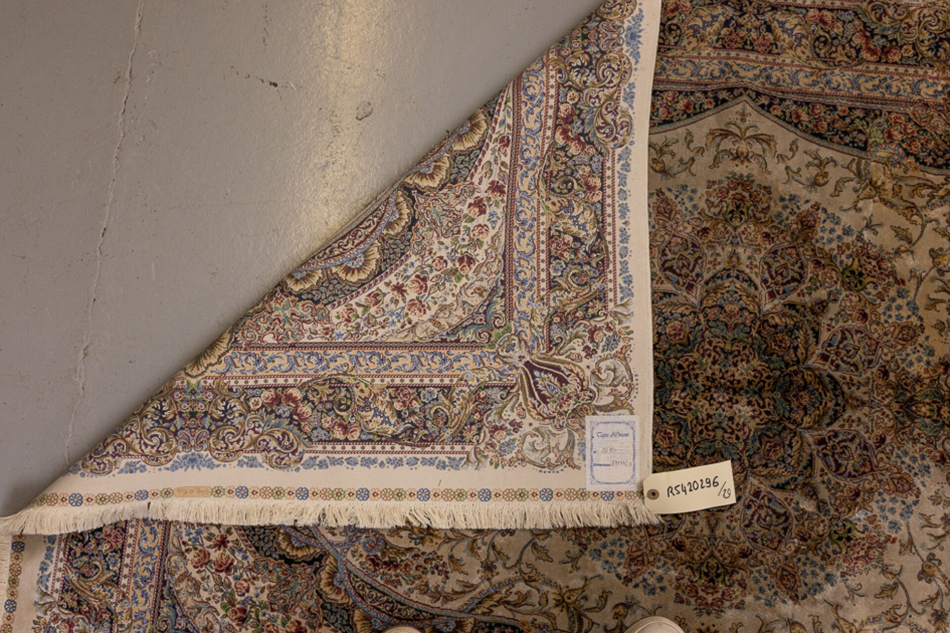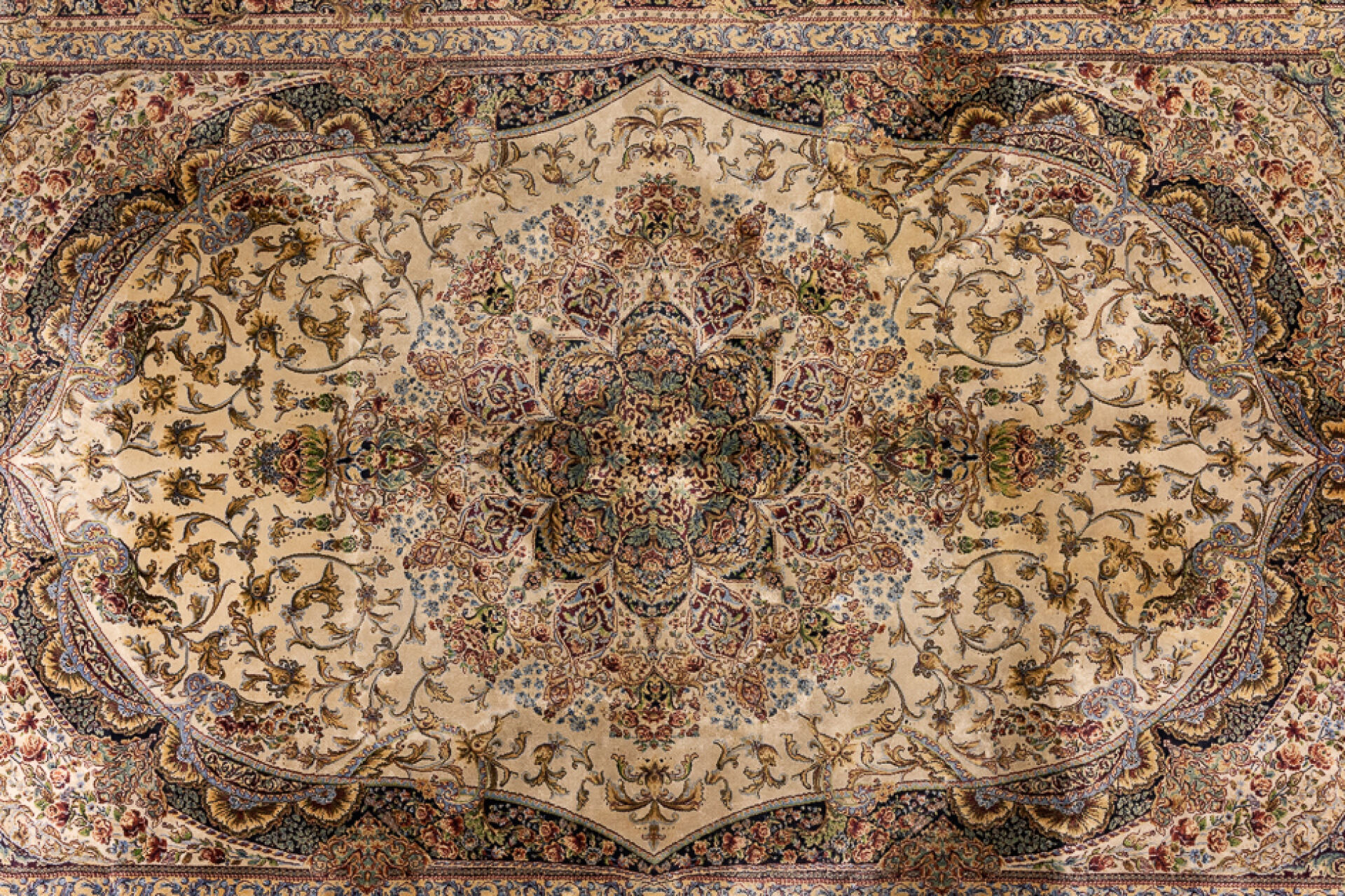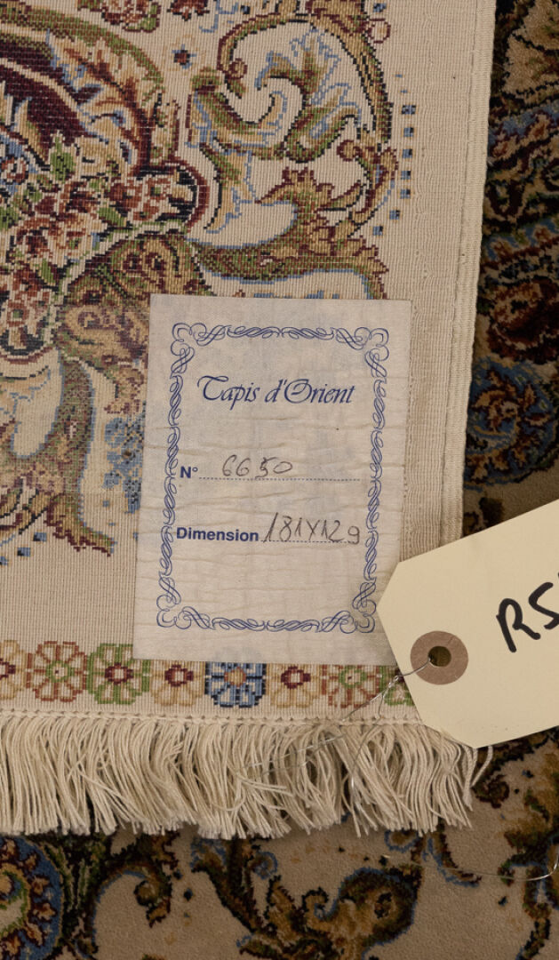 Tapis en soie et laine dans les tons crème, bleu, rouge, à décor polychrome de fleurs, rinceaux feuillagés et volutes, les écoinçons à vases fleuris, le champ central à décor d'une rosace (insolations, taches). XXe siècle. Dim. : 181 X 129 cm