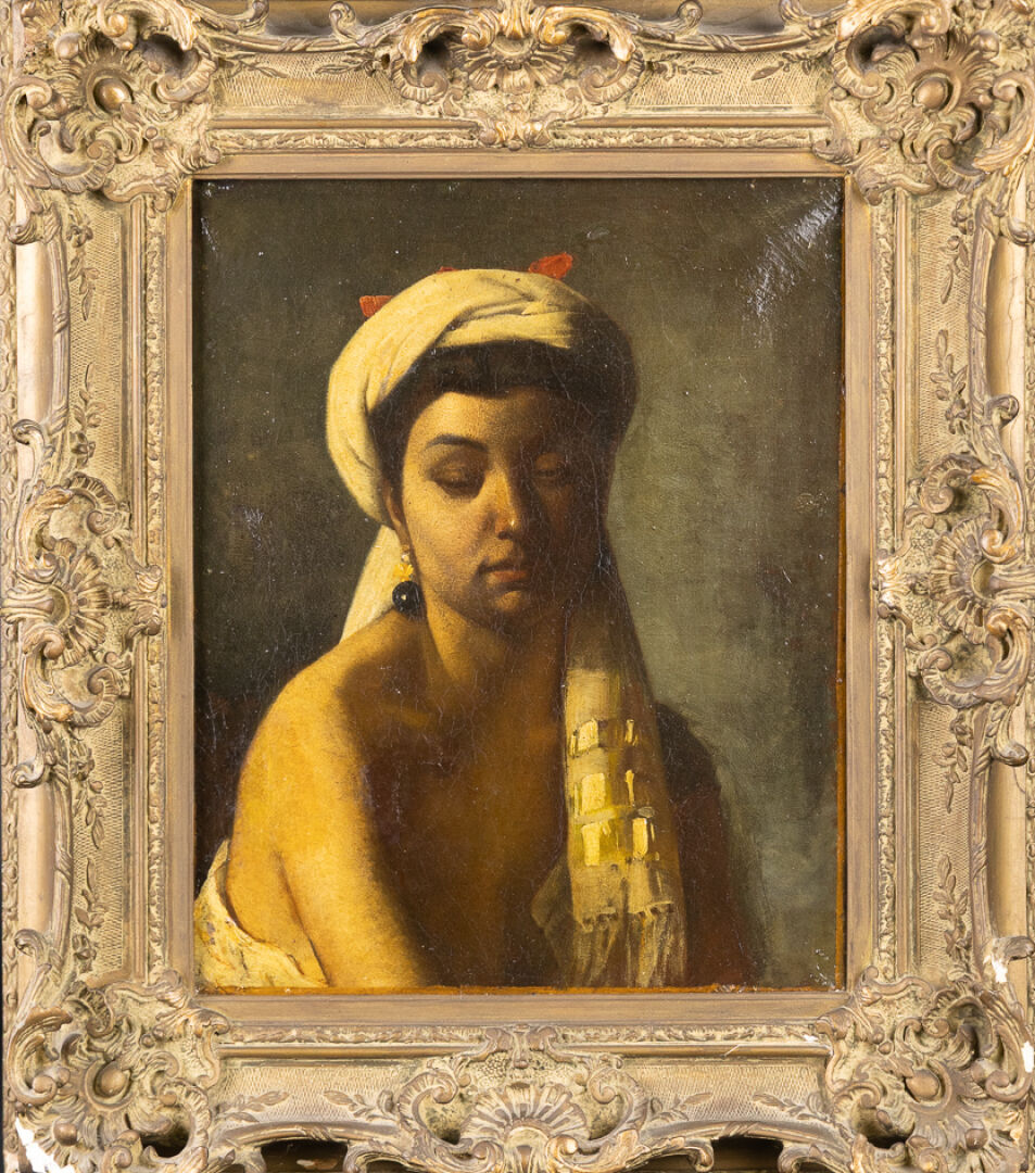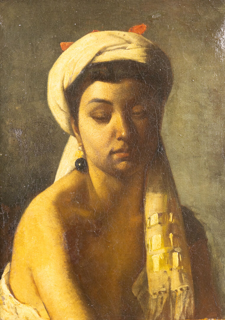 Attribué à Charles-François SELLIER (1830-1882). Femme enturbannée aux boucles d'oreilles. Huile sur toile signée en bas à droite (restaurations). Haut. : 40 cm - Larg. : 32 cm