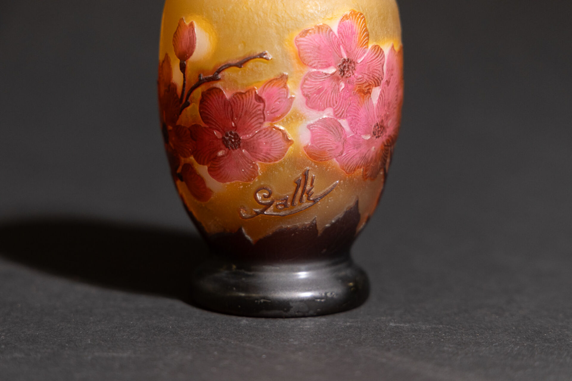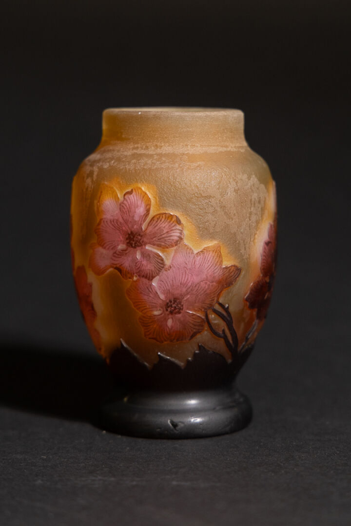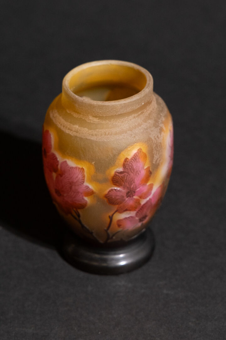 Établissements GALLE. Vase ovoïde sur piédouche en verre multicouches, le décor dégagé à l'acide de feuillages et branches fleuries roses sur fond jaune, signé dans le décor (légères usures). Haut. : 10,5 cm