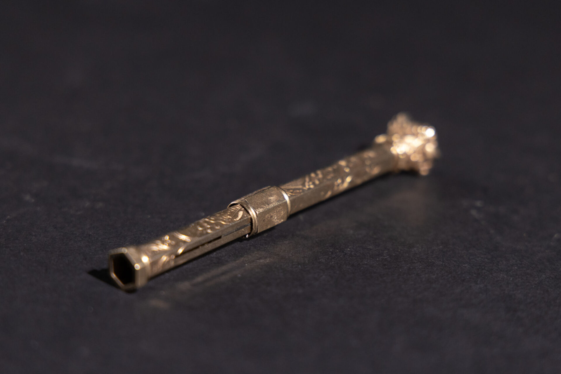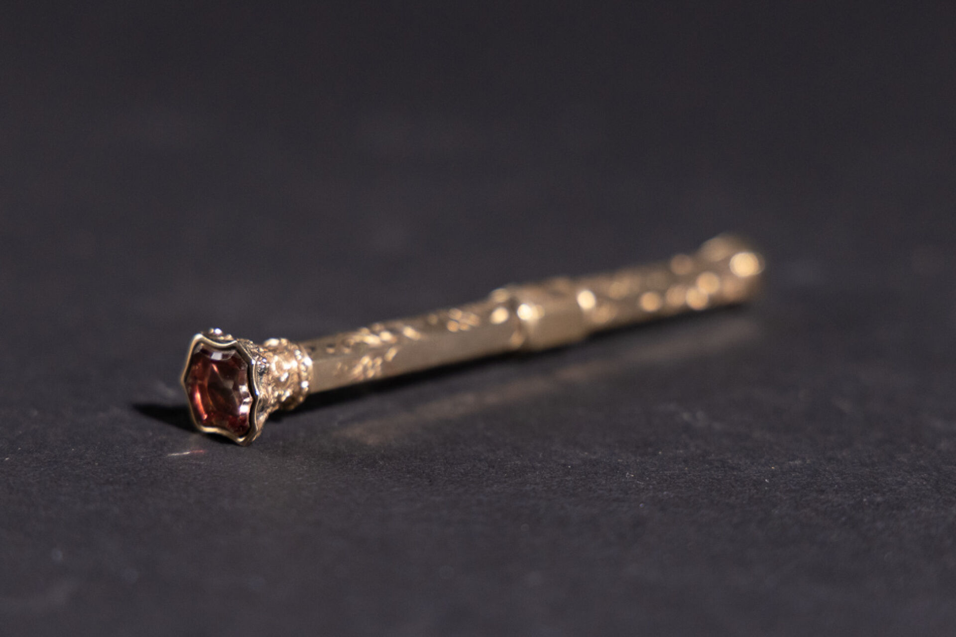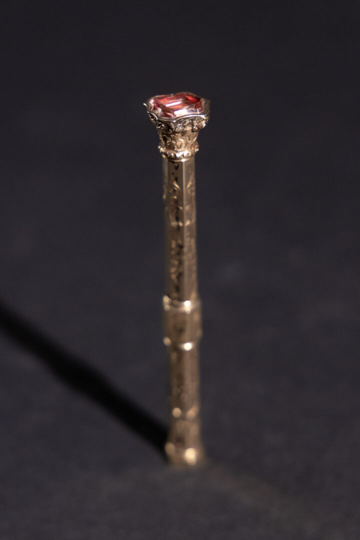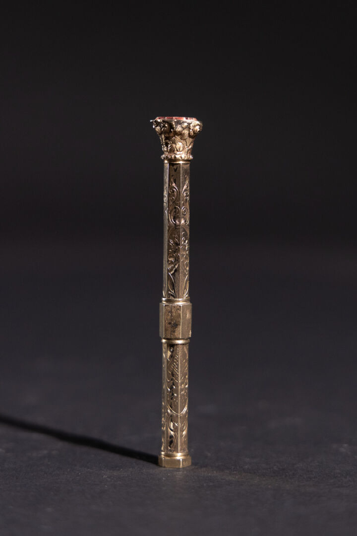 Porte mine en argent 925 millièmes, la tête sertie sur un chapiteau corinthien d'une pierre rose. Vers 1900. Long. : 9.5 cm - Poids : 15.8 g