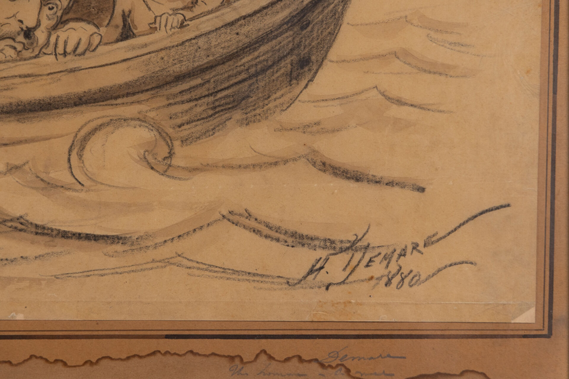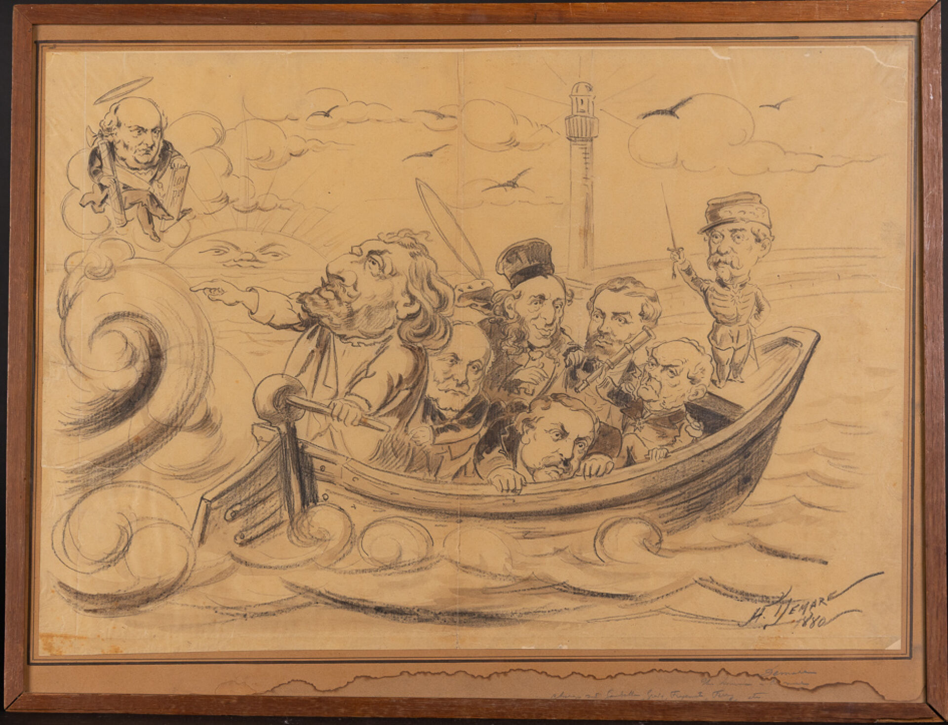 Henri DEMARE (1846-1888). "Un homme à la mer". Caricature au fusain signée, annotée, datée 1880 en bas à droite figurant à la manière du Christ dans la tempête des hommes politiques de la IIIe République dont Jules Ferry, Léon Gambetta, Jules Grévy (insolation, pliures, déchirures, auréoles). Haut. : 43 cm - Larg. : 62 cm Expertise réalisée par Monsieur Pascal GUILLEBAUD