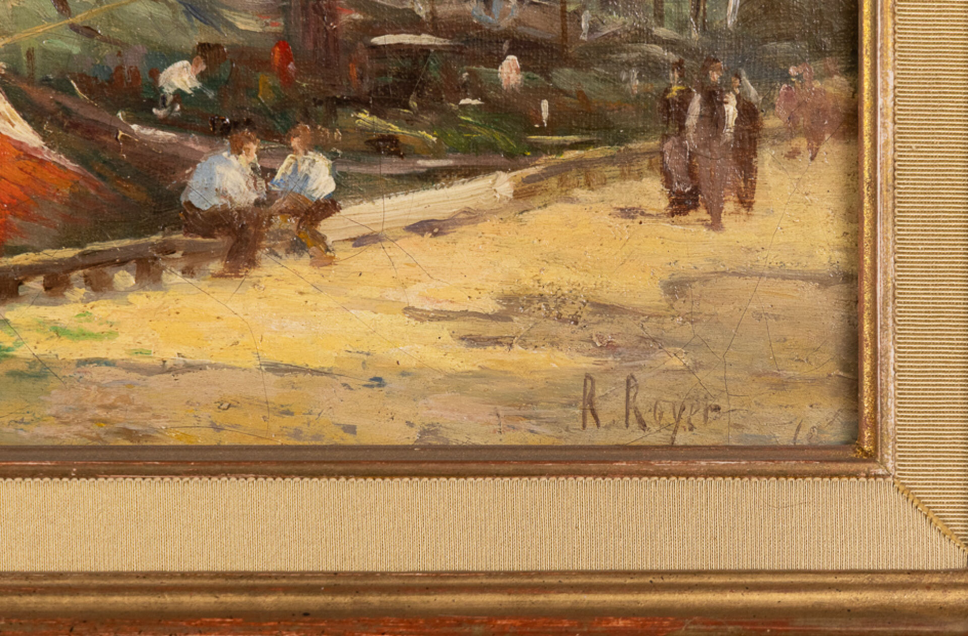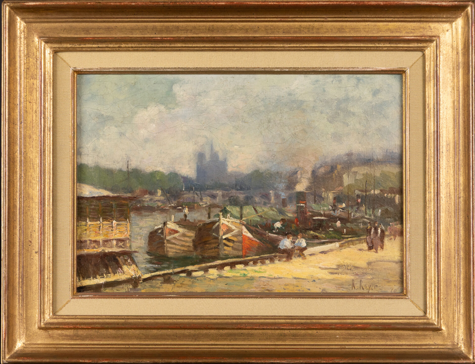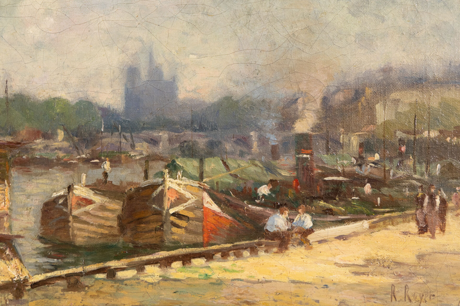 R.ROYER (XIX-XXe siècle). Vue des quais de Seine à Paris, Notre-Dame en arrière-plan. Huile sur toile, signée en bas à droite, étiquette au revers. Haut. : 24.5 cm - Larg. : 35 cm
