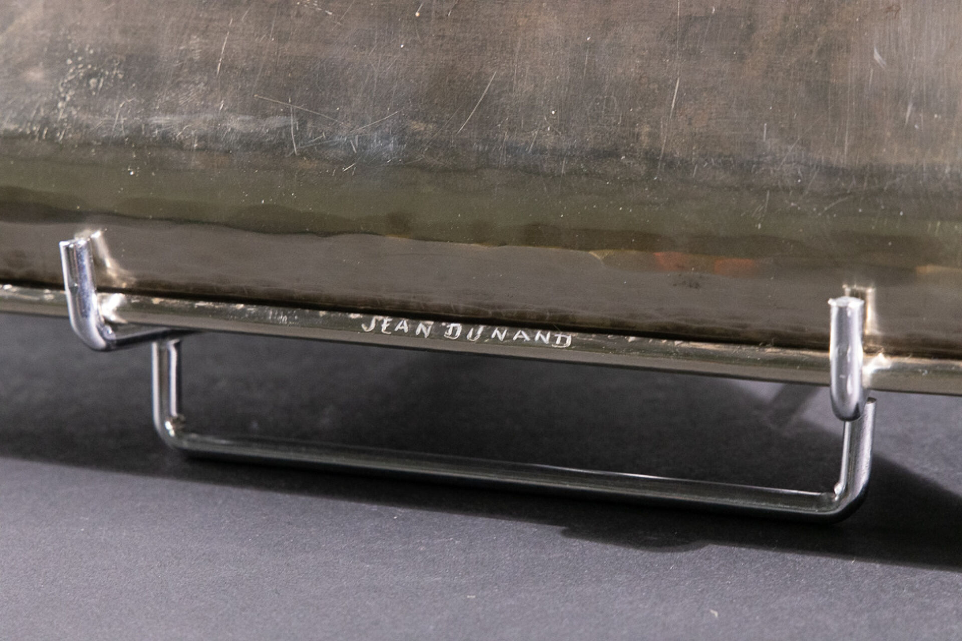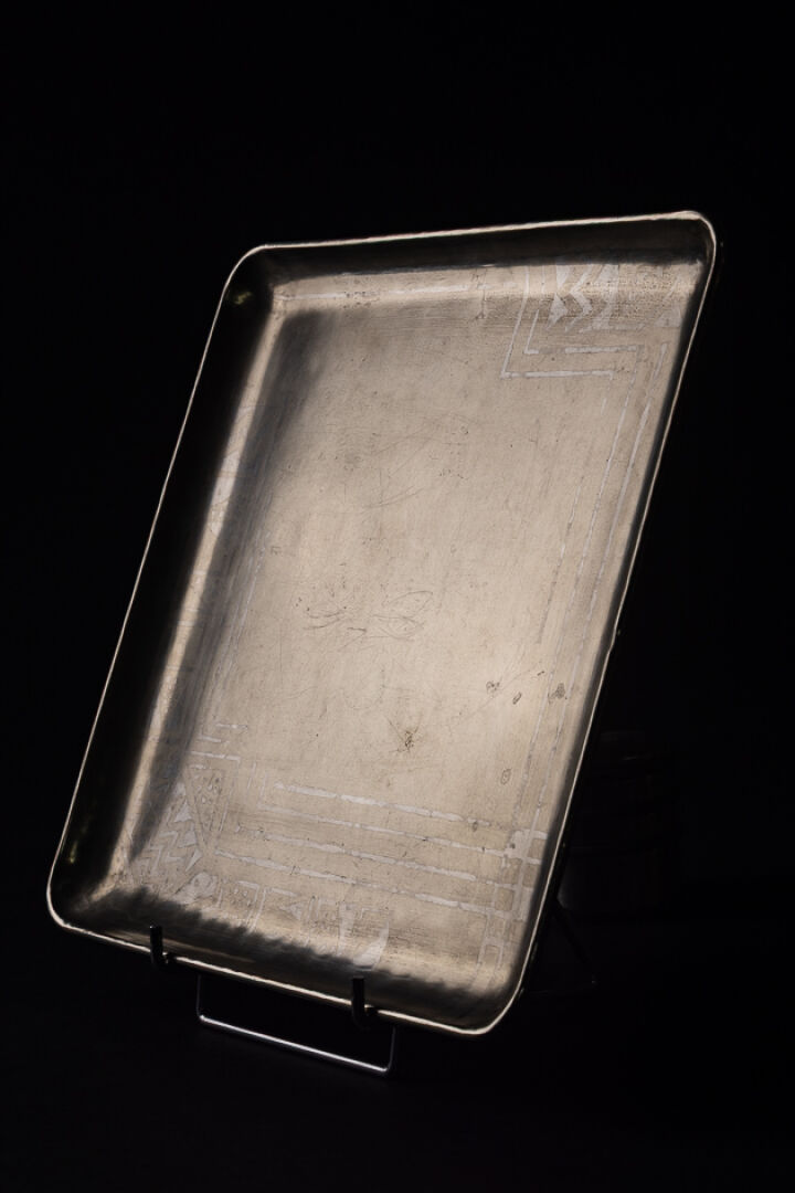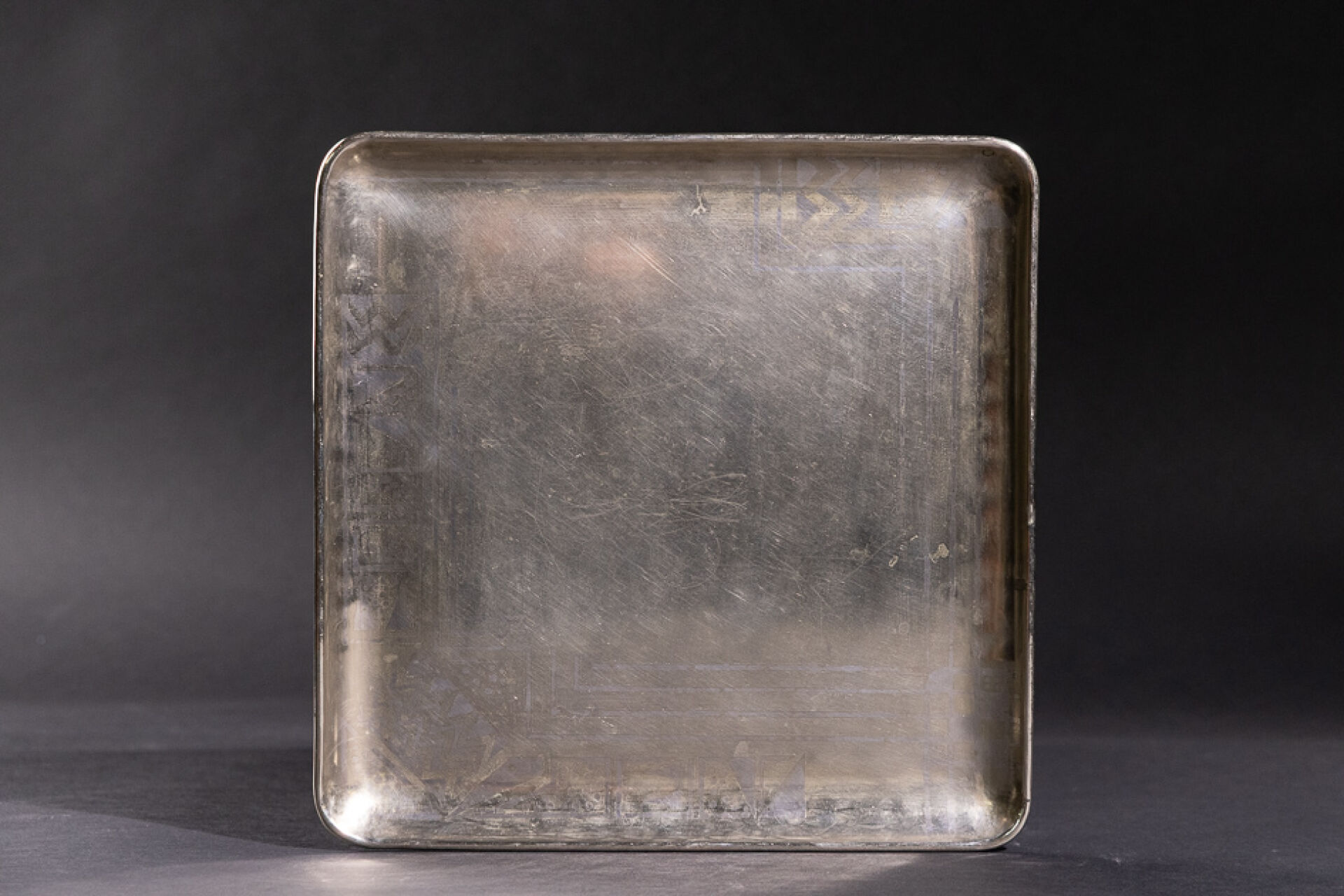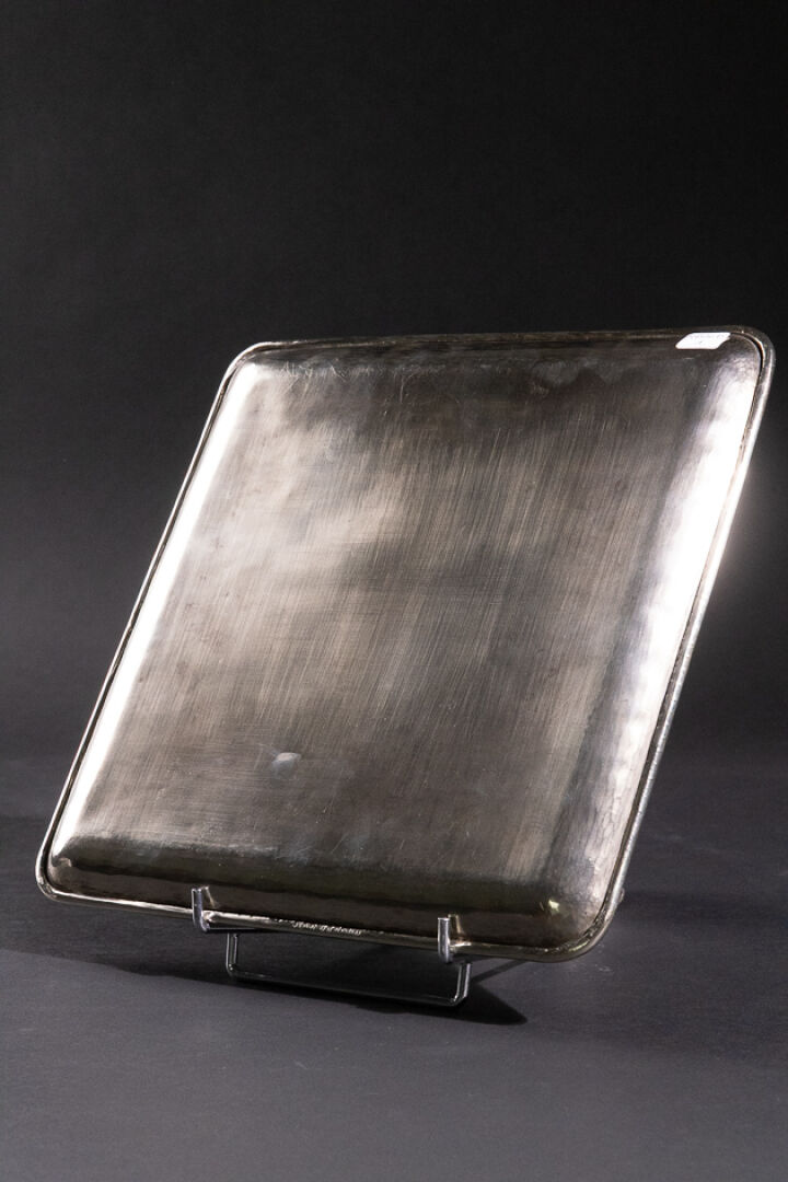 Jean DUNAND (1877-1942). Plateau carré en dinanderie de métal argenté à décor géométrique (usures, chocs). La bordure ourlée. Signé au revers. Vers 1925. Côté : 31.5 cm Formé initialement à la sculpture, Dunand découvre la dinanderie grâce à Émile Decœur et se spécialise dans le travail du cuivre et du laiton martelé en y apportant une dimension moderne. Il participe au projet de paquebots comme le Normandie.
