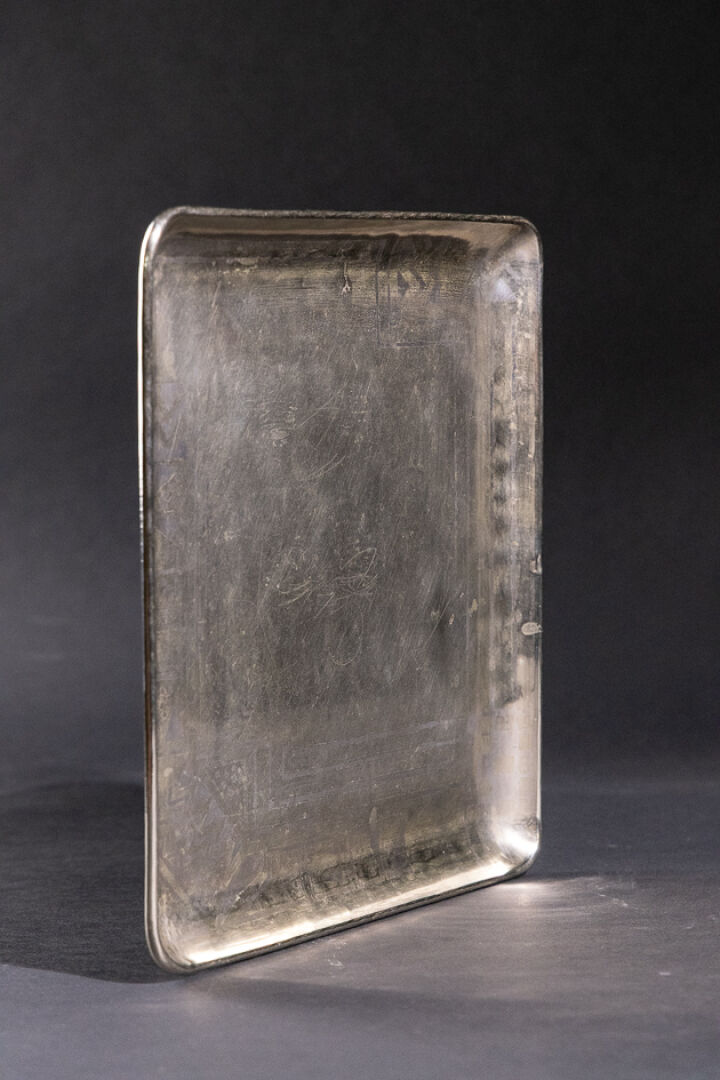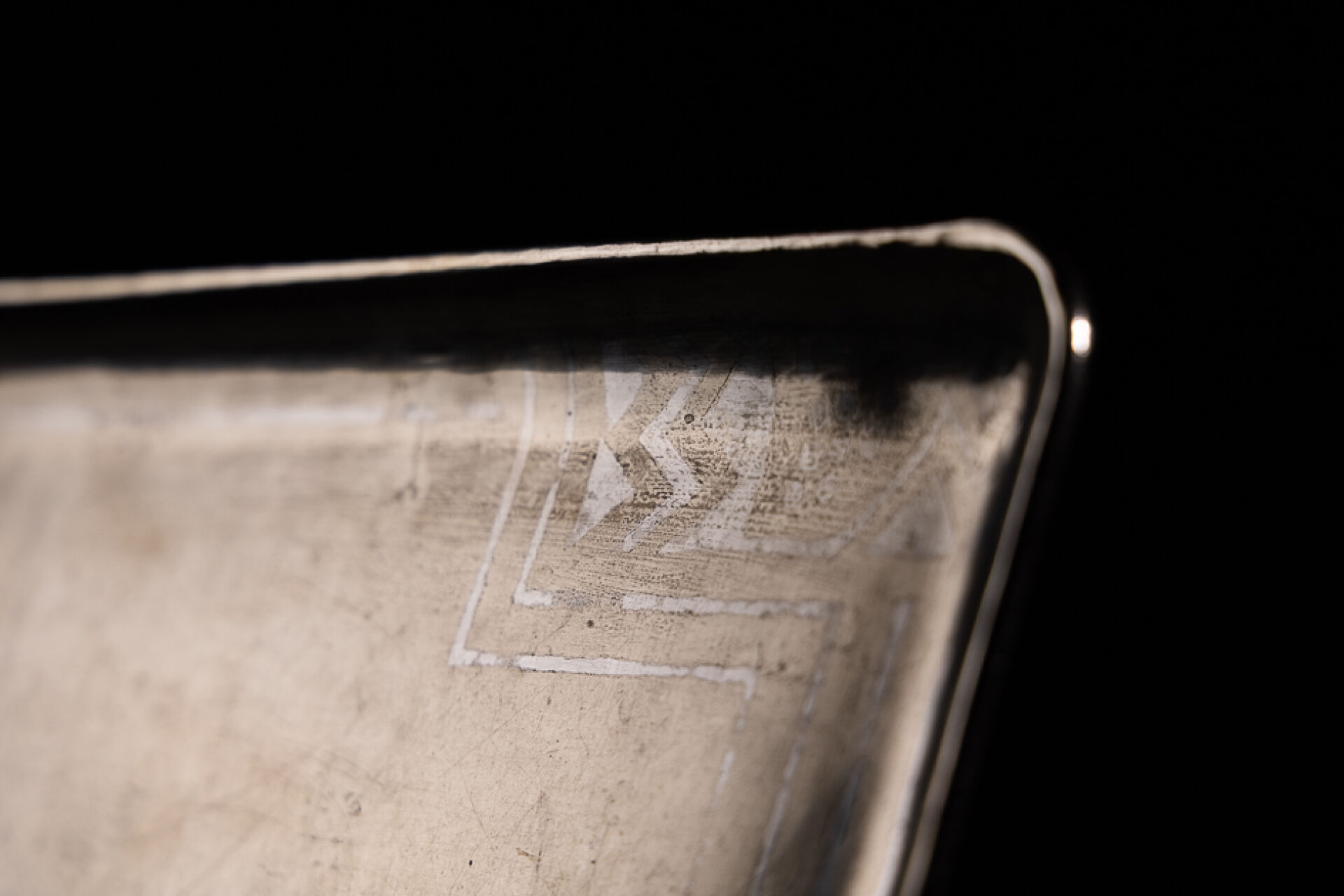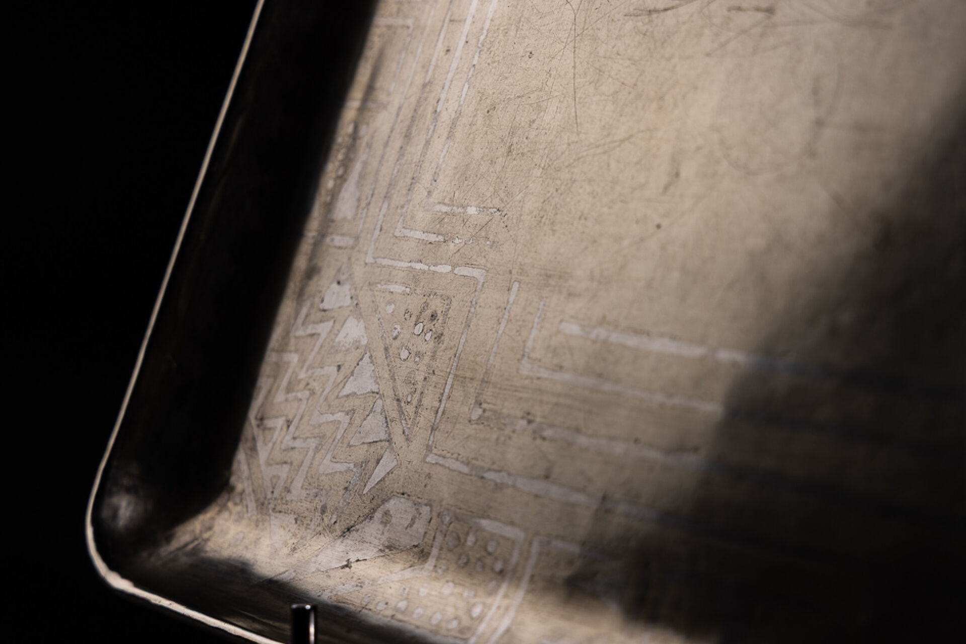 Jean DUNAND (1877-1942). Plateau carré en dinanderie de métal argenté à décor géométrique (usures, chocs). La bordure ourlée. Signé au revers. Vers 1925. Côté : 31.5 cm Formé initialement à la sculpture, Dunand découvre la dinanderie grâce à Émile Decœur et se spécialise dans le travail du cuivre et du laiton martelé en y apportant une dimension moderne. Il participe au projet de paquebots comme le Normandie.
