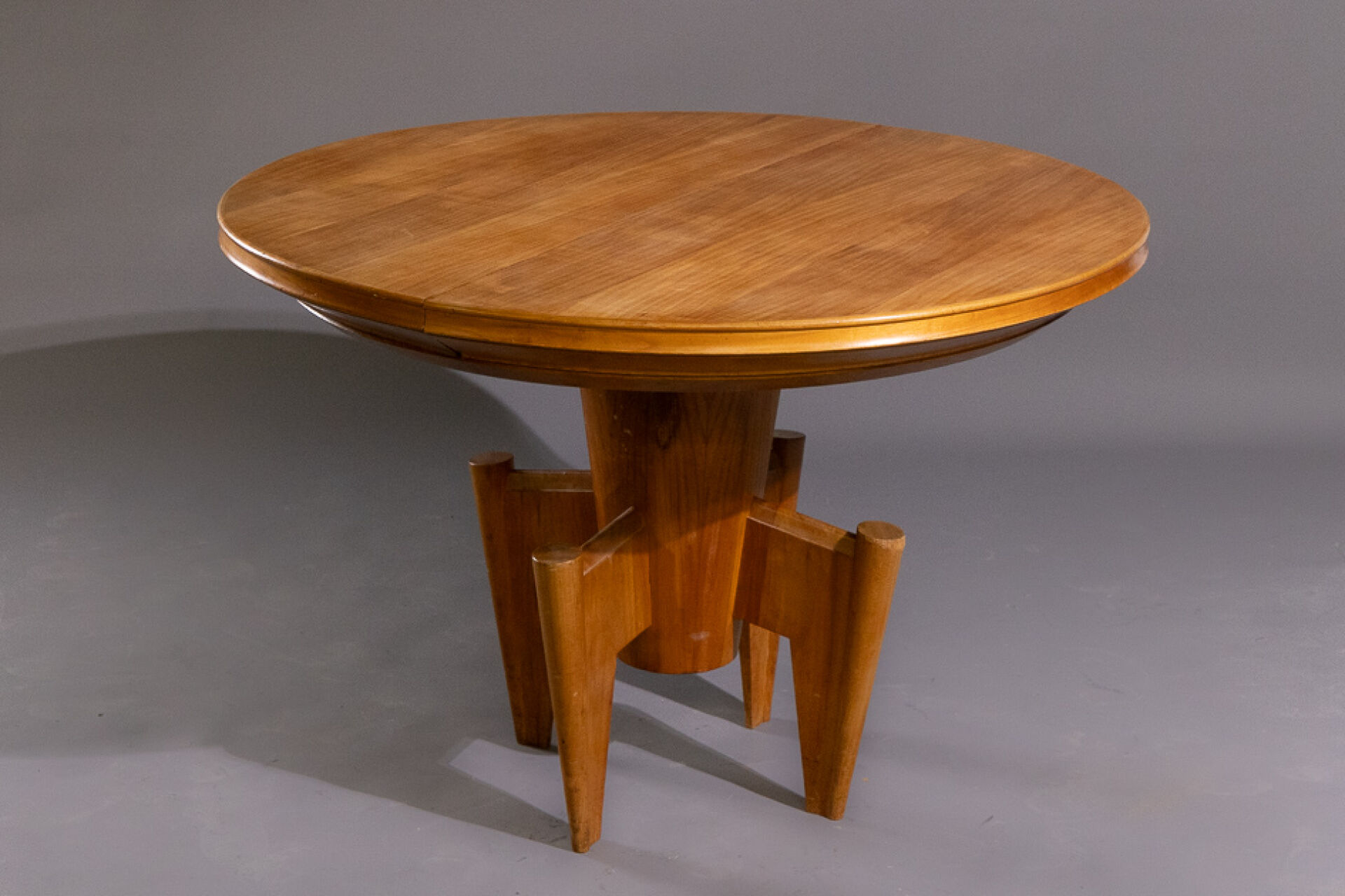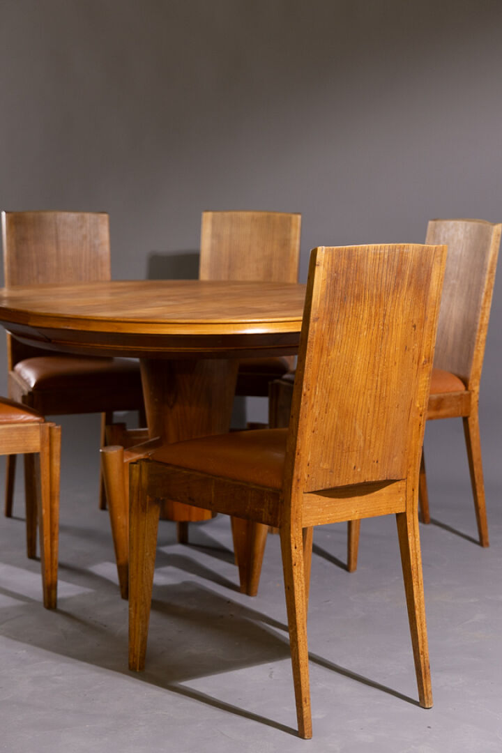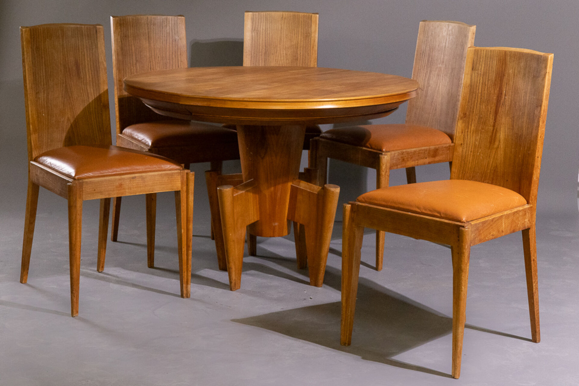 Maison Yvonnick RUAL Mobilier de salle à manger en hêtre et chêne comprenant : - Table à plateau circulaire à trois allonges et piètement quadripode dit spoutnik (insolation et petits accidents d'usage). Haut. : 72.5 cm - Larg. : 105 cm - Larg. : déployée : 257 cm - Dim. de chaque allonge : 50 cm - Suite de cinq chaises à l'assise anciennement cannée, le dossier cabriolet plein, les pieds antérieurs fuselés arrondis. Assise havane (petits accidents d'usage et restaurations). Haut. : 91.5 cm - Larg. : 48 cm - Prof. : 46 cm Vers 1955. Provenance : Succession de Monsieur Yvonnick RUAL puis par descendance. "Je ne fais pas de meubles mais des structures de rangement conçues comme des sculptures" C'est ainsi qu'Yvonnick Rual voyait son travail. Pour cet ébéniste issu d'une grande lignée le travail du bois n'avait pas de secret après sa formation aux Beaux-Arts de Rennes, Nantes, Paris. Tantôt traditionnel sublimant le bois, tantôt très contemporain mélangeant le formica, le verre fumé ou l'aluminium Yvonnick Rual créé des meubles uniques si bien que Ouest France évoquait l'artisan comme le seul "créateur(s) inventeur(s)de forme vraiment inédites dans le domaine de l'ébénisterie "de Bretagne. Installé rue de la Motte Chancelier à Rennes il expose ses œuvres accompagnées de paysages de Pierre Gilles.