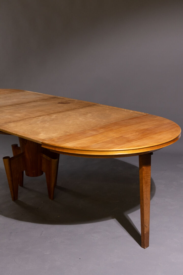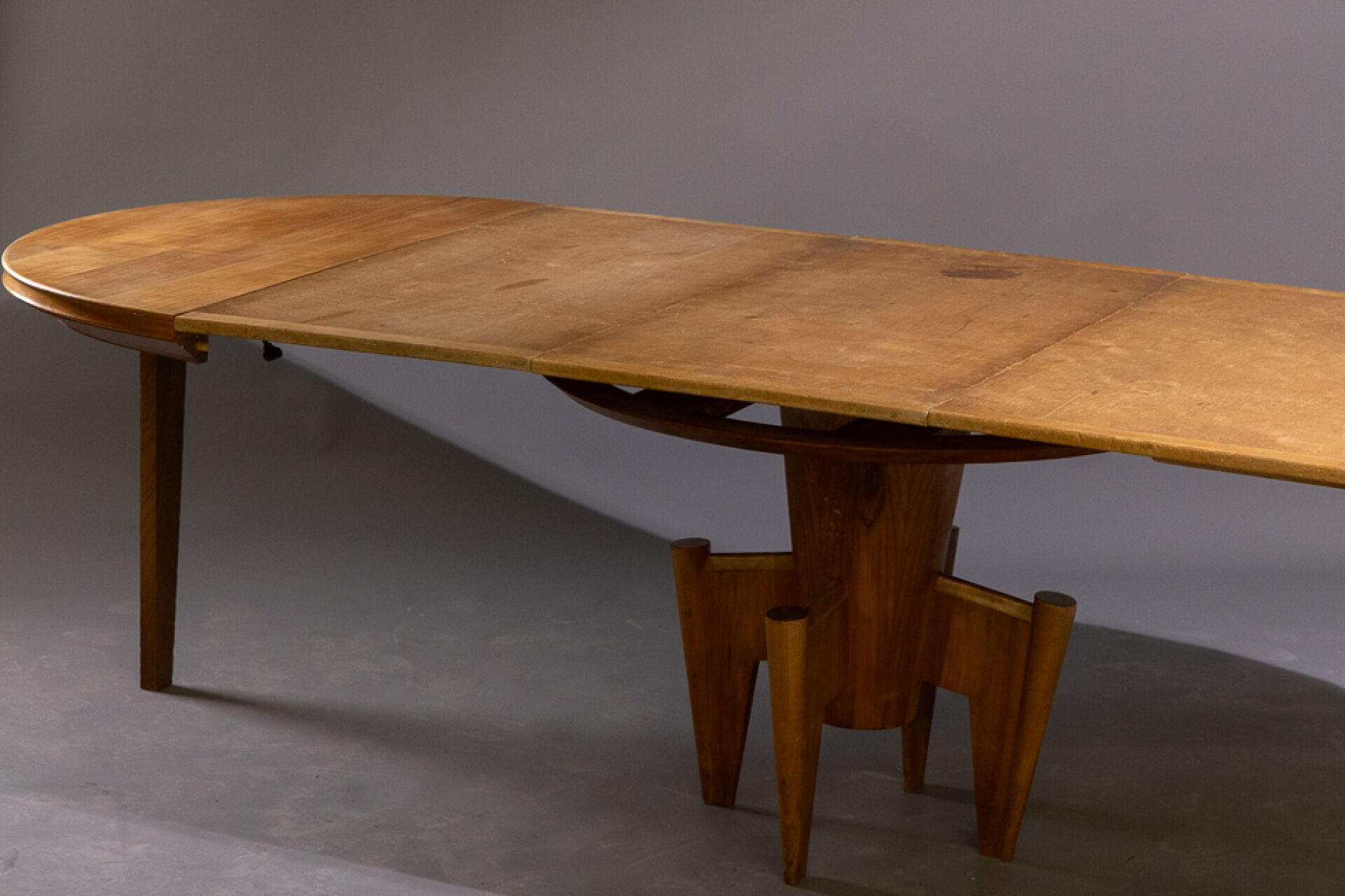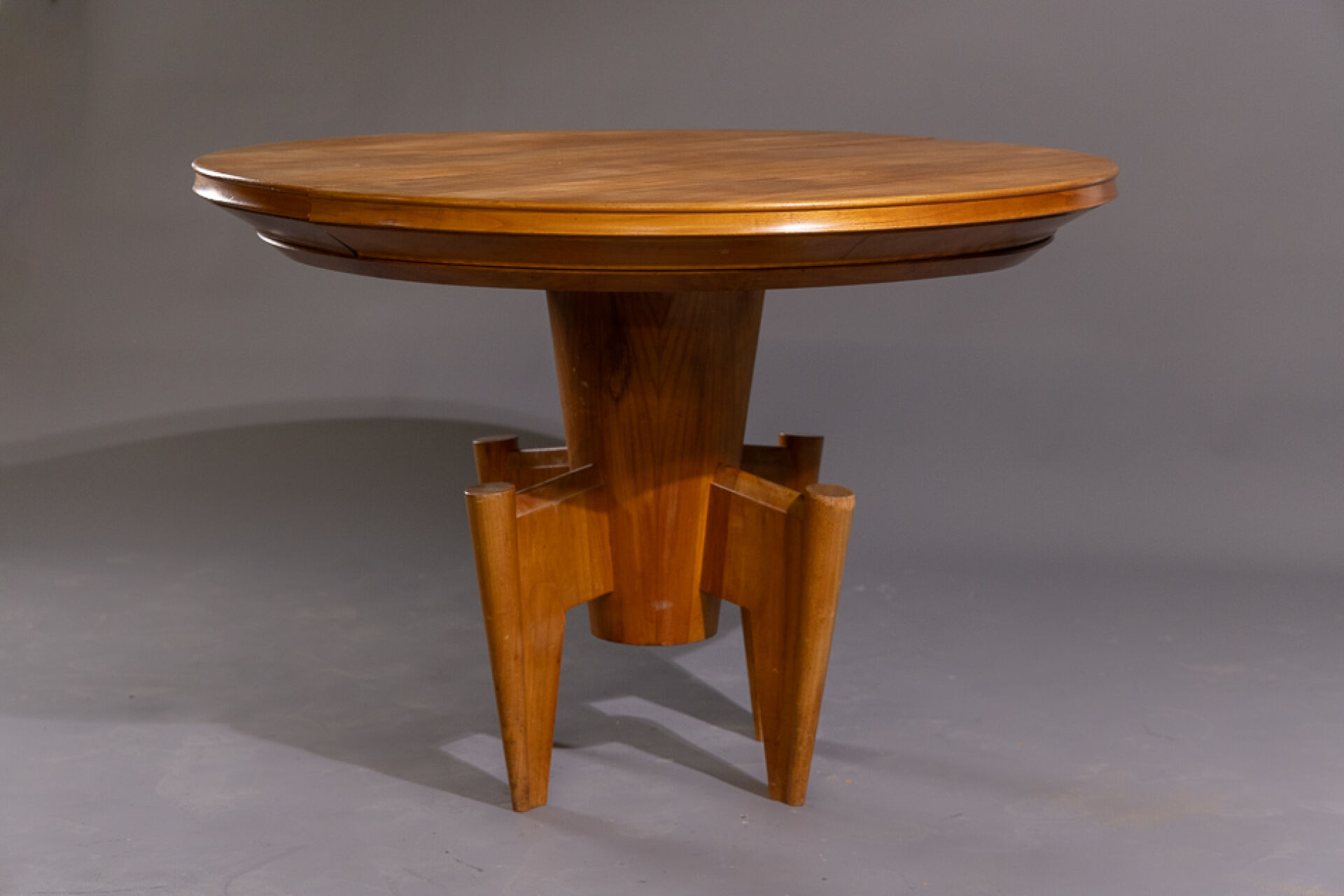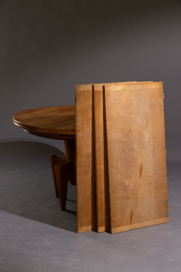 Maison Yvonnick RUAL Mobilier de salle à manger en hêtre et chêne comprenant : - Table à plateau circulaire à trois allonges et piètement quadripode dit spoutnik (insolation et petits accidents d'usage). Haut. : 72.5 cm - Larg. : 105 cm - Larg. : déployée : 257 cm - Dim. de chaque allonge : 50 cm - Suite de cinq chaises à l'assise anciennement cannée, le dossier cabriolet plein, les pieds antérieurs fuselés arrondis. Assise havane (petits accidents d'usage et restaurations). Haut. : 91.5 cm - Larg. : 48 cm - Prof. : 46 cm Vers 1955. Provenance : Succession de Monsieur Yvonnick RUAL puis par descendance. "Je ne fais pas de meubles mais des structures de rangement conçues comme des sculptures" C'est ainsi qu'Yvonnick Rual voyait son travail. Pour cet ébéniste issu d'une grande lignée le travail du bois n'avait pas de secret après sa formation aux Beaux-Arts de Rennes, Nantes, Paris. Tantôt traditionnel sublimant le bois, tantôt très contemporain mélangeant le formica, le verre fumé ou l'aluminium Yvonnick Rual créé des meubles uniques si bien que Ouest France évoquait l'artisan comme le seul "créateur(s) inventeur(s)de forme vraiment inédites dans le domaine de l'ébénisterie "de Bretagne. Installé rue de la Motte Chancelier à Rennes il expose ses œuvres accompagnées de paysages de Pierre Gilles.