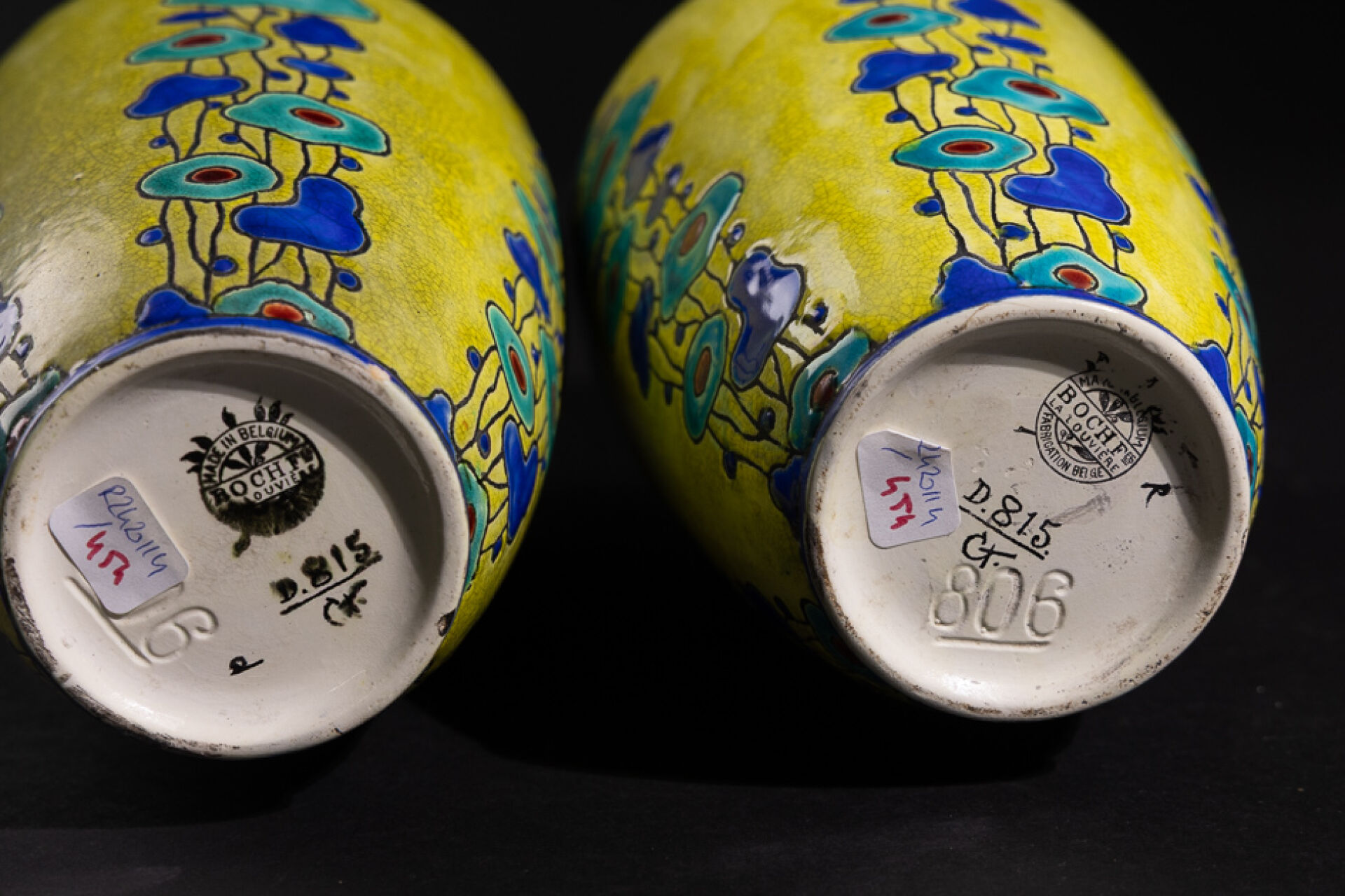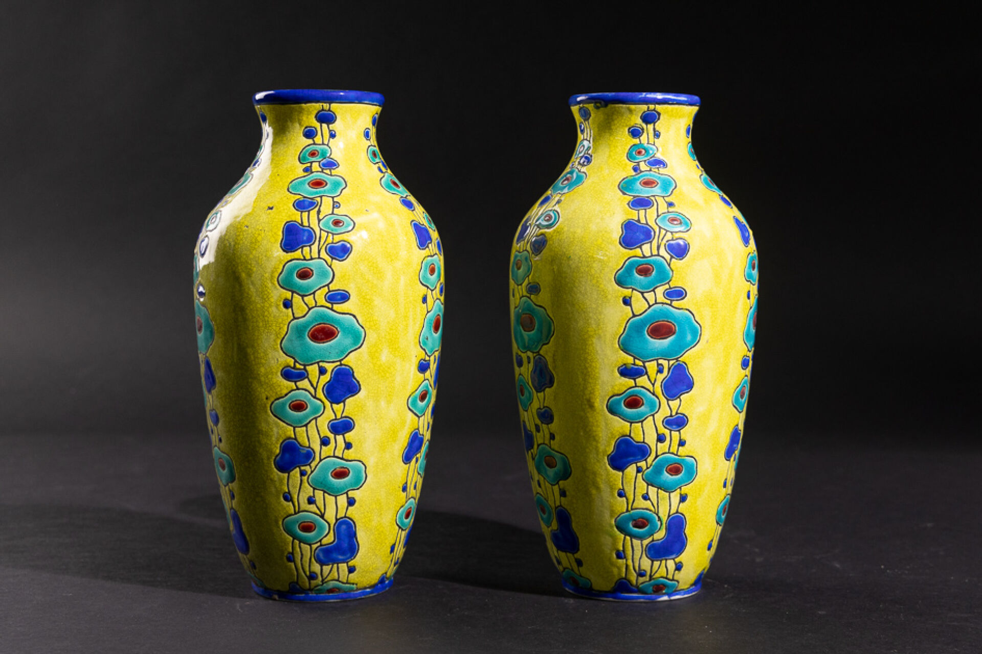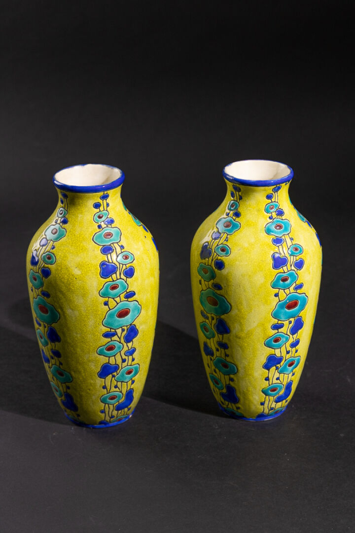 Charles CATTEAU (1880-1966) pour BOCH FRÈRES LA LOUVIÈRE. Paire de vases à petit col évasé en faïence craquelée à fond jaune, ornée d'un décor d'émaux en relief de chutes de fleurs stylisées, bleue turquoise, ocre et bleu roi. Marque au cachet noir, numéroté en creux "806" et en noir "D.815" CT. Vers 1930. Haut. : 28 cm