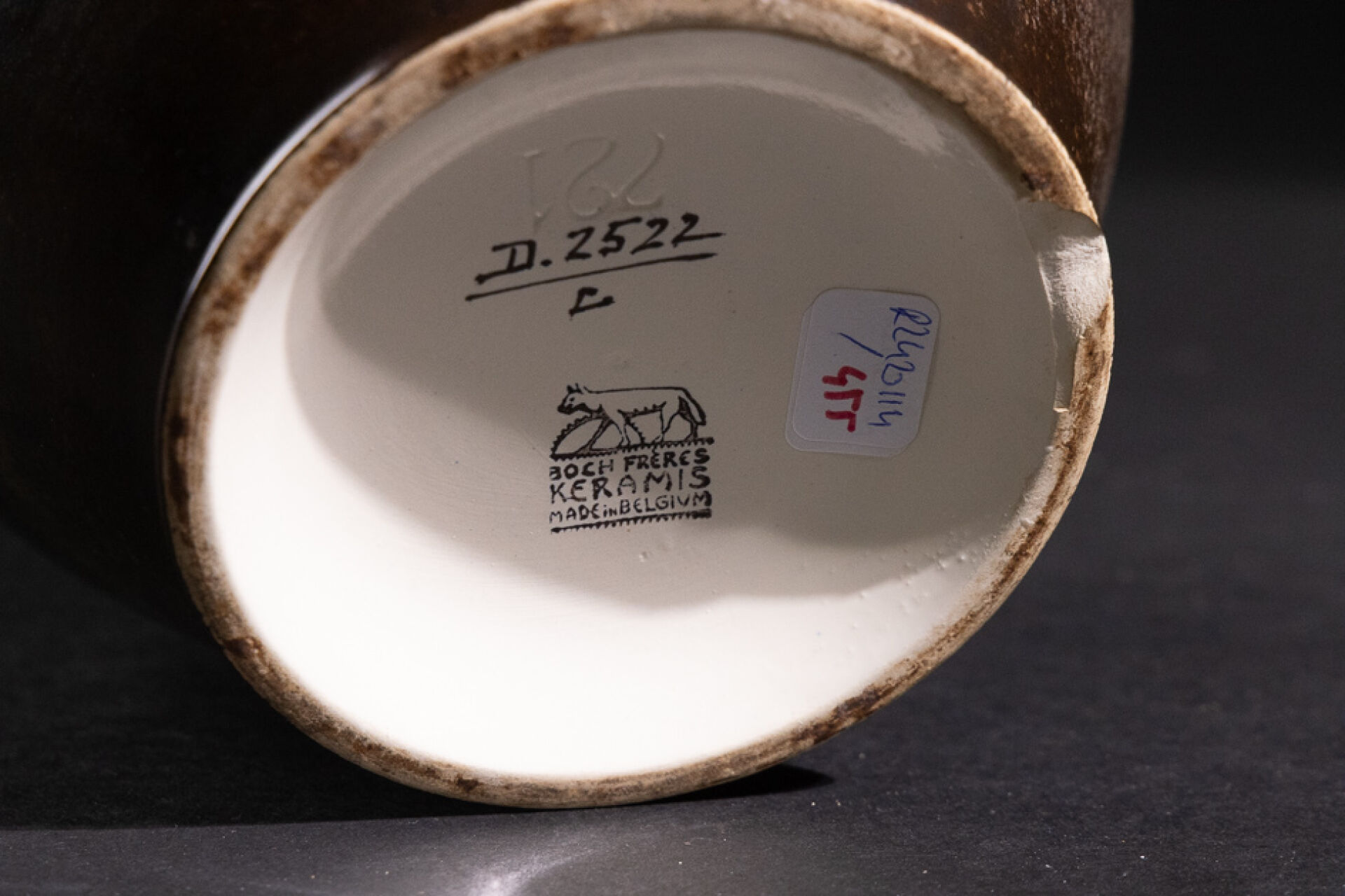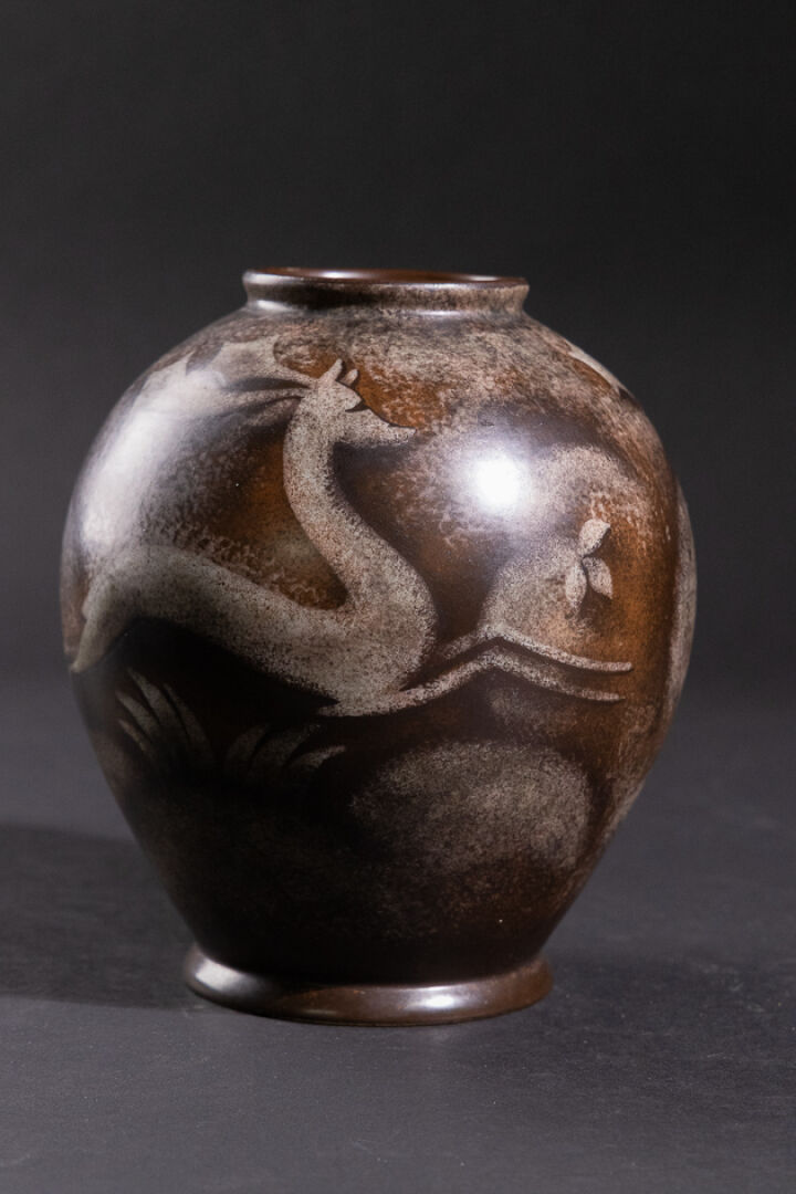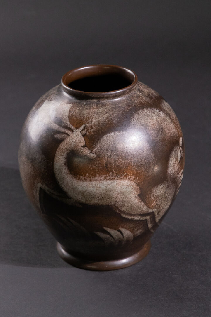 BOCH FRÈRES- KÉRAMIS Vase en faïence de forme oblong sur talon et petit col à décor émaillé dans les tons brun et gris de cervidés courant. Marqué au revers, numéroté en creux 221 pour la forme et D. 2522 pour le décor (éclat au pied). Haut. : 23 cm