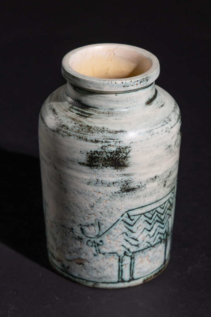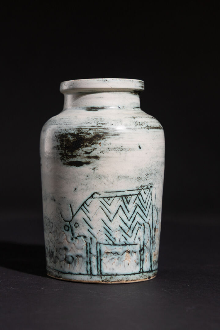 Jacques BLIN (1920-1995). Vase à petit col ourlé en céramique émaillée à décor incisé de taureaux, signé et numéroté au revers (fêles au col). Haut. : 17,5 cm