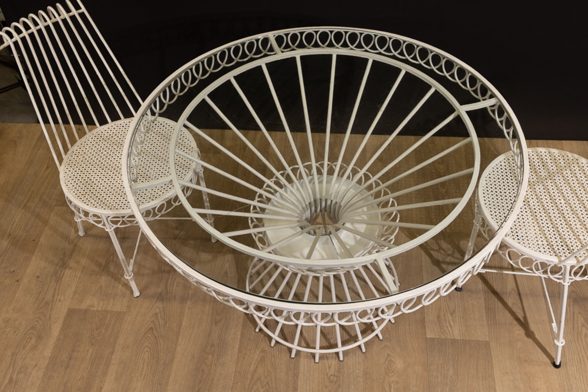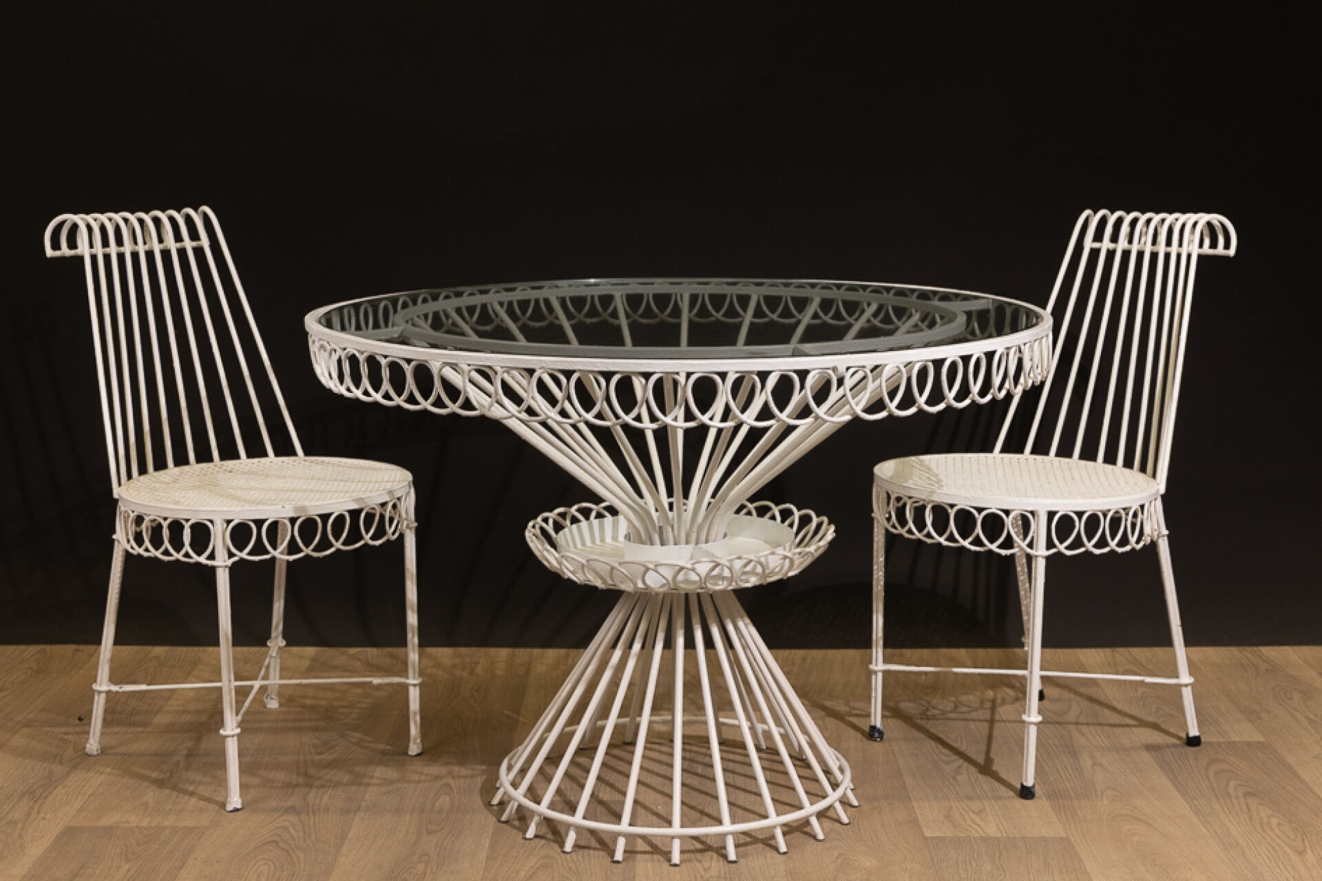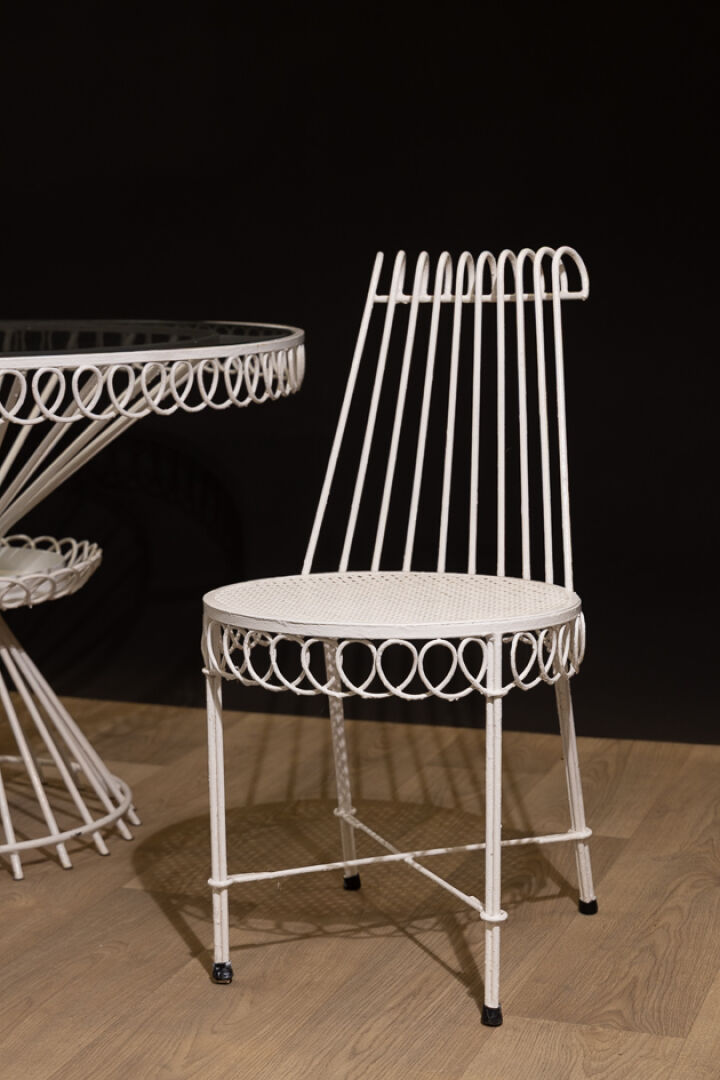 Mathieu MATEGOT (1910-2001). Mobilier de jardin re-laqué blanc modèle " Cap d'ail", les ceintures à entrelacs comprenant : - Table à plateau circulaire en verre, le pied faisceau à corbeille d'entretoise médiane. Haut. : 71 cm - Diam. : 102 cm - Paire de chaises à dossier légèrement renversé, ajouré, l'assise perforée de motifs quartefeuille, les pieds entretoisés. Haut. : 83 cm - Larg. : 43.5 cm - Prof. : 57 cm (plateau mal ajusté probablement rapporté, rayures d'usage, traces de couleurs, état d'usage). Modèle créé en 1950. On joint : Étiquette Galerie CADET-ROUSSELLE à Nantes - annotée " Acompte de frs 50 000 sur 1 table Cap d'Ail à 48 500 et 2 chaises à 20 500 pièce" datée 7 janvier 1959. Bibliographie : - Patrick Favardin, "Mathieu Matégot", Paris 2014 p. 54 ; - Philippe. Jousse et Caroline Mondineu "Mathieu Matégot", p. 218, planche 30 ;