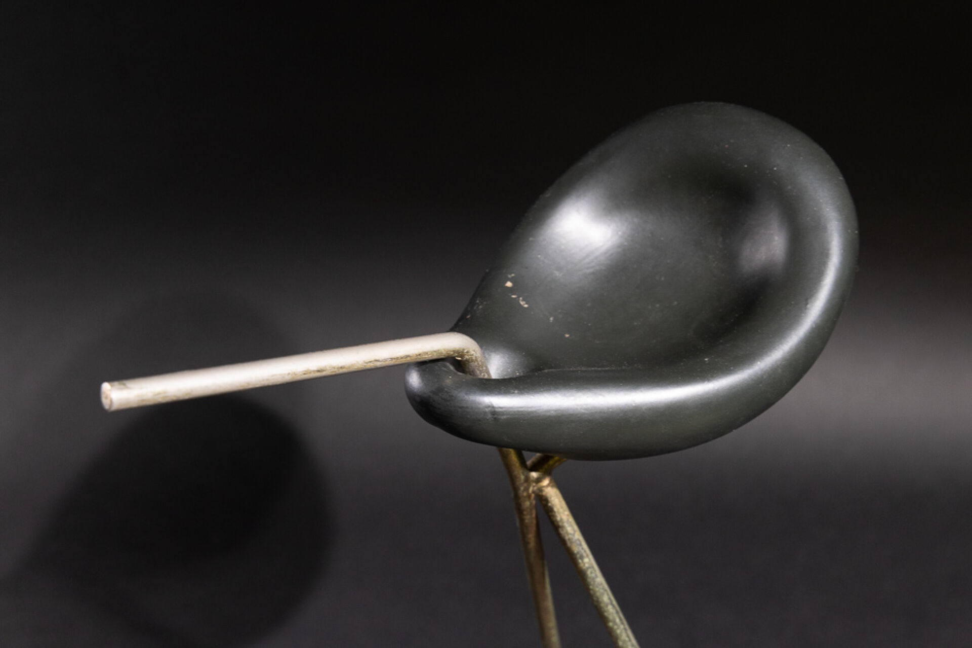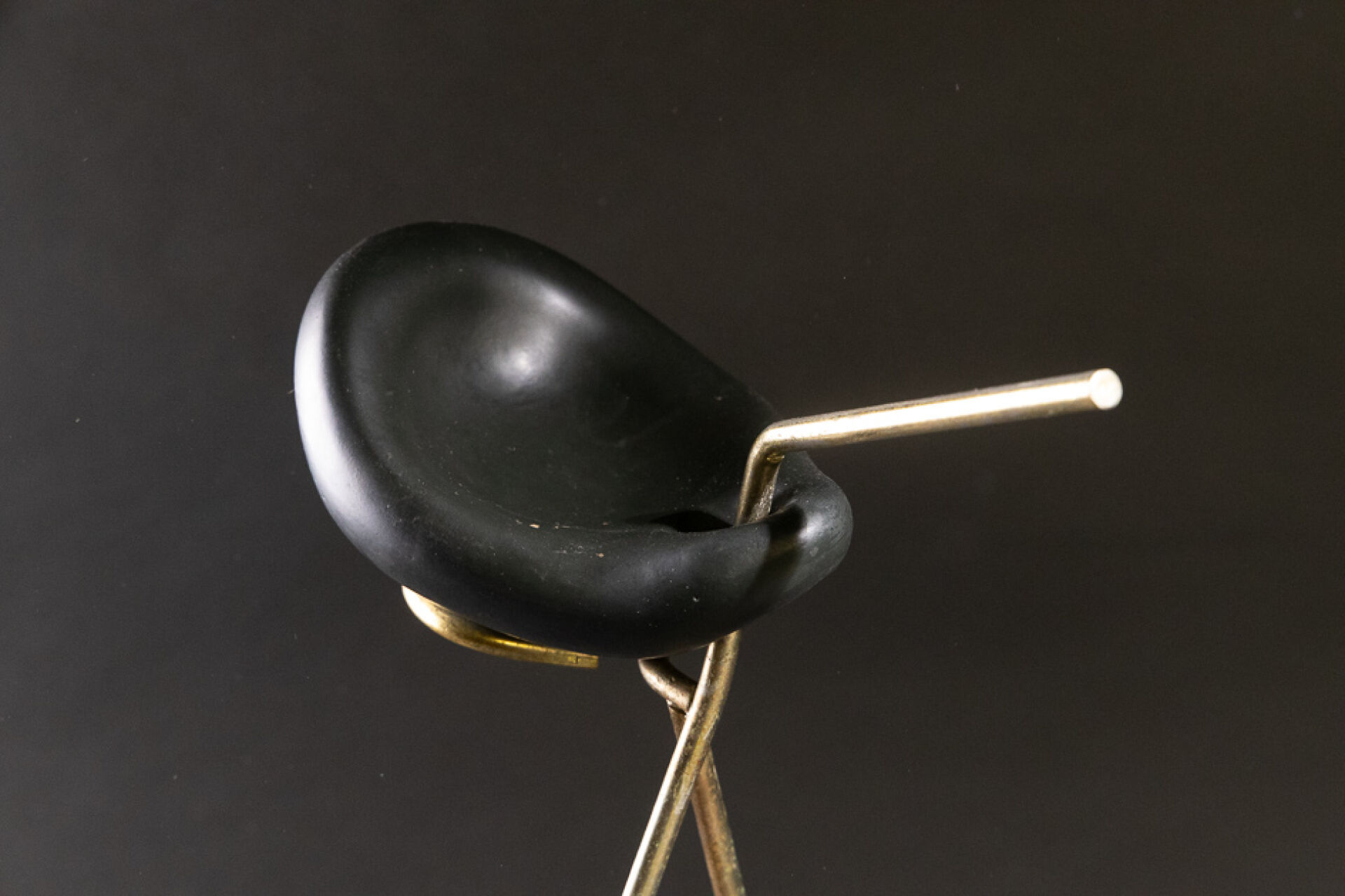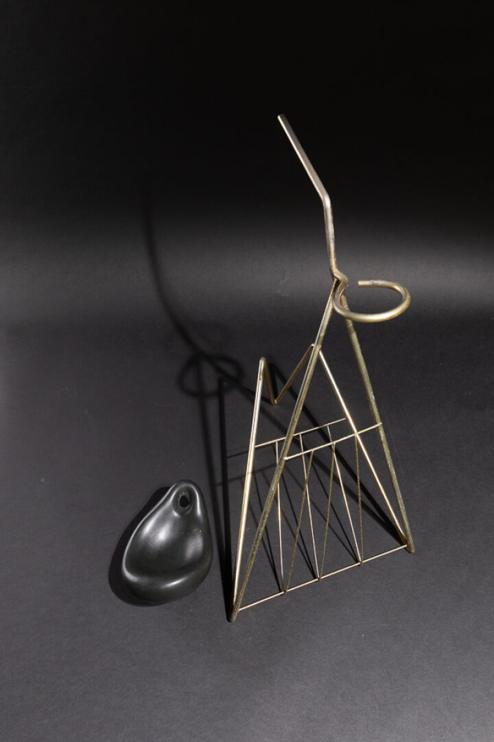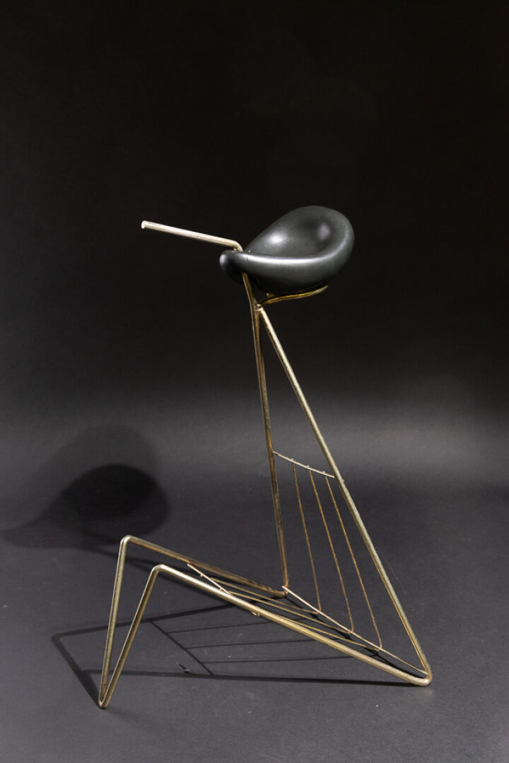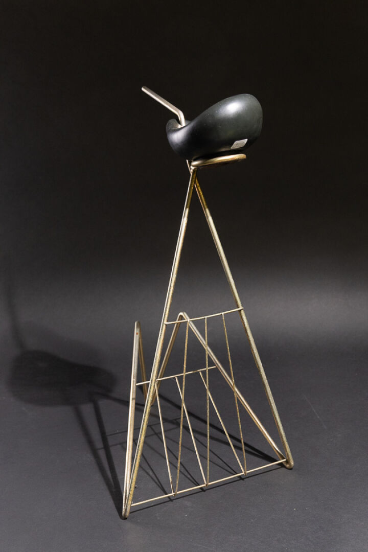 Dans le goût de Marcel ASSELBUR. Cendrier porte-revues, la structure en métal patiné doré (usures, piqûres), le cendrier en faïence émaillée noire de forme libre. Vers 1950. Haut. : 55.5 cm - Larg. : 37 cm - Prof. : 29 cm Expertise réalisée par Emmanuel EYRAUD