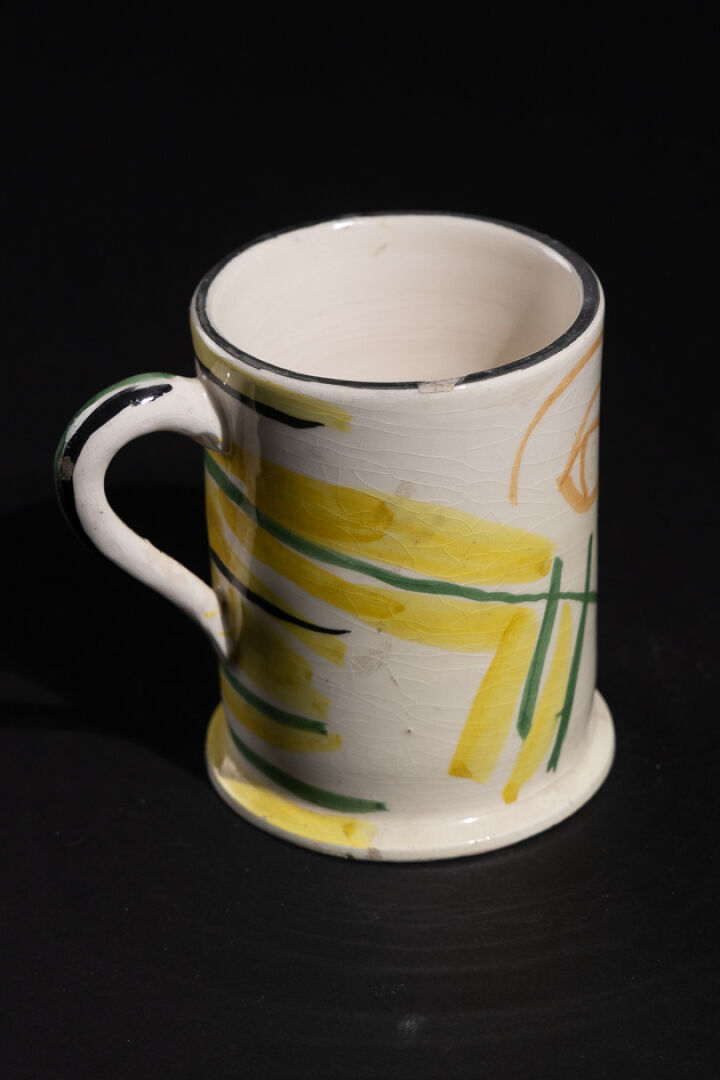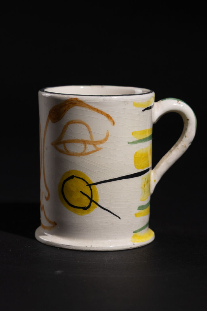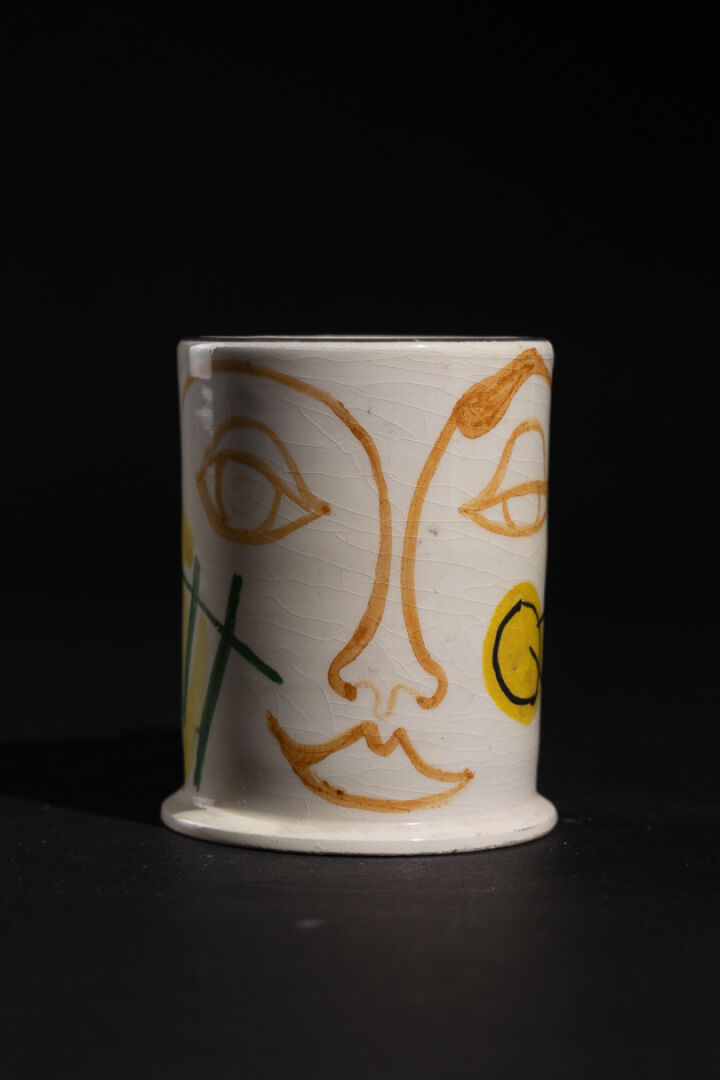 Mug en faïence à décor de visage dans les tons ocre, noir, jaune et vert. Signé GIUBALI-Capri-1955 (éclat à la lèvre). Vers 1950. Haut. : 11 cm