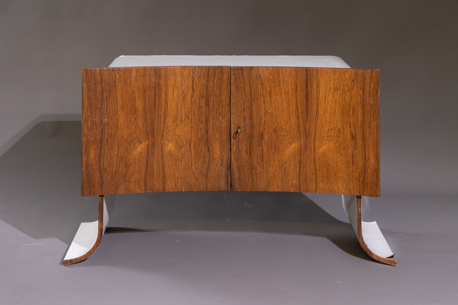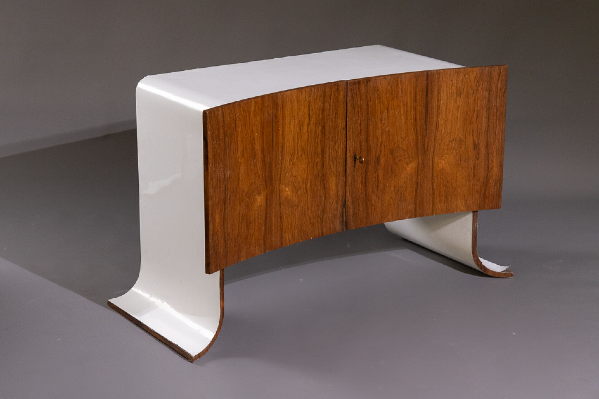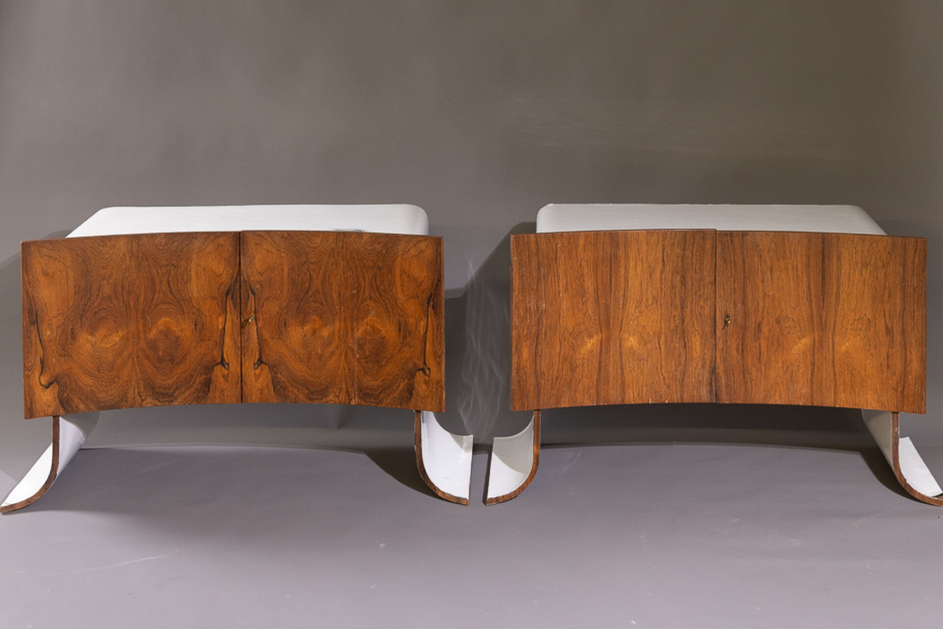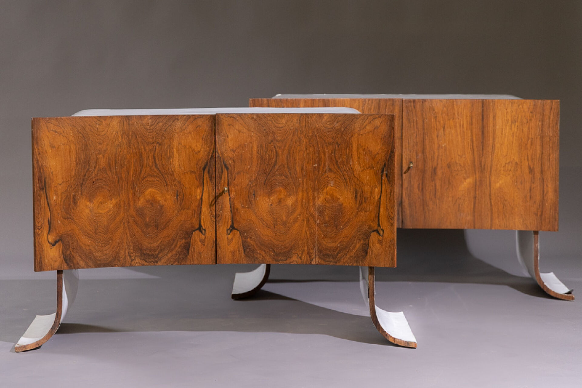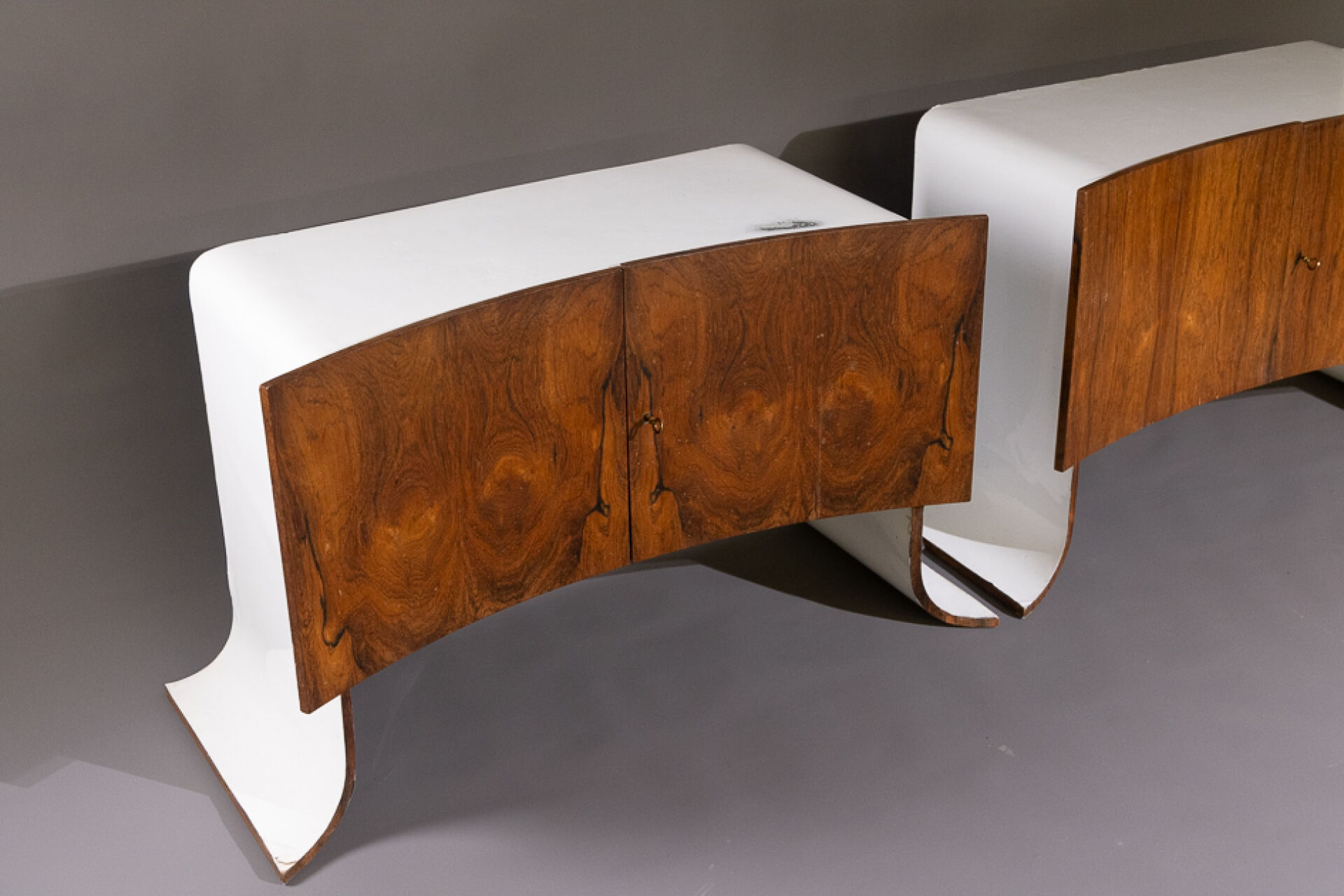 Maison Yvonnick RUAL Paire de meubles bas en formica et palissandre ouvrant à deux vantaux incurvés, piètement pagode (accidents, insolation, soulèvements). Vers 1970. Haut. : 63 cm - Larg. : 108.5 cm - Prof. : 48.5 cm Provenance : Succession de Monsieur Yvonnick RUAL puis par descendance. "Je ne fais pas de meubles mais des structures de rangement conçues comme des sculptures" C'est ainsi qu'Yvonnick Rual voyait son travail. Pour cet ébéniste issu d'une grande lignée le travail du bois n'avait pas de secret après sa formation aux Beaux-Arts de Rennes, Nantes, Paris. Tantôt traditionnel sublimant le bois, tantôt très contemporain mélangeant le formica, le verre fumé ou l'aluminium Yvonnick Rual créé des meubles uniques si bien que Ouest France évoquait l'artisan comme le seul "créateur(s) inventeur(s)de formes vraiment inédites dans le domaine de l'ébénisterie "de Bretagne. Installé rue de la Motte Chancelier à Rennes il expose ses œuvres accompagnées de paysages de Pierre Gilles.