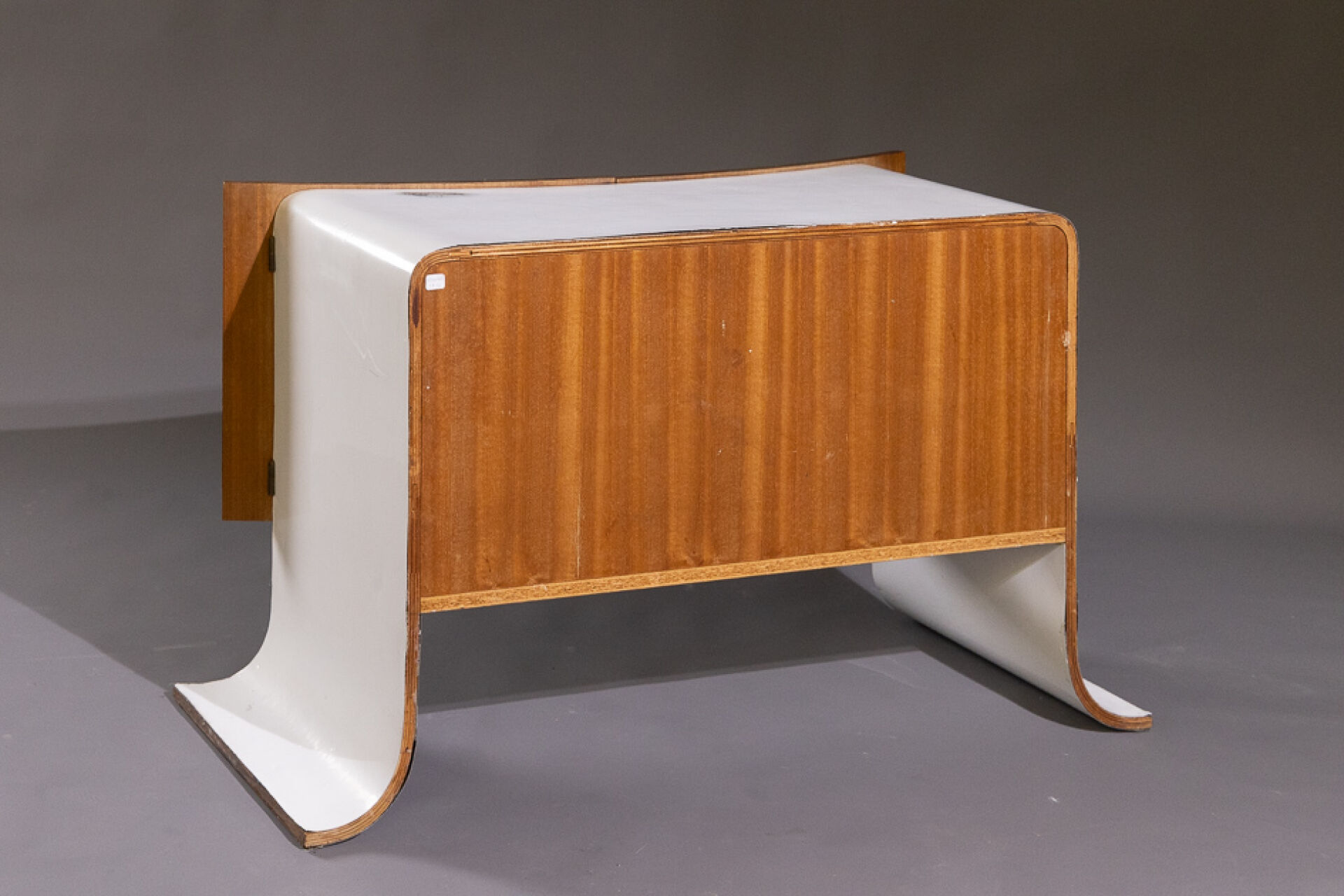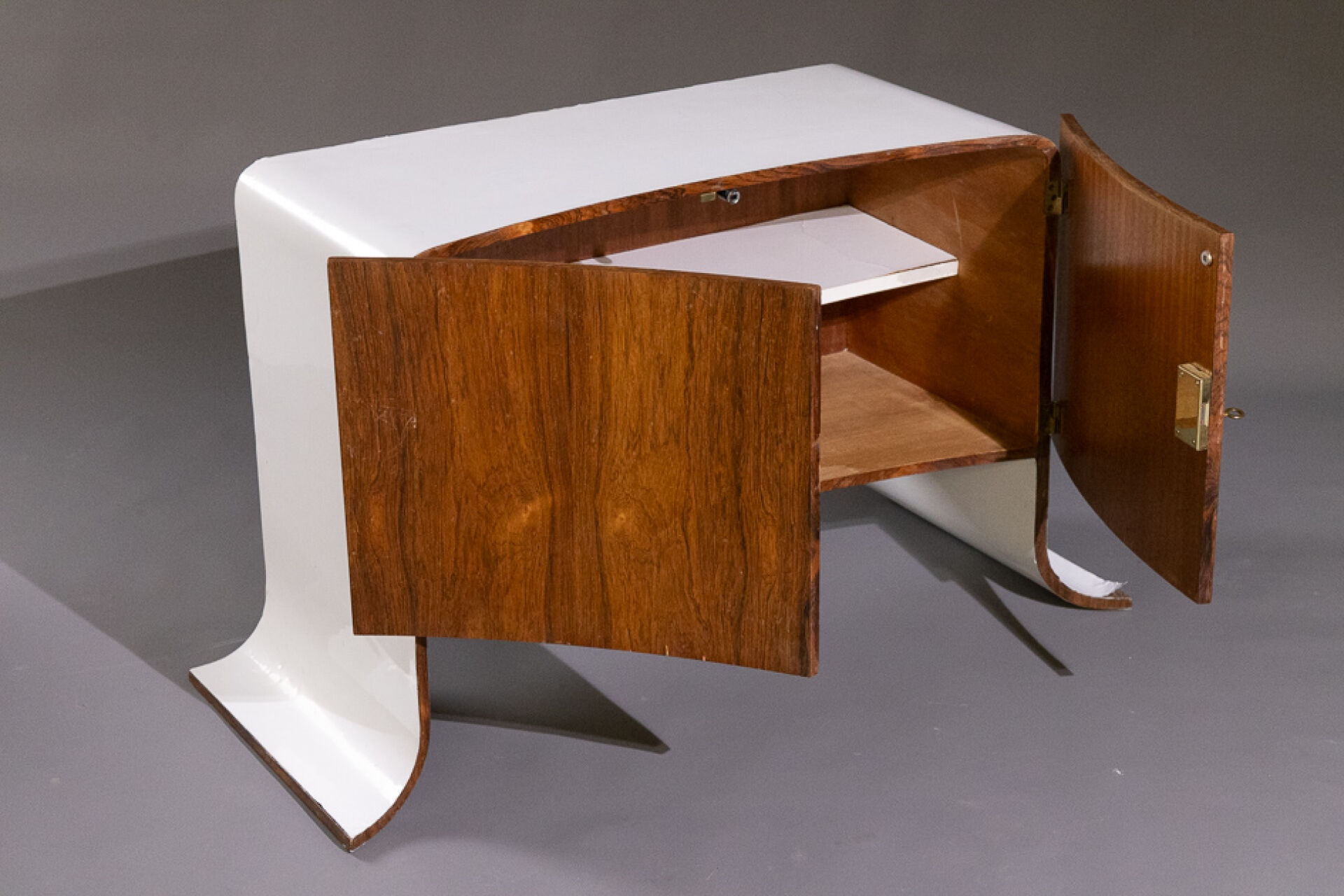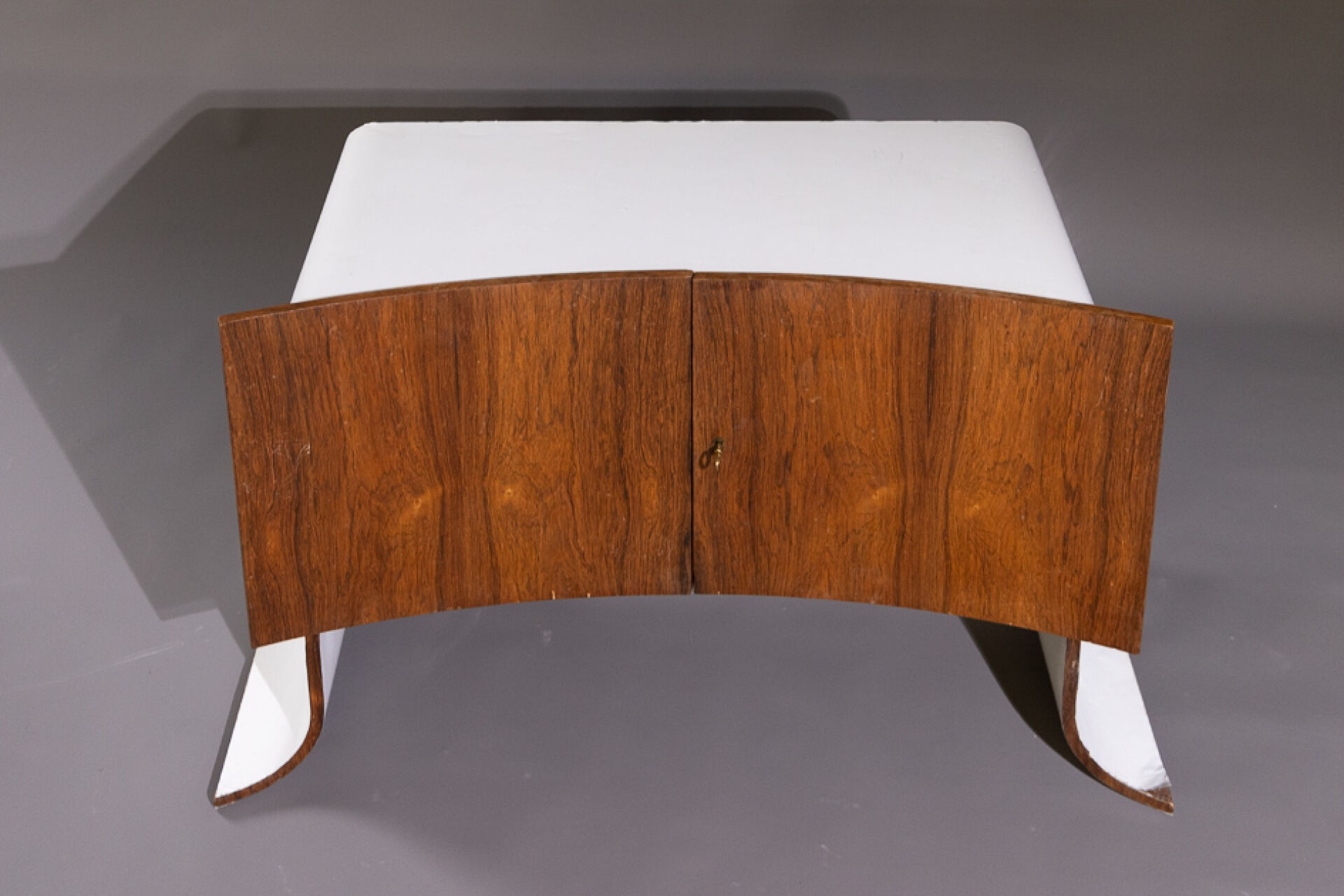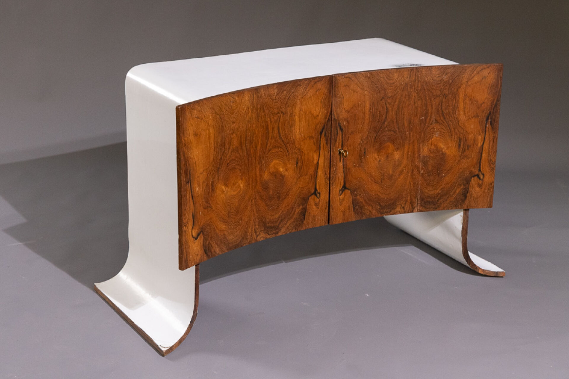 Maison Yvonnick RUAL Paire de meubles bas en formica et palissandre ouvrant à deux vantaux incurvés, piètement pagode (accidents, insolation, soulèvements). Vers 1970. Haut. : 63 cm - Larg. : 108.5 cm - Prof. : 48.5 cm Provenance : Succession de Monsieur Yvonnick RUAL puis par descendance. "Je ne fais pas de meubles mais des structures de rangement conçues comme des sculptures" C'est ainsi qu'Yvonnick Rual voyait son travail. Pour cet ébéniste issu d'une grande lignée le travail du bois n'avait pas de secret après sa formation aux Beaux-Arts de Rennes, Nantes, Paris. Tantôt traditionnel sublimant le bois, tantôt très contemporain mélangeant le formica, le verre fumé ou l'aluminium Yvonnick Rual créé des meubles uniques si bien que Ouest France évoquait l'artisan comme le seul "créateur(s) inventeur(s)de formes vraiment inédites dans le domaine de l'ébénisterie "de Bretagne. Installé rue de la Motte Chancelier à Rennes il expose ses œuvres accompagnées de paysages de Pierre Gilles.