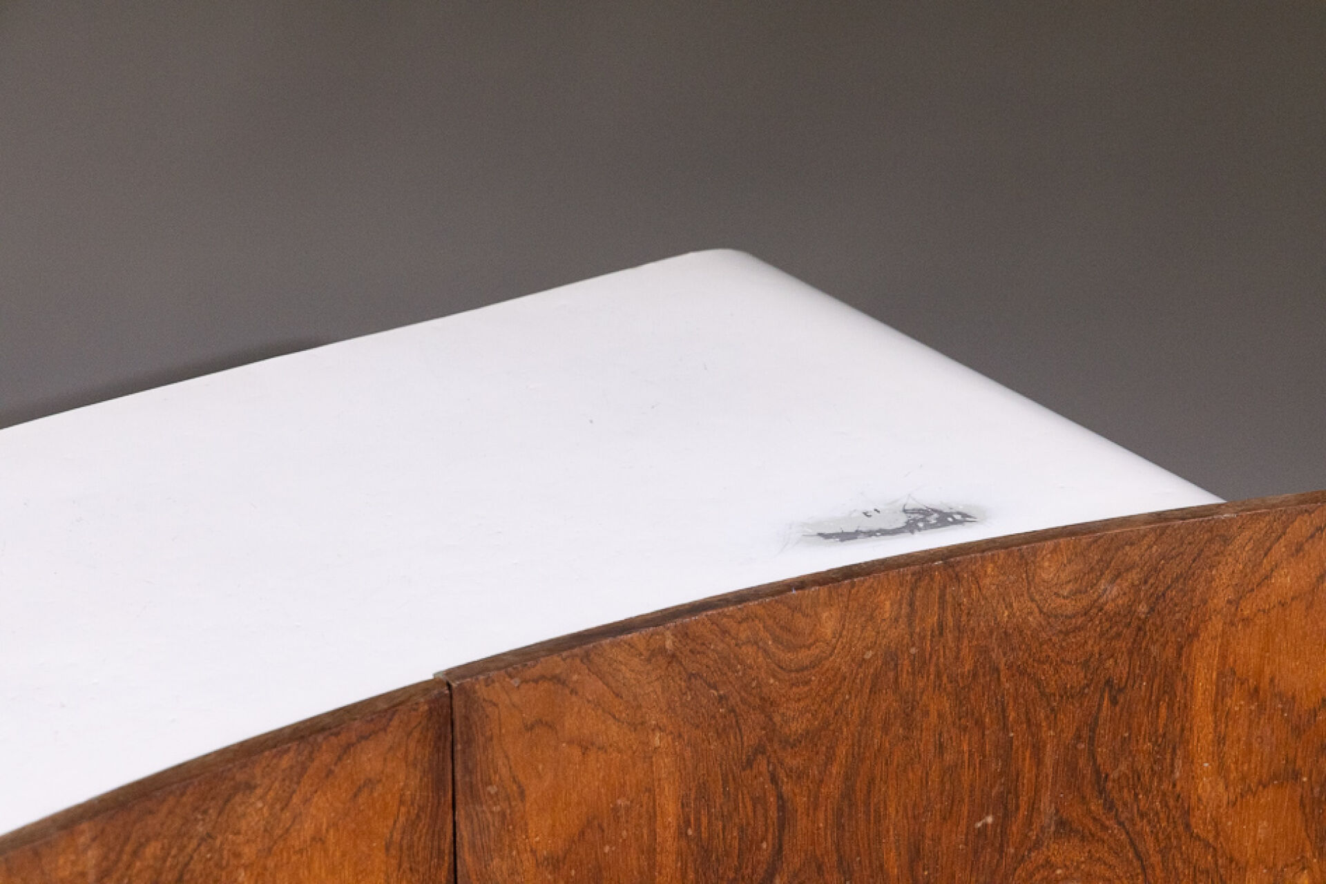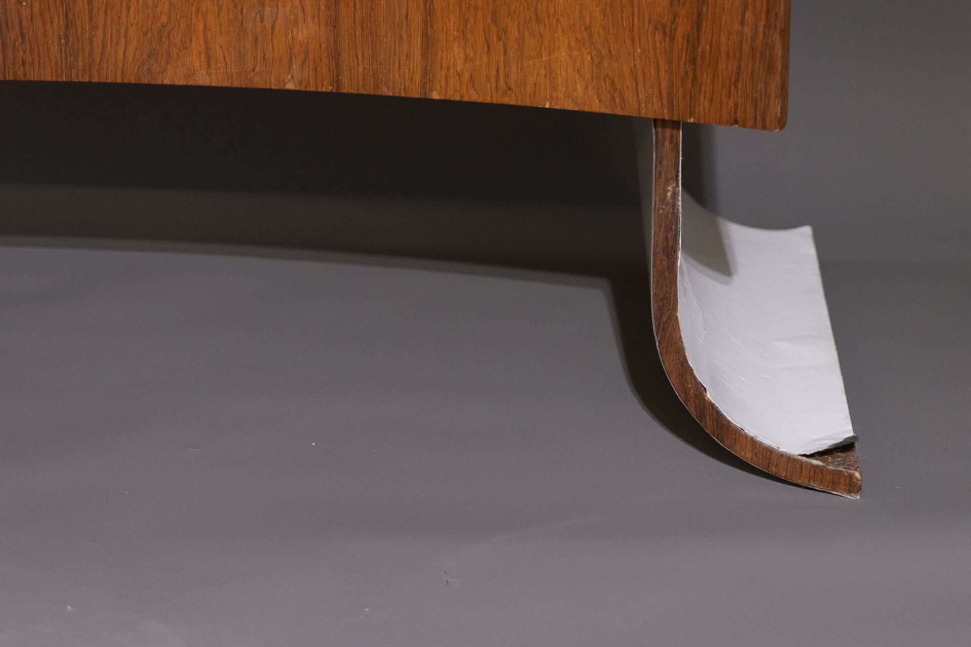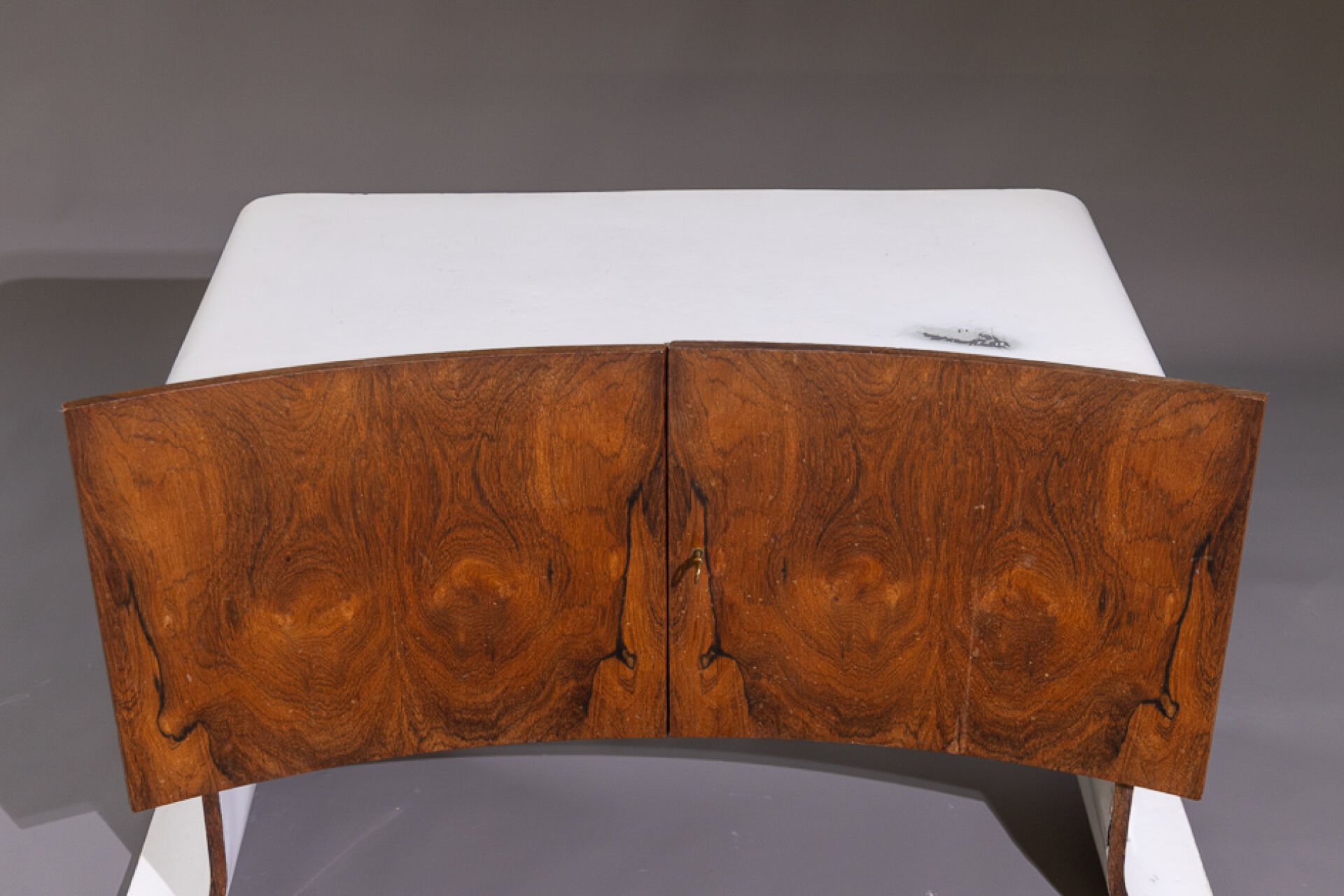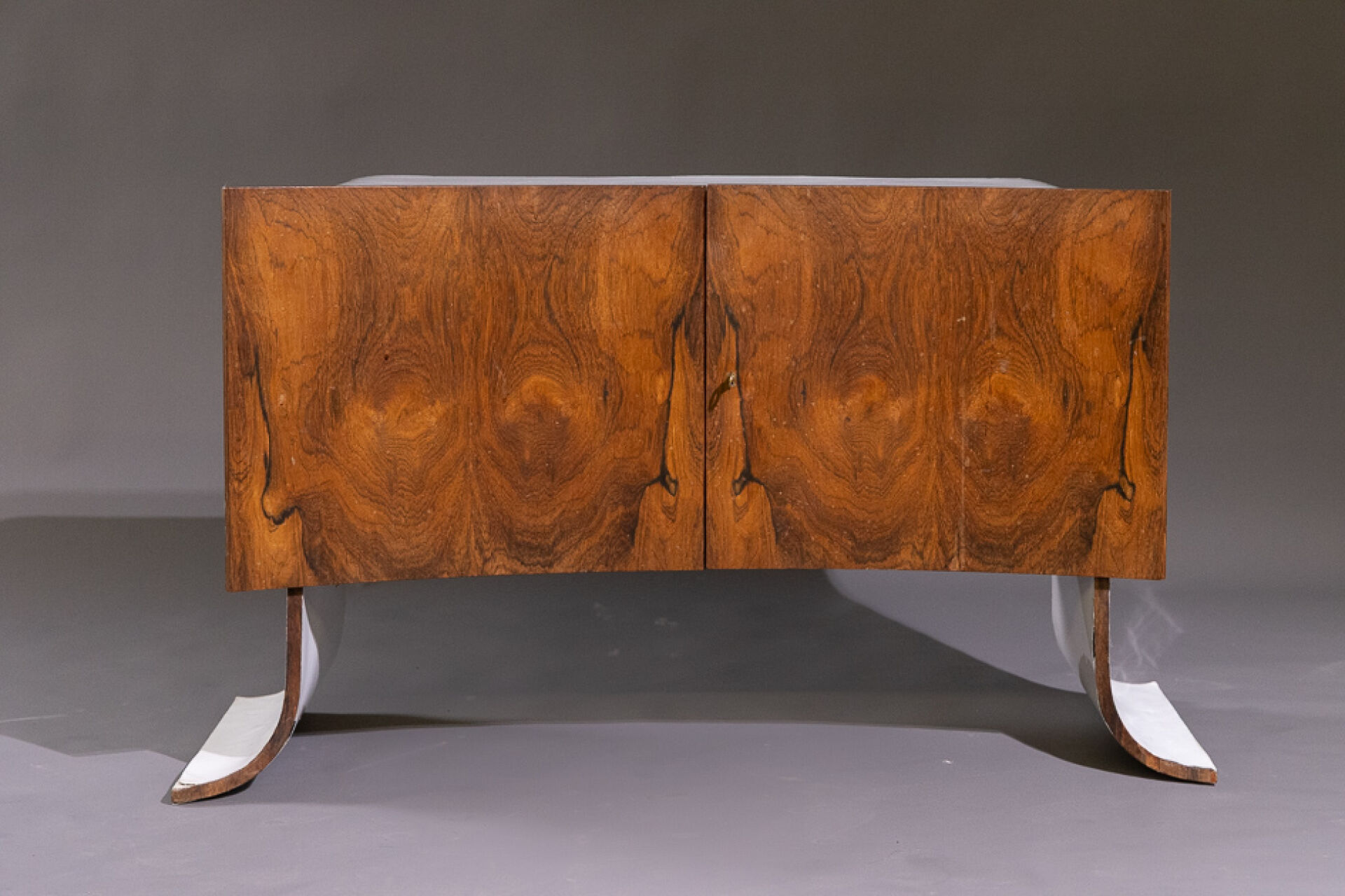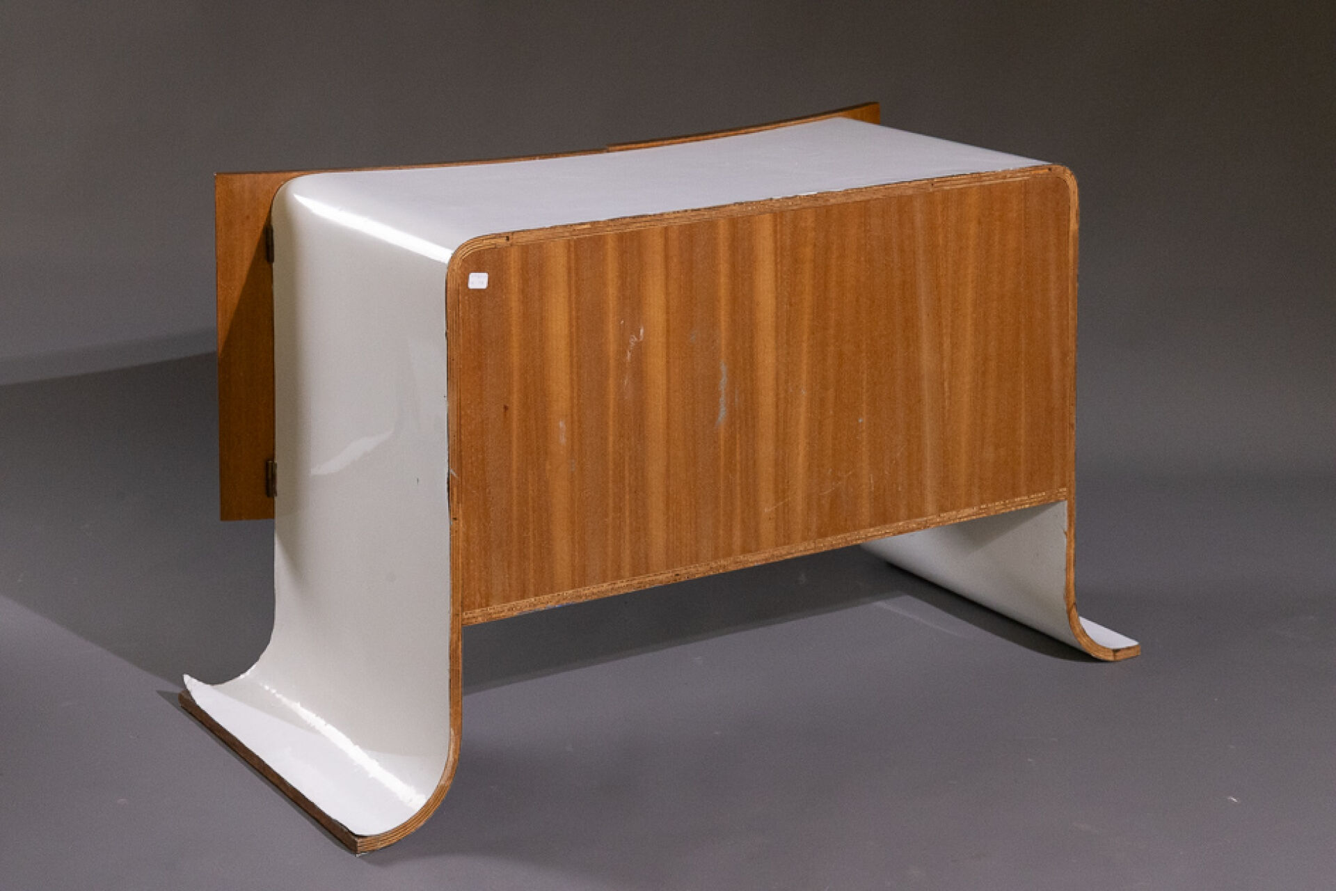 Maison Yvonnick RUAL Paire de meubles bas en formica et palissandre ouvrant à deux vantaux incurvés, piètement pagode (accidents, insolation, soulèvements). Vers 1970. Haut. : 63 cm - Larg. : 108.5 cm - Prof. : 48.5 cm Provenance : Succession de Monsieur Yvonnick RUAL puis par descendance. "Je ne fais pas de meubles mais des structures de rangement conçues comme des sculptures" C'est ainsi qu'Yvonnick Rual voyait son travail. Pour cet ébéniste issu d'une grande lignée le travail du bois n'avait pas de secret après sa formation aux Beaux-Arts de Rennes, Nantes, Paris. Tantôt traditionnel sublimant le bois, tantôt très contemporain mélangeant le formica, le verre fumé ou l'aluminium Yvonnick Rual créé des meubles uniques si bien que Ouest France évoquait l'artisan comme le seul "créateur(s) inventeur(s)de formes vraiment inédites dans le domaine de l'ébénisterie "de Bretagne. Installé rue de la Motte Chancelier à Rennes il expose ses œuvres accompagnées de paysages de Pierre Gilles.