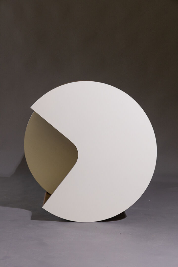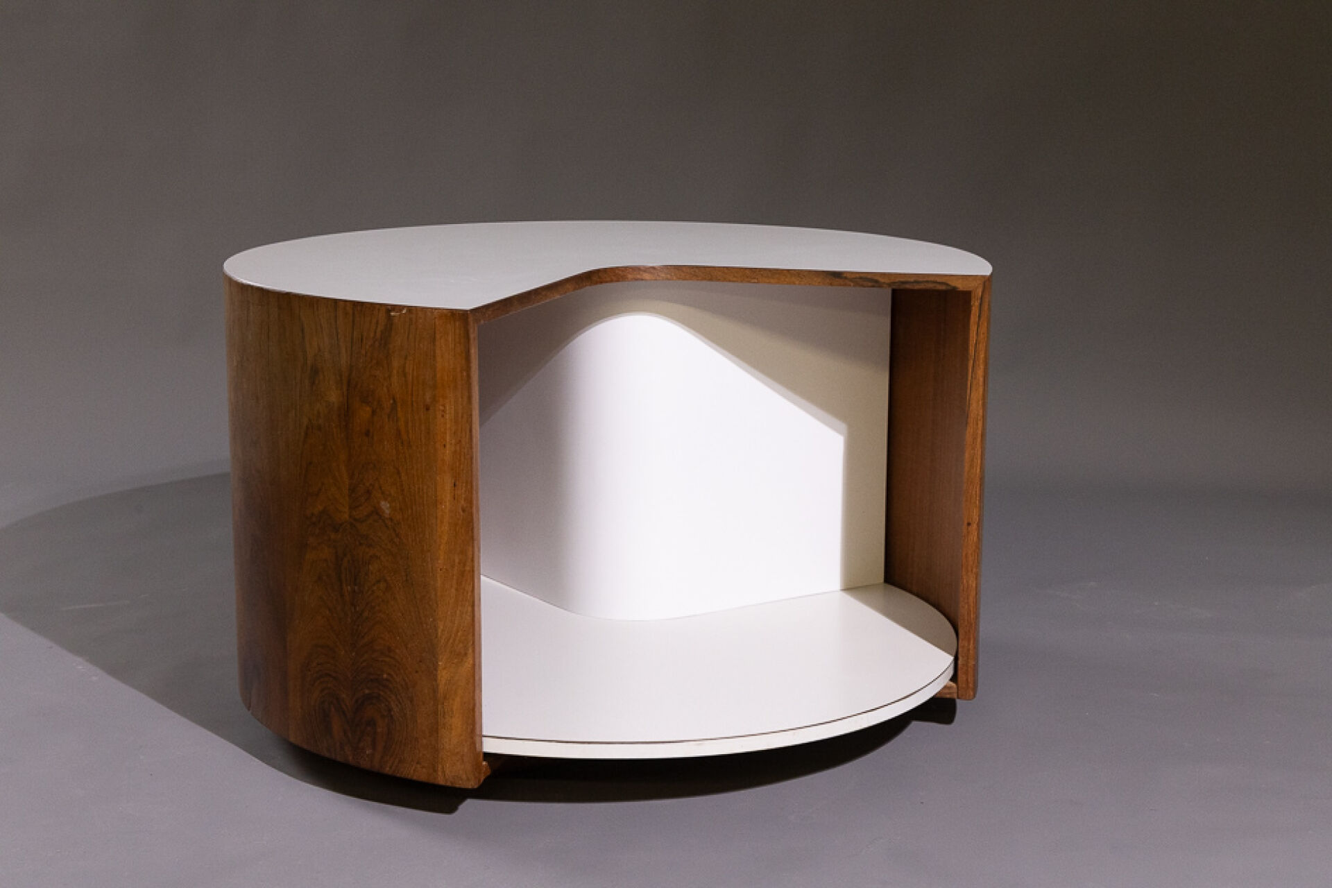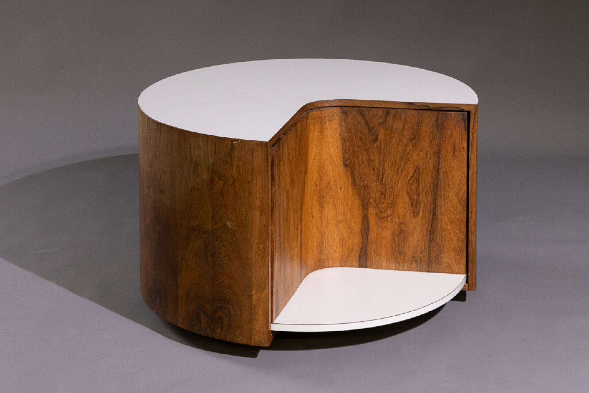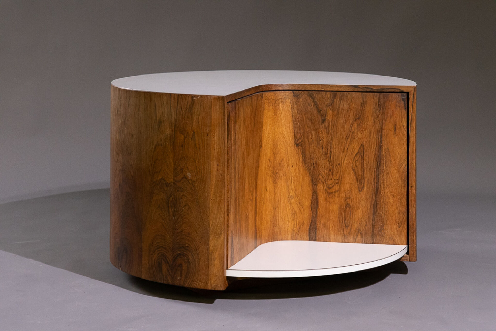 Maison Yvonnick RUAL Guéridon circulaire 3/4 en palissandre et formica blanc à compartiment tournant (insolation et petits accidents d'usage). Vers 1970. Haut. : 49.5 cm - Larg. : 80 cm Provenance : Succession de Monsieur Yvonnick RUAL puis par descendance. "Je ne fais pas de meubles mais des structures de rangement conçues comme des sculptures" C'est ainsi qu'Yvonnick Rual voyait son travail. Pour cet ébéniste issu d'une grande lignée le travail du bois n'avait pas de secret après sa formation aux Beaux-Arts de Rennes, Nantes, Paris. Tantôt traditionnel sublimant le bois, tantôt très contemporain mélangeant le formica, le verre fumé ou l'aluminium Yvonnick Rual créé des meubles uniques si bien que Ouest France évoquait l'artisan comme le seul "créateur(s) inventeur(s)de formes vraiment inédites dans le domaine de l'ébénisterie "de Bretagne. Installé rue de la Motte Chancelier à Rennes il expose ses œuvres accompagnées de paysages de Pierre Gilles.