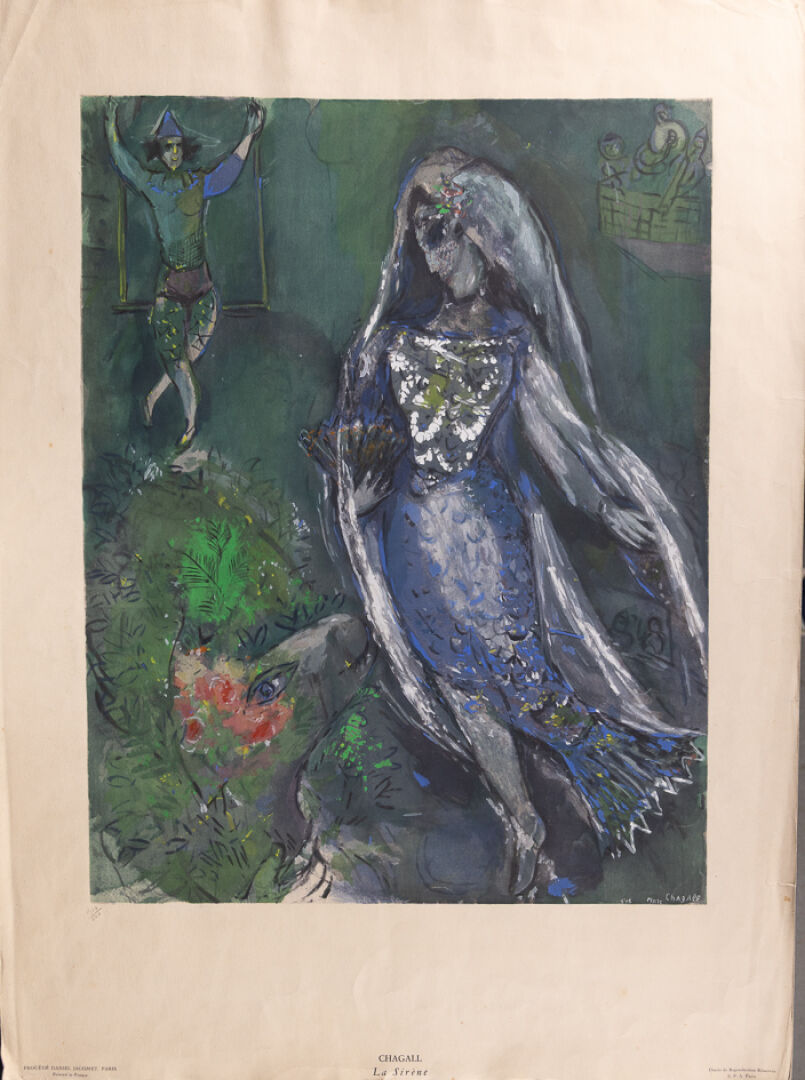 D'après Marc CHAGALL (1897-1985). "La Sirène". Procédé Jacomet numéroté 410/500 en bas à gauche, annotations en bas (pliures, déchirures dans les bordures. Dim. du sujet : Haut. : 55.5 cm - Larg. : 43 cm