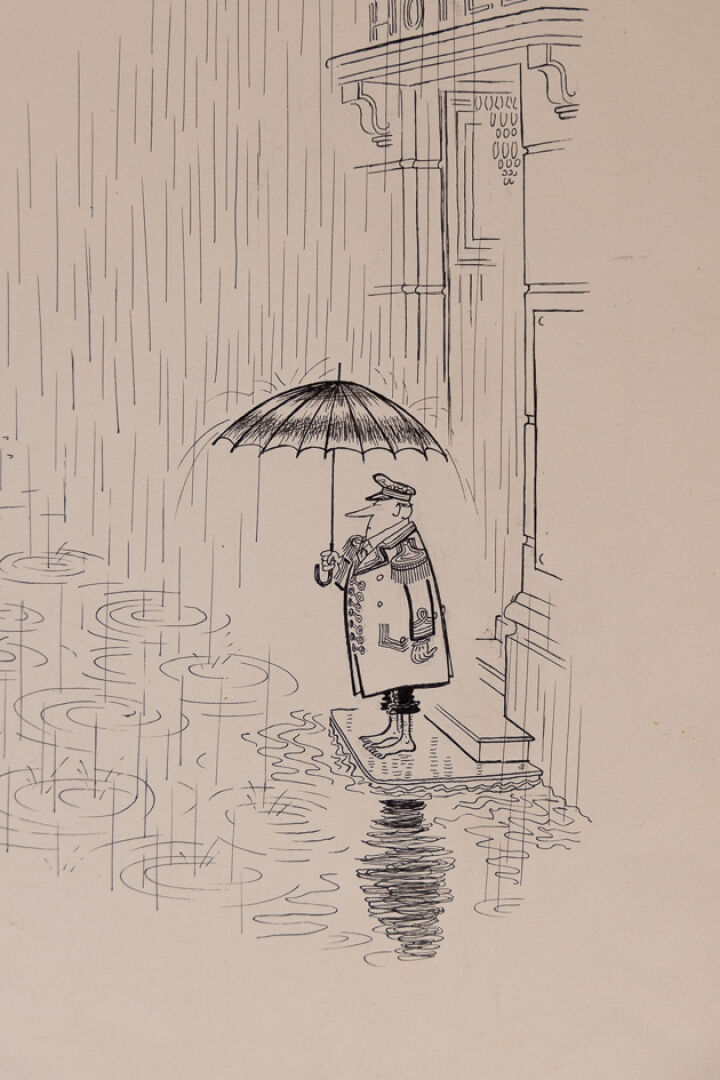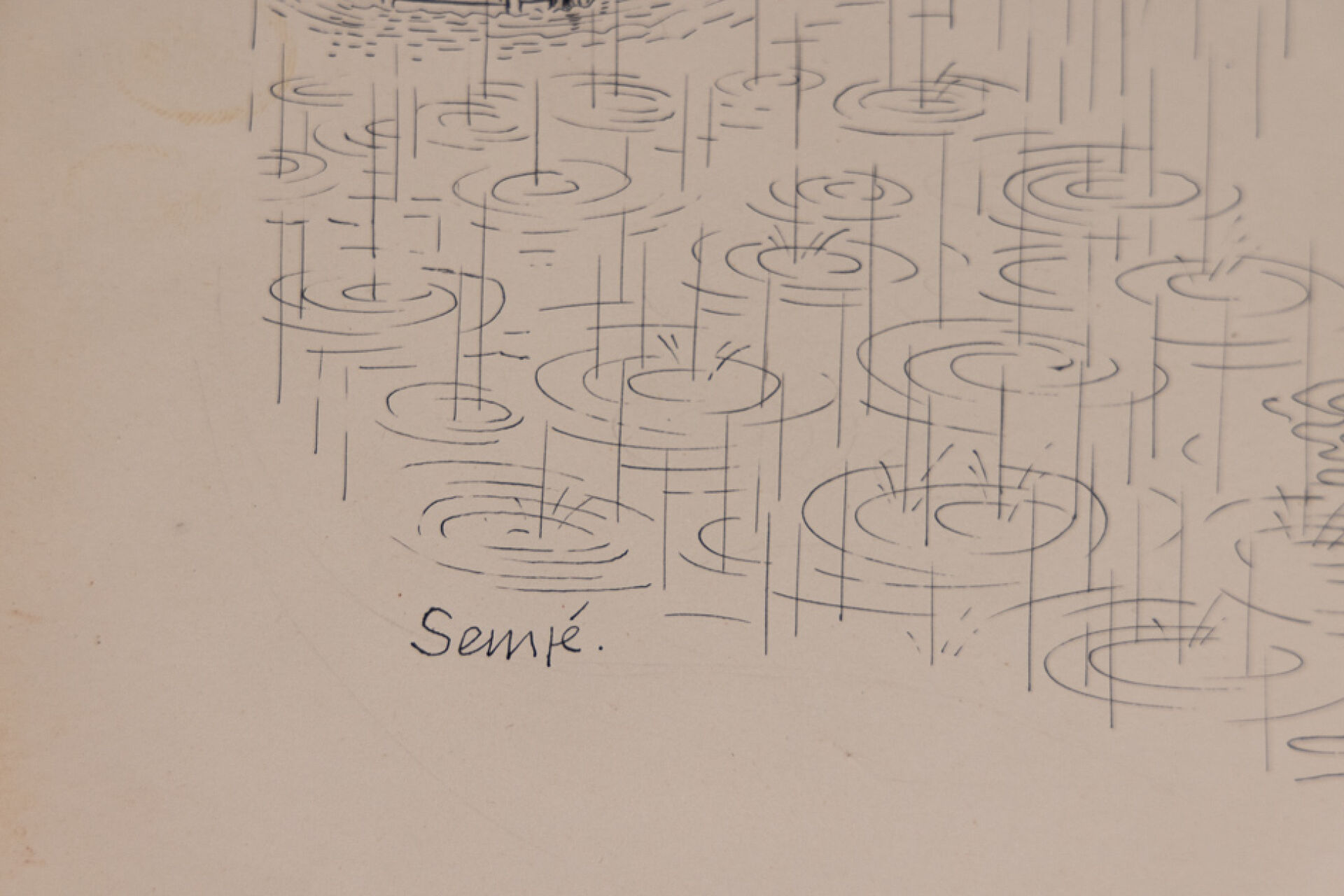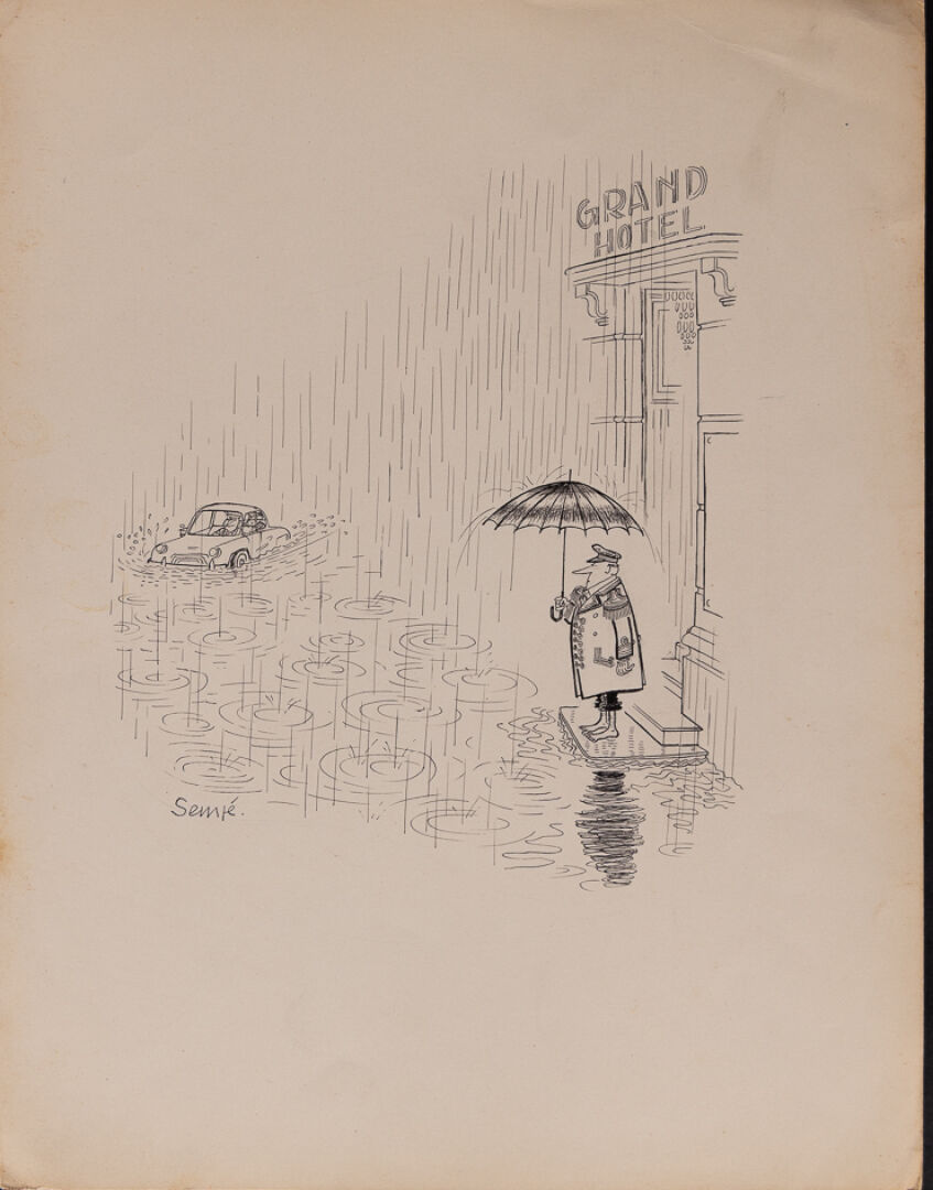 Jean-Jacques SEMPE (1932-2022). Le grand hôtel. Encre de Chine signée en bas à gauche (papier insolé, taches, pliures). Haut. : 32,2 cm - Larg. : 25 cm Jean-Jacques Sempé (1932-2022) est un dessinateur de presse et illustrateur français. Actif dès les années 1950, il publie dans Paris Match, Le Nouvel Observateur, L'Express et The New Yorker. En 1959, il crée avec René Goscinny Le Petit Nicolas. Expertise réalisée par Irénée BRUN - Cabinet PERAZONNE BRUN