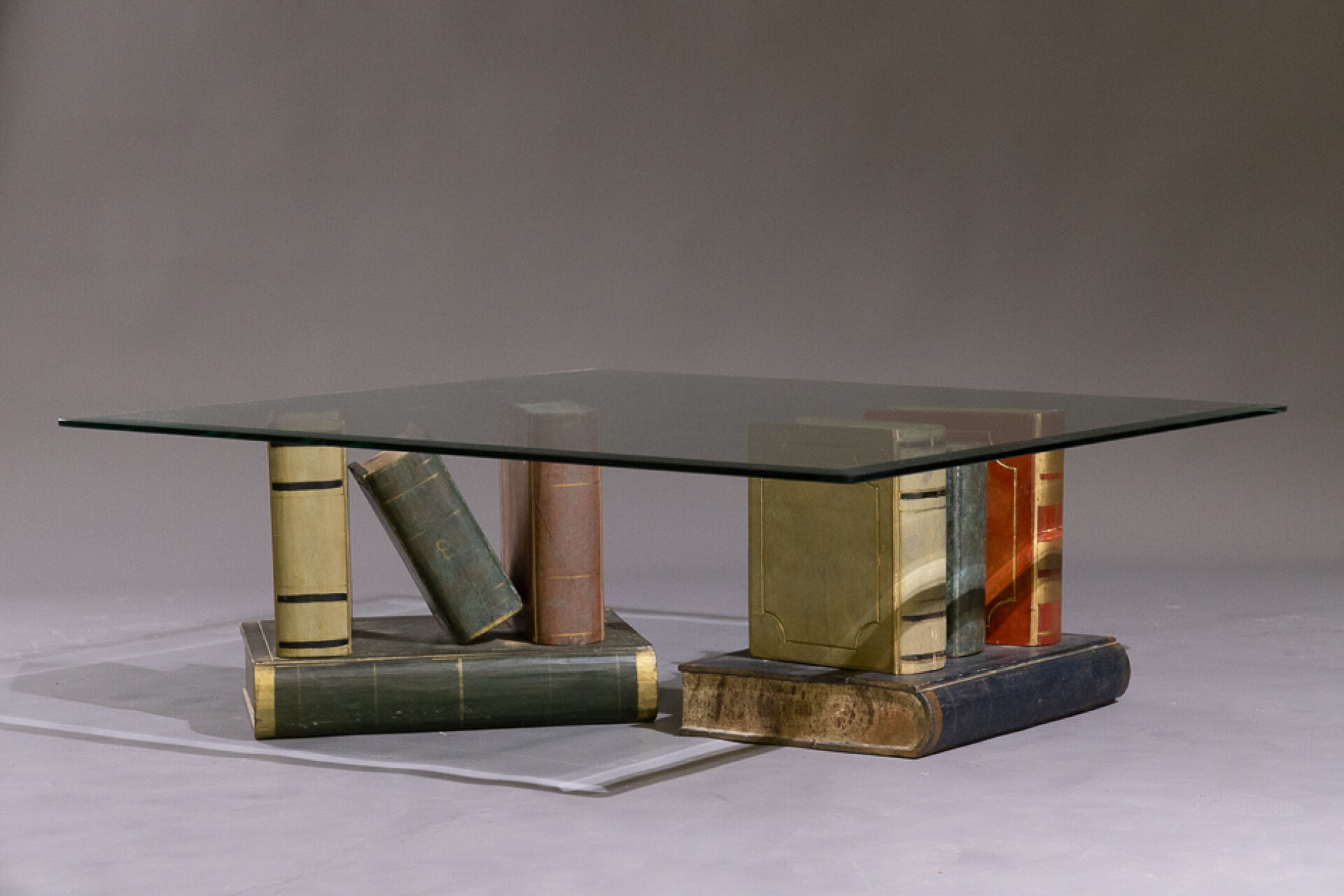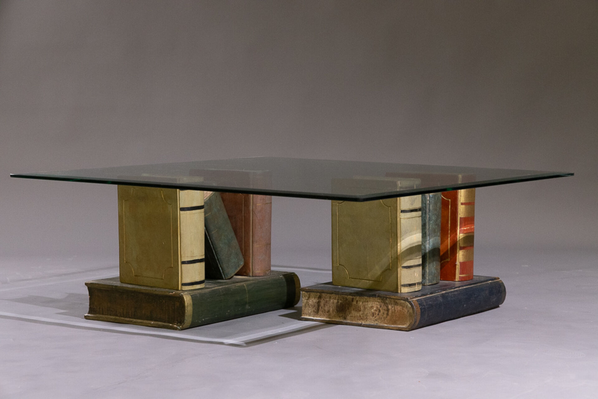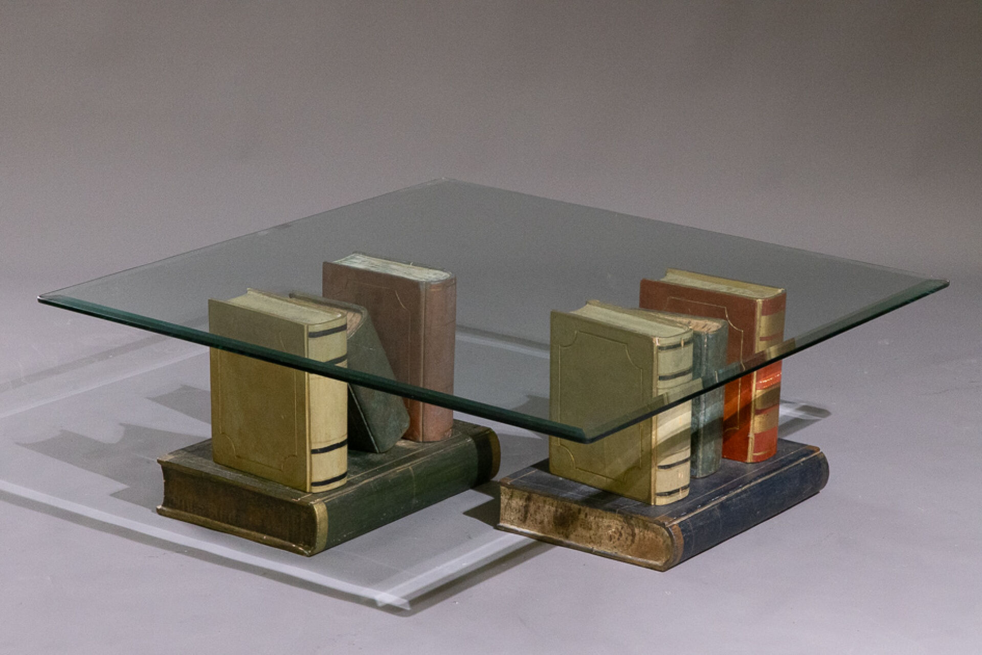 Table basse à plateau biseauté de verre carré soutenu par deux socles en bois peint imitant des empilements de livres (état d'usage). Vers 1990. Haut. : 34 cm - Côté : 100 cm