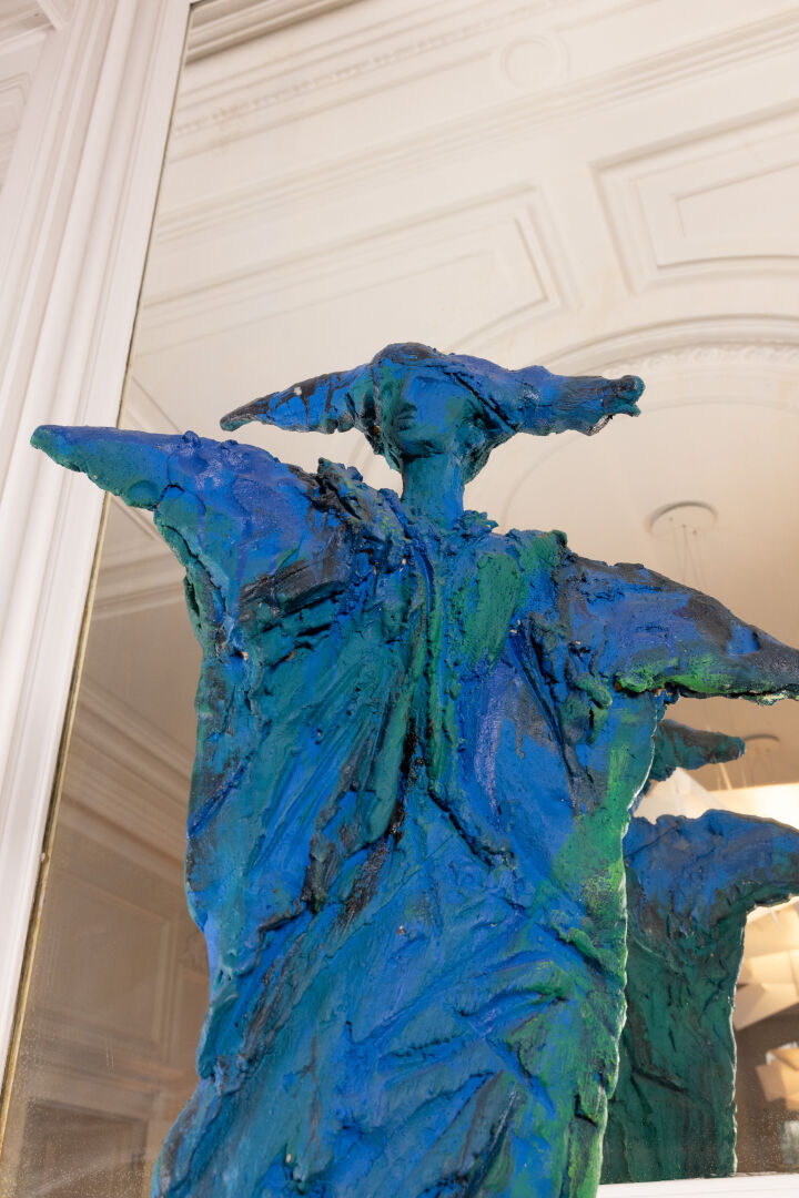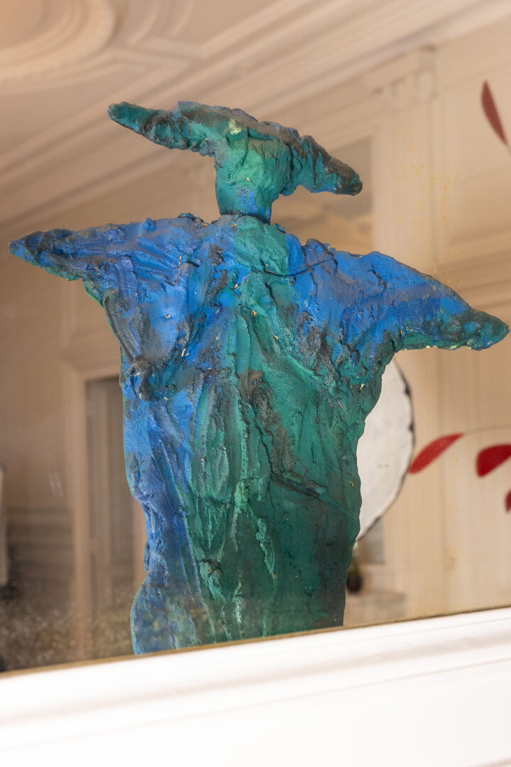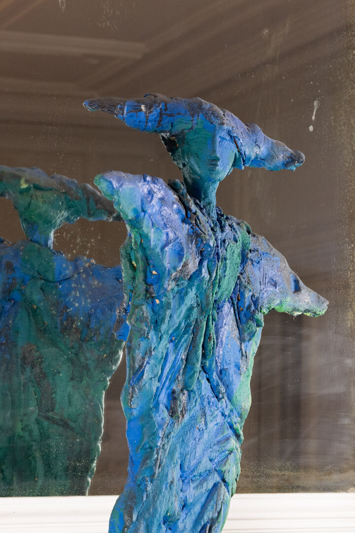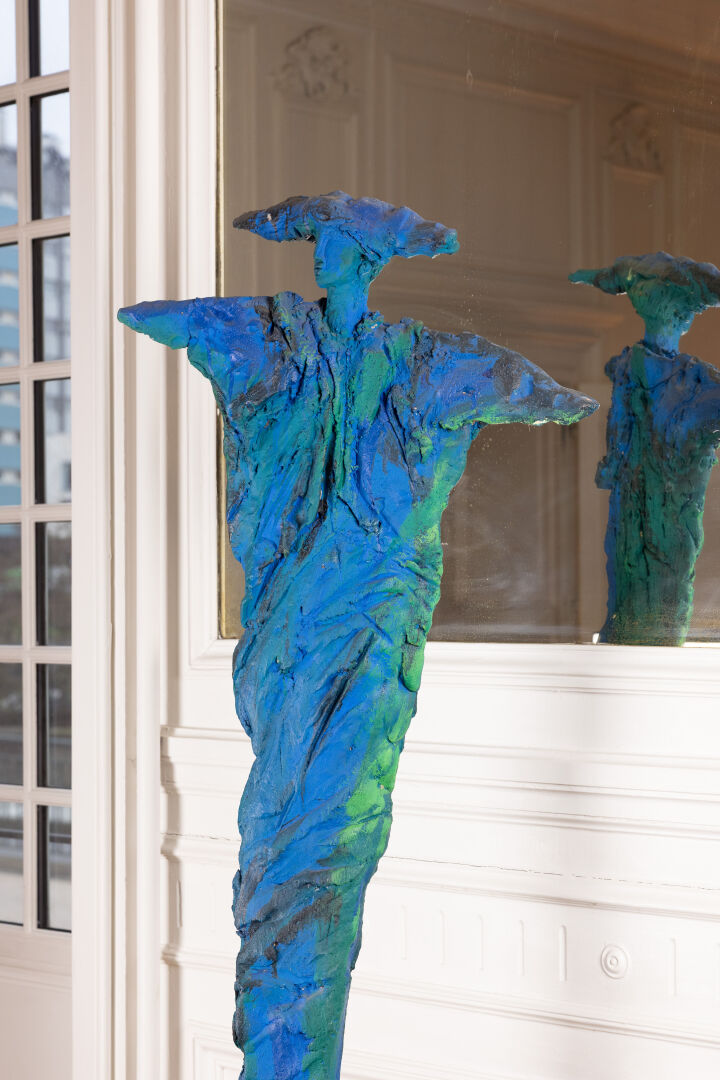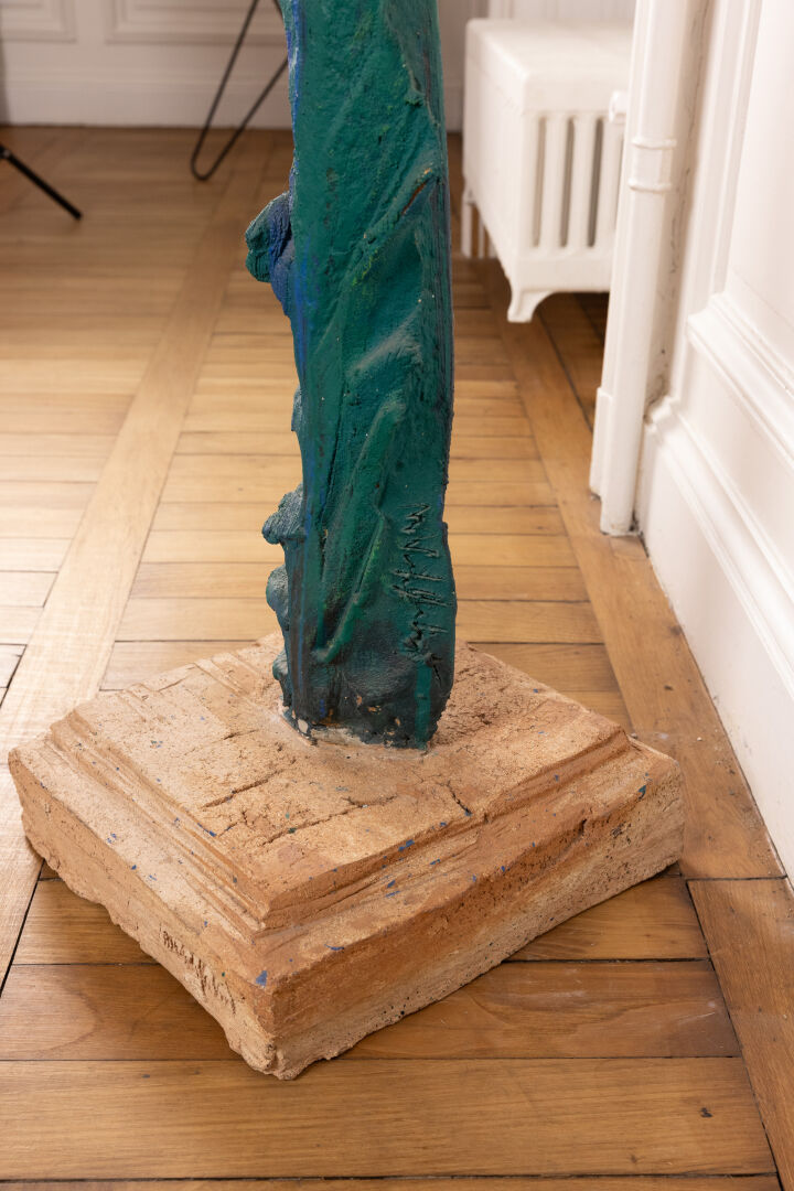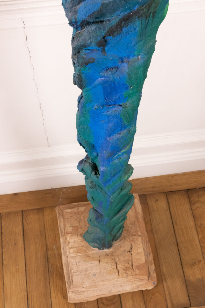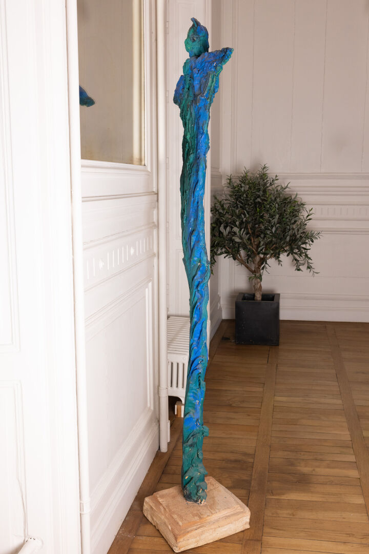 Michel WOHLFAHRT (né en 1949). Femme. Sculpture en terre cuite dans les tons bleu et vert, présentée sur socle (petits éclats). Signée sur le socle. Haut. : 213 cm - Larg. : 58 cm